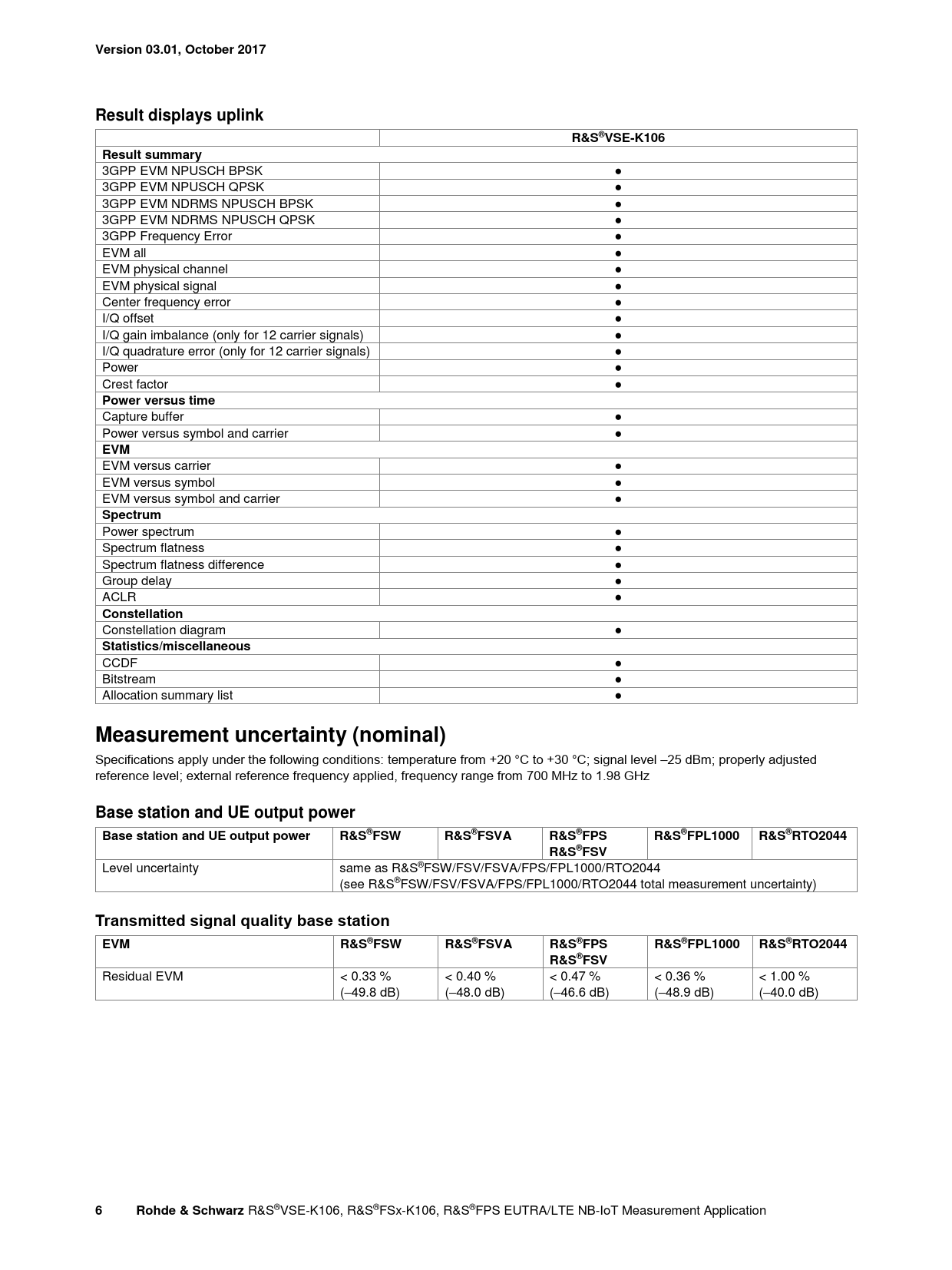 Version 03.01, October 2017Result displays uplinkR&S®VSE-K106Result summary 3GPP EVM NPUSCH BPSK ● 3GPP EVM NPUSCH QPSK ● 3GPP EVM NDRMS NPUSCH BPSK ● 3GPP EVM NDRMS NPUSCH QPSK ● 3GPP Frequency Error ● EVM all ● EVM physical channel ● EVM physical signal ● Center frequency error ● I/Q offset ● I/Q gain imbalance (only for 12 carrier signals) ● I/Q quadrature error (only for 12 carrier signals) ● Power ● Crest factor ● Power versus time Capture buffer ● Power versus symbol and carrier ●EVM EVM versus carrier ● EVM versus symbol ● EVM versus symbol and carrier ● Spectrum Power spectrum ● Spectrum flatness ● Spectrum flatness difference ● Group delay ● ACLR ● Constellation Constellation diagram ● Statistics/miscellaneous CCDF ● Bitstream ● Allocation summary list ● Measurement uncertainty (nominal) Specifications apply under the following conditions: temperature from +20 °C to +30 °C; signal level –25 dBm; properly adjusted reference level; external reference frequency applied, frequency range from 700 MHz to 1.98 GHz Base station and UE output powerBase station and UE output powerR&S®FSWR&S®FSVAR&S®FPSR&S®FPL1000R&S®RTO2044R&S®FSV Level uncertainty same as R&S®FSW/FSV/FSVA/FPS/FPL1000/RTO2044 (see R&S®FSW/FSV/FSVA/FPS/FPL1000/RTO2044 total measurement uncertainty) Transmitted signal quality base stationEVMR&S®FSWR&S®FSVAR&S®FPSR&S®FPL1000R&S®RTO2044R&S®FSV Residual EVM < 0.33 % < 0.40 % < 0.47 % < 0.36 % < 1.00 % (–49.8 dB) (–48.0 dB) (–46.6 dB) (–48.9 dB) (–40.0 dB) 6Rohde & Schwarz R&S®VSE-K106, R&S®FSx-K106, R&S®FPS EUTRA/LTE NB-IoT Measurement Application