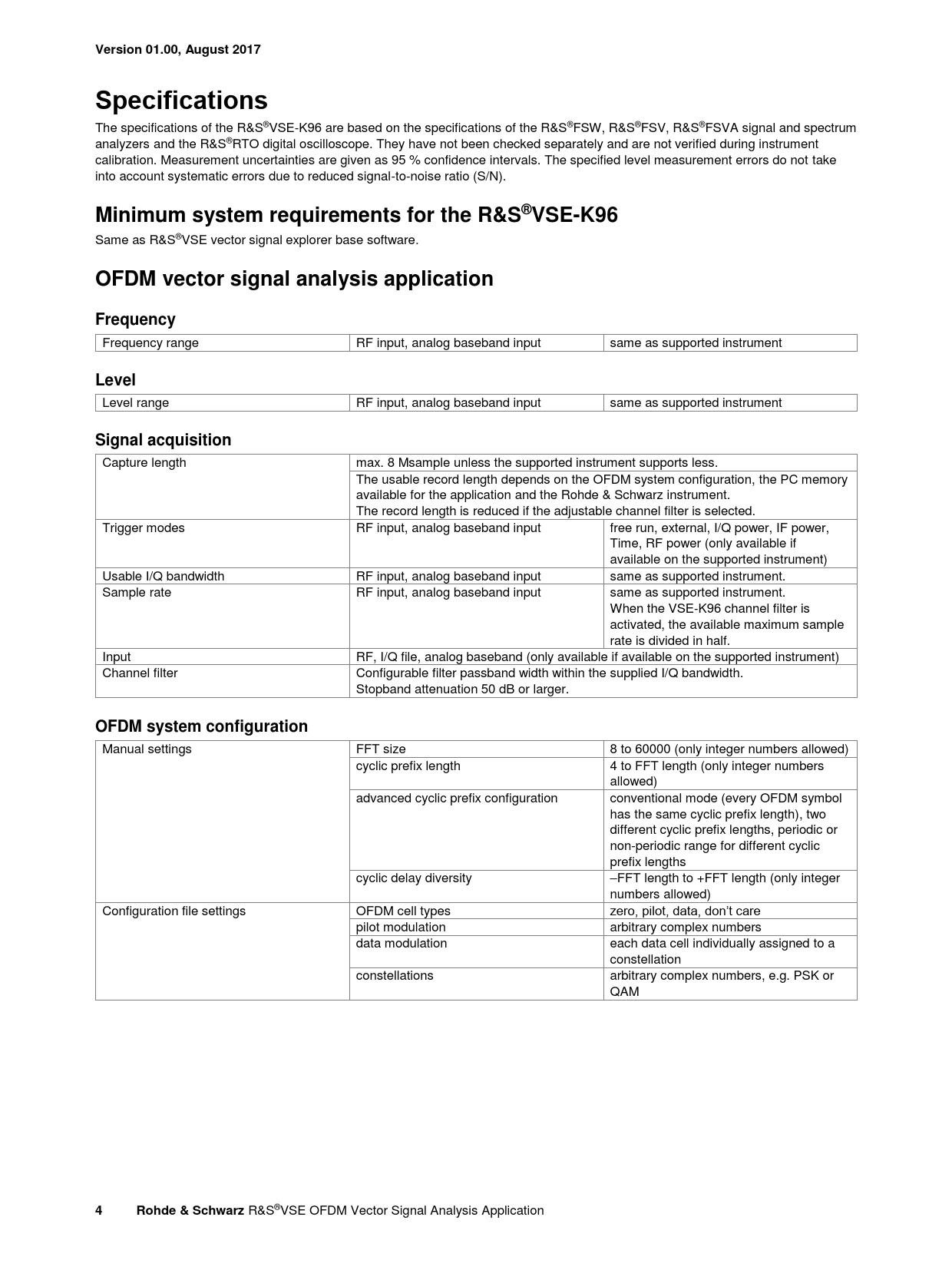 Version 01.00, August 2017Specifications The specifications of the R&S®VSE-K96 are based on the specifications of the R&S®FSW, R&S®FSV, R&S®FSVA signal and spectrum analyzers and the R&S®RTO digital oscilloscope. They have not been checked separately and are not verified during instrument calibration. Measurement uncertainties are given as 95 % confidence intervals. The specified level measurement errors do not take into account systematic errors due to reduced signal-to-noise ratio (S/N). Minimum system requirements for the R&S®VSE-K96 Same as R&S®VSE vector signal explorer base software. OFDM vector signal analysis applicationFrequency Frequency range RF input, analog baseband input same as supported instrument Level Level range RF input, analog baseband input same as supported instrument Signal acquisition Capture length max. 8 Msample unless the supported instrument supports less. The usable record length depends on the OFDM system configuration, the PC memory available for the application and the Rohde & Schwarz instrument. The record length is reduced if the adjustable channel filter is selected. Trigger modes RF input, analog baseband input free run, external, I/Q power, IF power, Time, RF power (only available if available on the supported instrument) Usable I/Q bandwidth RF input, analog baseband input same as supported instrument. Sample rate RF input, analog baseband input same as supported instrument. When the VSE-K96 channel filter is activated, the available maximum sample rate is divided in half. Input RF, I/Q file, analog baseband (only available if available on the supported instrument) Channel filter Configurable filter passband width within the supplied I/Q bandwidth. Stopband attenuation 50 dB or larger. OFDM system configuration Manual settings FFT size 8 to 60000 (only integer numbers allowed) cyclic prefix length 4 to FFT length (only integer numbers allowed) advanced cyclic prefix configuration conventional mode (every OFDM symbol has the same cyclic prefix length), two different cyclic prefix lengths, periodic or non-periodic range for different cyclic prefix lengths cyclic delay diversity –FFT length to +FFT length (only integer numbers allowed) Configuration file settings OFDM cell types zero, pilot, data, don’t care pilot modulation arbitrary complex numbers data modulation each data cell individually assigned to a constellation constellations arbitrary complex numbers, e.g. PSK or QAM 4Rohde & Schwarz R&S®VSE OFDM Vector Signal Analysis Application