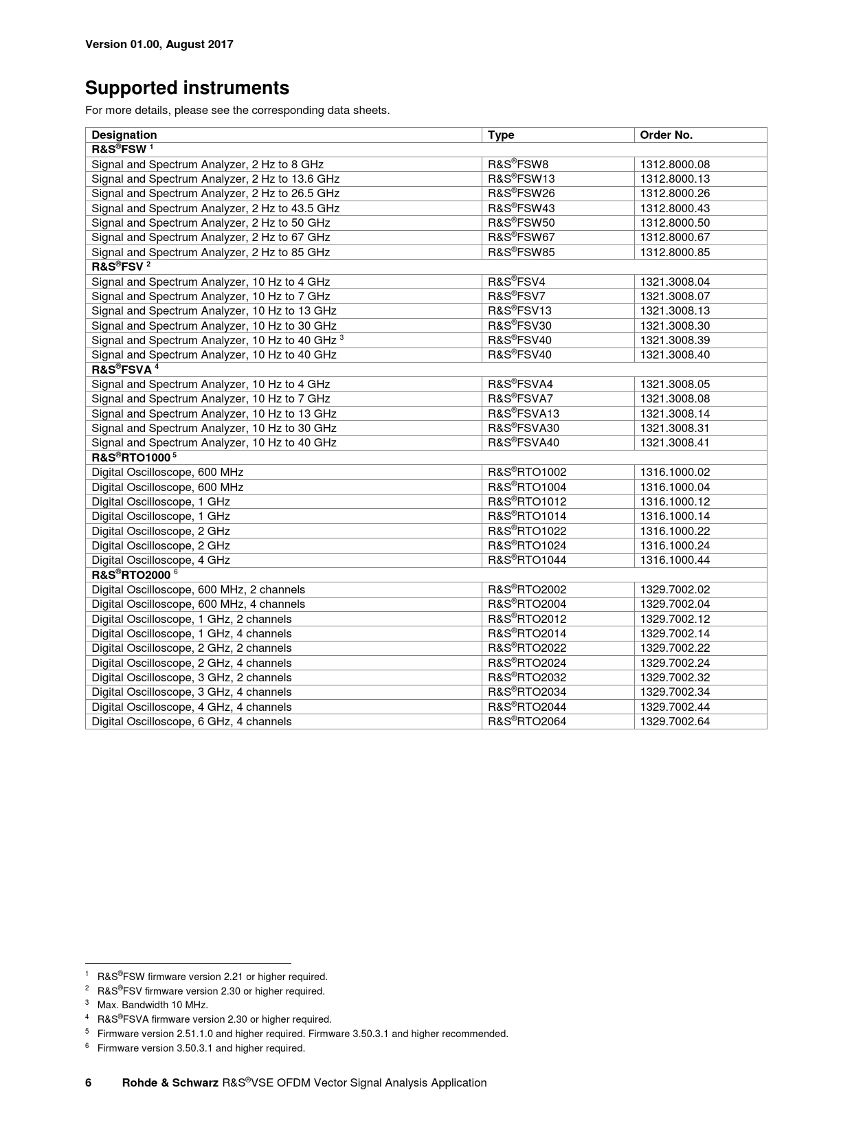 Version 01.00, August 2017Supported instruments For more details, please see the corresponding data sheets. DesignationTypeOrder No.R&S®FSW 1 Signal and Spectrum Analyzer, 2 Hz to 8 GHz R&S®FSW8 1312.8000.08 Signal and Spectrum Analyzer, 2 Hz to 13.6 GHz R&S®FSW13 1312.8000.13 Signal and Spectrum Analyzer, 2 Hz to 26.5 GHz R&S®FSW26 1312.8000.26 Signal and Spectrum Analyzer, 2 Hz to 43.5 GHz R&S®FSW43 1312.8000.43 Signal and Spectrum Analyzer, 2 Hz to 50 GHz R&S®FSW50 1312.8000.50 Signal and Spectrum Analyzer, 2 Hz to 67 GHz R&S®FSW67 1312.8000.67 Signal and Spectrum Analyzer, 2 Hz to 85 GHz R&S®FSW85 1312.8000.85 R&S®FSV 2 Signal and Spectrum Analyzer, 10 Hz to 4 GHz R&S®FSV4 1321.3008.04 Signal and Spectrum Analyzer, 10 Hz to 7 GHz R&S®FSV7 1321.3008.07 Signal and Spectrum Analyzer, 10 Hz to 13 GHz R&S®FSV13 1321.3008.13 Signal and Spectrum Analyzer, 10 Hz to 30 GHz R&S®FSV30 1321.3008.30 Signal and Spectrum Analyzer, 10 Hz to 40 GHz 3 R&S®FSV40 1321.3008.39 Signal and Spectrum Analyzer, 10 Hz to 40 GHz R&S®FSV40 1321.3008.40 R&S®FSVA 4 Signal and Spectrum Analyzer, 10 Hz to 4 GHz R&S®FSVA4 1321.3008.05 Signal and Spectrum Analyzer, 10 Hz to 7 GHz R&S®FSVA7 1321.3008.08 Signal and Spectrum Analyzer, 10 Hz to 13 GHz R&S®FSVA13 1321.3008.14 Signal and Spectrum Analyzer, 10 Hz to 30 GHz R&S®FSVA30 1321.3008.31 Signal and Spectrum Analyzer, 10 Hz to 40 GHz R&S®FSVA40 1321.3008.41 R&S®RTO1000 5 Digital Oscilloscope, 600 MHz R&S®RTO1002 1316.1000.02 Digital Oscilloscope, 600 MHz R&S®RTO1004 1316.1000.04 Digital Oscilloscope, 1 GHz R&S®RTO1012 1316.1000.12 Digital Oscilloscope, 1 GHz R&S®RTO1014 1316.1000.14 Digital Oscilloscope, 2 GHz R&S®RTO1022 1316.1000.22 Digital Oscilloscope, 2 GHz R&S®RTO1024 1316.1000.24 Digital Oscilloscope, 4 GHz R&S®RTO1044 1316.1000.44 R&S®RTO2000 6 Digital Oscilloscope, 600 MHz, 2 channels R&S®RTO2002 1329.7002.02 Digital Oscilloscope, 600 MHz, 4 channels R&S®RTO2004 1329.7002.04 Digital Oscilloscope, 1 GHz, 2 channels R&S®RTO2012 1329.7002.12 Digital Oscilloscope, 1 GHz, 4 channels R&S®RTO2014 1329.7002.14 Digital Oscilloscope, 2 GHz, 2 channels R&S®RTO2022 1329.7002.22 Digital Oscilloscope, 2 GHz, 4 channels R&S®RTO2024 1329.7002.24 Digital Oscilloscope, 3 GHz, 2 channels R&S®RTO2032 1329.7002.32 Digital Oscilloscope, 3 GHz, 4 channels R&S®RTO2034 1329.7002.34 Digital Oscilloscope, 4 GHz, 4 channels R&S®RTO2044 1329.7002.44 Digital Oscilloscope, 6 GHz, 4 channels R&S®RTO2064 1329.7002.64 1 R&S®FSW firmware version 2.21 or higher required. 2 R&S®FSV firmware version 2.30 or higher required. 3 Max. Bandwidth 10 MHz. 4 R&S®FSVA firmware version 2.30 or higher required. 5 Firmware version 2.51.1.0 and higher required. Firmware 3.50.3.1 and higher recommended. 6 Firmware version 3.50.3.1 and higher required. 6Rohde & Schwarz R&S®VSE OFDM Vector Signal Analysis Application