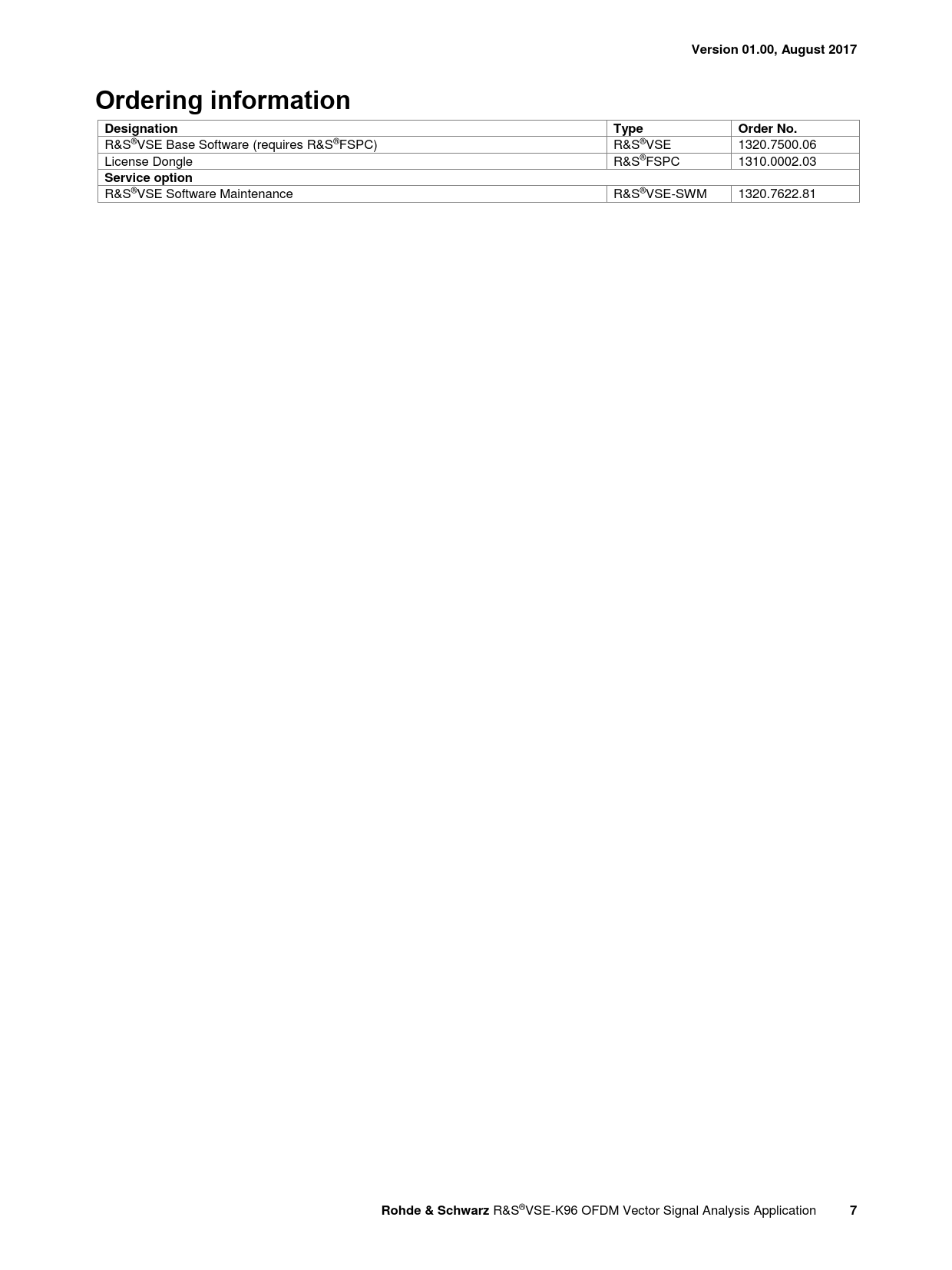 Version 01.00, August 2017. Ordering information. Designation. Type. Order No. Service option. Rohde & Schwarz