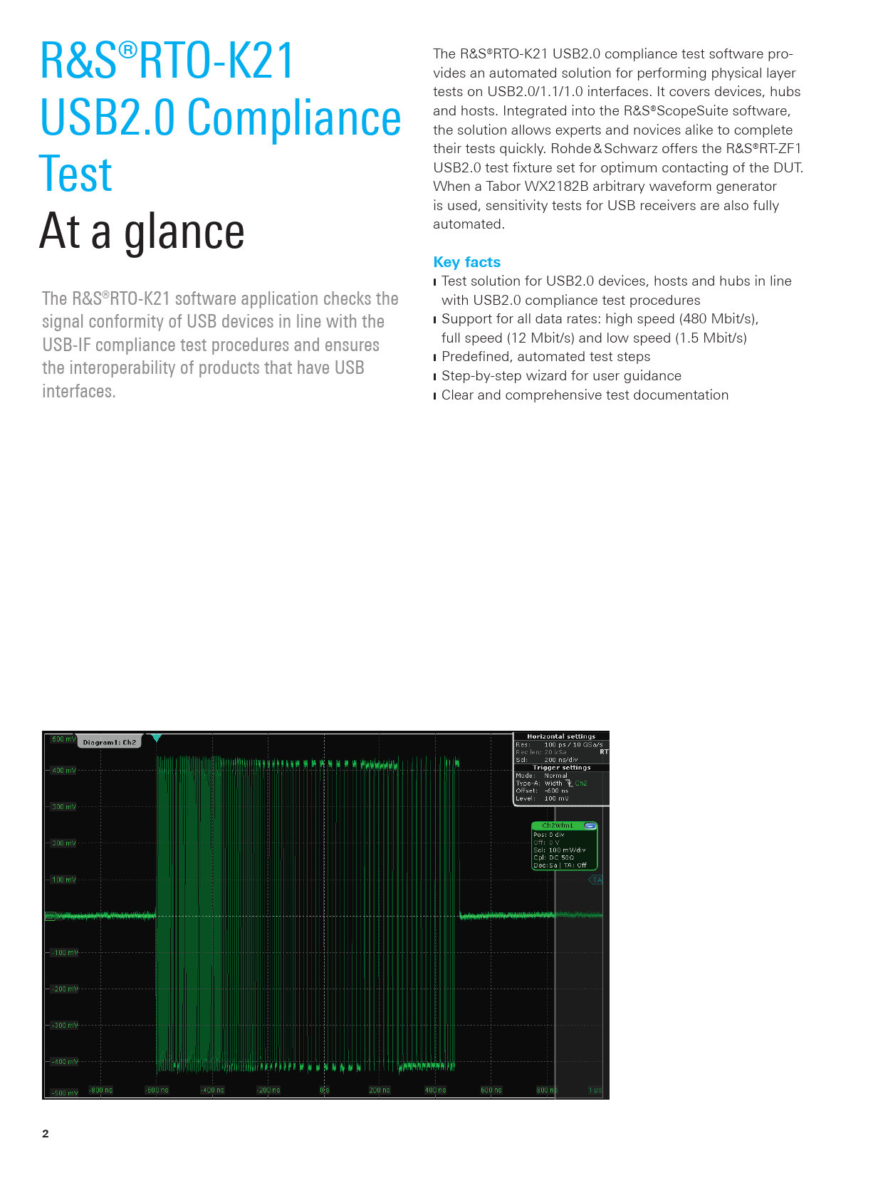 R&S®RTO-K21 The R&S®RTO-K21 USB2.0 compliance test software pro- vides an automated solution for performing physical layer USB2.0 Compliance tests on USB2.0/1.1/1.0 interfaces. It covers devices, hubs and hosts. Integrated into the R&S®ScopeSuite software, the solution allows experts and novices alike to complete Test their tests quickly. Rohde & Schwarz offers the R&S®RT-ZF1 USB2.0 test fixture set for optimum contacting of the DUT. When a Tabor WX2182B arbitrary waveform generator At a glance is used, sensitivity tests for USB receivers are also fully automated. Key facts ❙ Test solution for USB2.0 devices, hosts and hubs in line The R&S®RTO-K21 software application checks the with USB2.0 compliance test procedures signal conformity of USB devices in line with the ❙ Support for all data rates: high speed (480 Mbit/s), USB-IF compliance test procedures and ensures full speed (12 Mbit/s) and low speed (1.5 Mbit/s) the interoperability of products that have USB ❙ Predefined, automated test steps ❙ Step-by-step wizard for user guidance interfaces. ❙ Clear and comprehensive test documentation 2 RTO-K21_bro_en_3606-9285-12.indd 2 18.03.2014 19:02:32