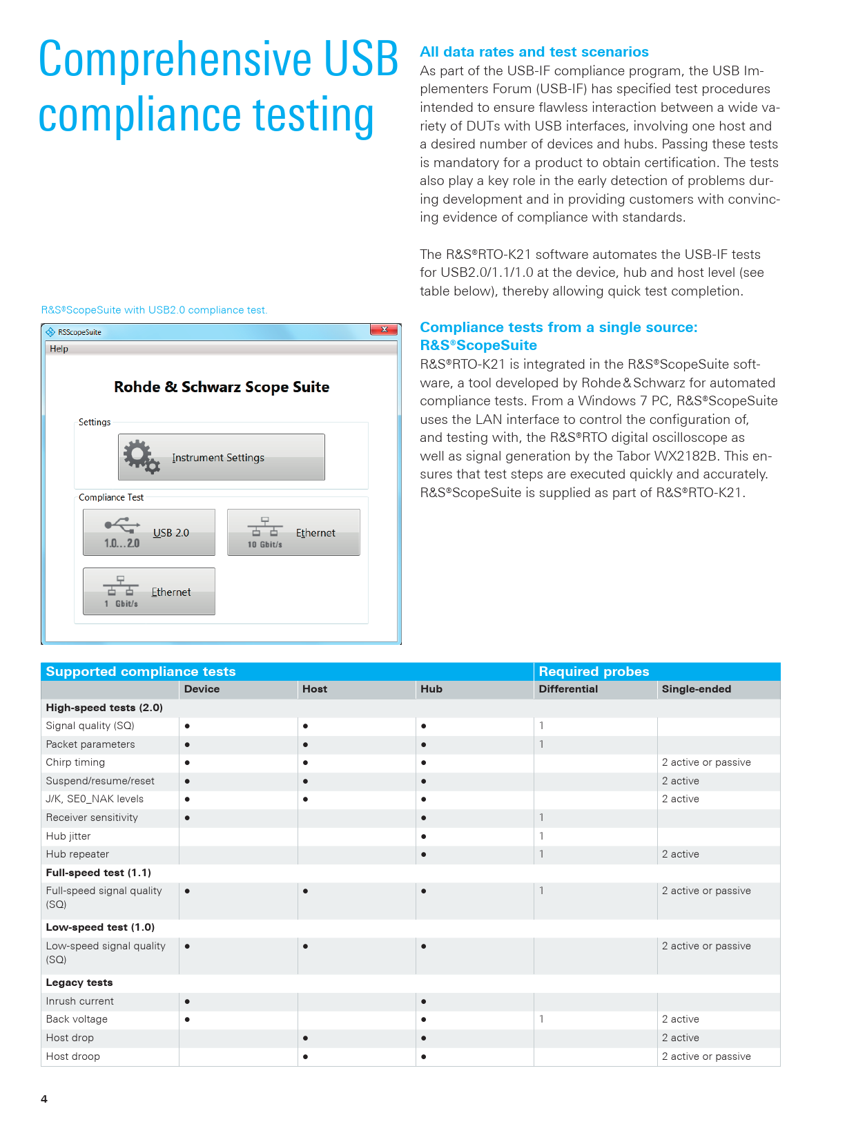 Comprehensive USB All data rates and test scenarios As part of the USB-IF compliance program, the USB Im- compliance testing plementers Forum (USB-IF) has specified test procedures intended to ensure flawless interaction between a wide va- riety of DUTs with USB interfaces, involving one host and a desired number of devices and hubs. Passing these tests is mandatory for a product to obtain certification. The tests also play a key role in the early detection of problems dur- ing development and in providing customers with convinc- ing evidence of compliance with standards. The R&S®RTO-K21 software automates the USB-IF tests for USB2.0/1.1/1.0 at the device, hub and host level (see table below), thereby allowing quick test completion. R&S®ScopeSuite with USB2.0 compliance test. Compliance tests from a single source: R&S®ScopeSuite R&S®RTO-K21 is integrated in the R&S®ScopeSuite soft- ware, a tool developed by Rohde & Schwarz for automated compliance tests. From a Windows 7 PC, R&S®ScopeSuite uses the LAN interface to control the configuration of, and testing with, the R&S®RTO digital oscilloscope as well as signal generation by the Tabor WX2182B. This en- sures that test steps are executed quickly and accurately. R&S®ScopeSuite is supplied as part of R&S®RTO-K21. Supported compliance testsRequired probesDeviceHostHubDifferentialSingle-endedHigh-speed tests (2.0) Signal quality (SQ) ● ● ● 1 Packet parameters ● ● ● 1 Chirp timing ● ● ● 2 active or passive Suspend/resume/reset ● ● ● 2 active J/K, SE0_NAK levels ● ● ● 2 active Receiver sensitivity ● ● 1 Hub jitter ● 1 Hub repeater ● 1 2 active Full-speed test (1.1) Full-speed signal quality ● ● ● 1 2 active or passive (SQ) Low-speed test (1.0) Low-speed signal quality ● ● ● 2 active or passive (SQ) Legacy tests Inrush current ● ● Back voltage ● ● 1 2 active Host drop ● ● 2 active Host droop ● ● 2 active or passive 4 RTO-K21_bro_en_3606-9285-12.indd 4 18.03.2014 19:02:32
