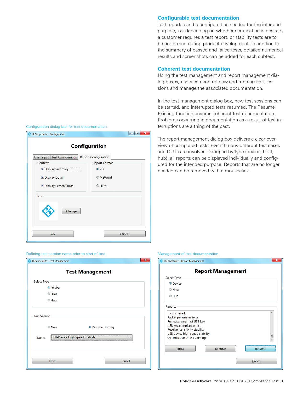 Configurable test documentation Test reports can be configured as needed for the intended purpose, i.e. depending on whether certification is desired, a customer requires a test report, or stability tests are to be performed during product development. In addition to the summary of passed and failed tests, detailed numerical results and screenshots can be added for each subtest. Coherent test documentation Using the test management and report management dia- log boxes, users can control new and running test ses- sions and manage the associated documentation. In the test management dialog box, new test sessions can be started, and interrupted tests resumed. The Resume Existing function ensures coherent test documentation. Problems occurring in documentation as a result of test in- Configuration dialog box for test documentation. terruptions are a thing of the past. The report management dialog box delivers a clear over- view of completed tests, even if many different test cases and DUTs are involved. Grouped by type (device, host, hub), all reports can be displayed individually and config- ured for the intended purpose. Reports that are no longer needed can be removed with a mouseclick. Defining test session name prior to start of test. Management of test documentation. Rohde & Schwarz R&S®RTO-K21 USB2.0 Compliance Test 9 RTO-K21_bro_en_3606-9285-12.indd 9 18.03.2014 19:02:35