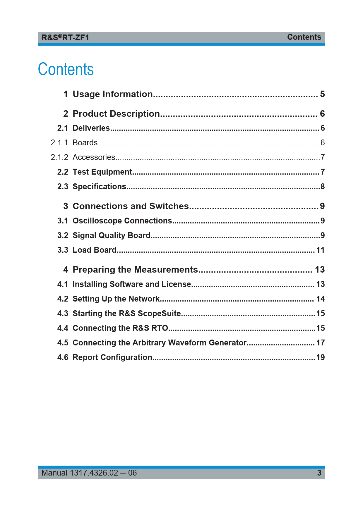 link to page 5 link to page 6 link to page 6 link to page 6 link to page 7 link to page 7 link to page 8 link to page 9 link to page 9 link to page 9 link to page 11 link to page 13 link to page 13 link to page 14 link to page 15 link to page 15 link to page 17 link to page 19 R&S ® RT-ZF1Contents Contents 1 Usage Information... 52 Product Description.. 62.1 Deliveries... 6 2.1.1 Boards...6 2.1.2 Accessories...7 2.2 Test Equipment... 72.3 Specifications..83 Connections and Switches... 93.1 Oscilloscope Connections...93.2 Signal Quality Board...93.3 Load Board.. 114 Preparing the Measurements... 134.1 Installing Software and License.. 134.2 Setting Up the Network.. 144.3 Starting the R&SScopeSuite...154.4 Connecting the R&S RTO...154.5 Connecting the Arbitrary Waveform Generator... 174.6 Report Configuration..19 Manual 1317.4326.02 ─ 06 3 Document Outline Cover Contents 1 Usage Information 2 Product Description 2.1 Deliveries 2.1.1 Boards 2.1.2 Accessories 2.2 Test Equipment 2.3 Specifications 3 Connections and Switches 3.1 Oscilloscope Connections 3.2 Signal Quality Board 3.3 Load Board 4 Preparing the Measurements 4.1 Installing Software and License 4.2 Setting Up the Network 4.3 Starting the R&S ScopeSuite 4.4 Connecting the R&S RTO 4.5 Connecting the Arbitrary Waveform Generator 4.6 Report Configuration
