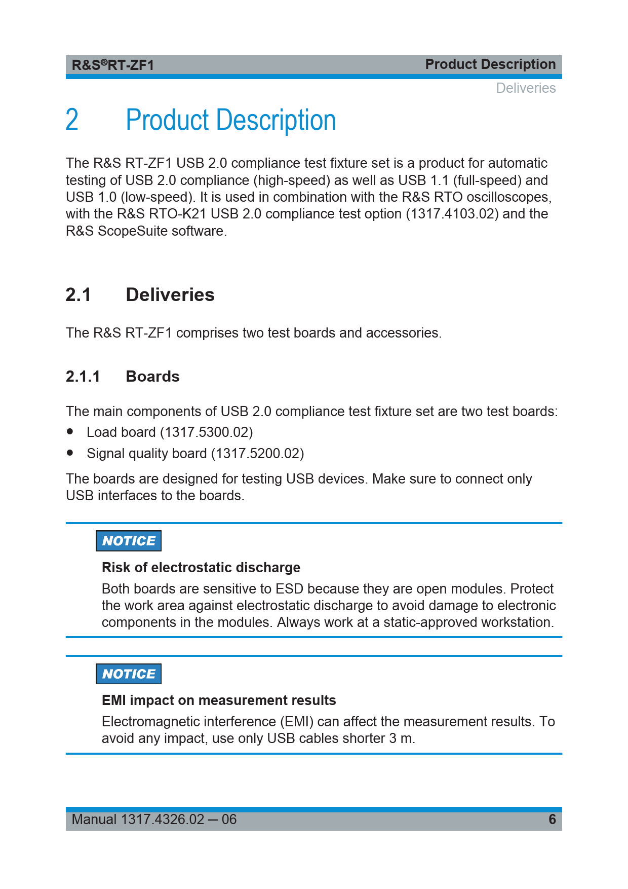 R&S ® RT-ZF1Product Description Deliveries 2 Product Description The R&S RT‑ZF1 USB 2.0 compliance test fixture set is a product for automatic testing of USB 2.0 compliance (high-speed) as well as USB 1.1 (full-speed) and USB 1.0 (low-speed). It is used in combination with the R&S RTO oscilloscopes, with the R&S RTO-K21 USB 2.0 compliance test option (1317.4103.02) and the R&S ScopeSuite software. 2.1Deliveries The R&S RT‑ZF1 comprises two test boards and accessories. 2.1.1Boards The main components of USB 2.0 compliance test fixture set are two test boards: ● Load board (1317.5300.02) ● Signal quality board (1317.5200.02) The boards are designed for testing USB devices. Make sure to connect only USB interfaces to the boards. Risk of electrostatic discharge Both boards are sensitive to ESD because they are open modules. Protect the work area against electrostatic discharge to avoid damage to electronic components in the modules. Always work at a static-approved workstation. EMI impact on measurement results Electromagnetic interference (EMI) can affect the measurement results. To avoid any impact, use only USB cables shorter 3 m. Manual 1317.4326.02 ─ 06 6 Document Outline Cover Contents 1 Usage Information 2 Product Description 2.1 Deliveries 2.1.1 Boards 2.1.2 Accessories 2.2 Test Equipment 2.3 Specifications 3 Connections and Switches 3.1 Oscilloscope Connections 3.2 Signal Quality Board 3.3 Load Board 4 Preparing the Measurements 4.1 Installing Software and License 4.2 Setting Up the Network 4.3 Starting the R&S ScopeSuite 4.4 Connecting the R&S RTO 4.5 Connecting the Arbitrary Waveform Generator 4.6 Report Configuration