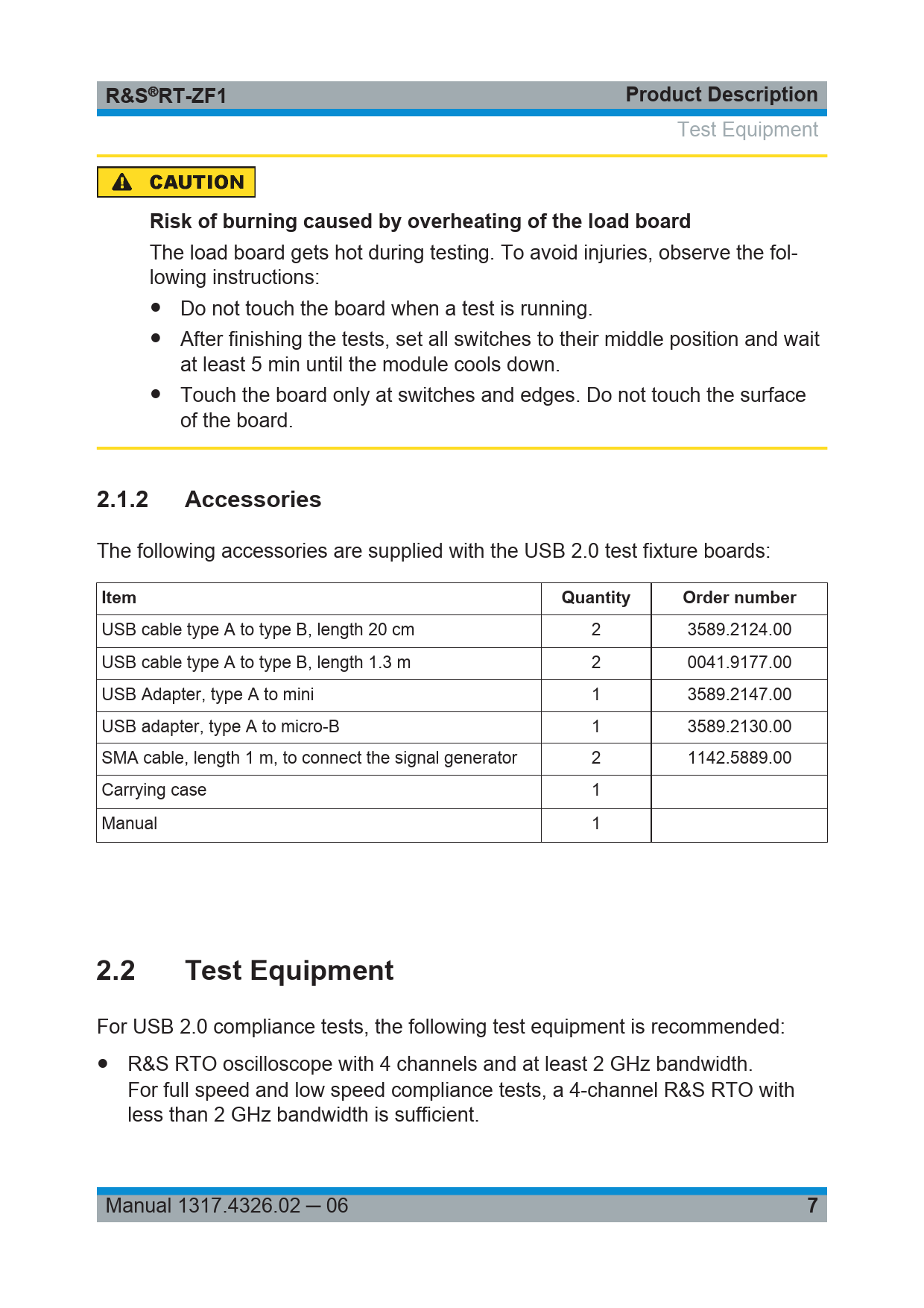R&S ® RT-ZF1Product Description Test Equipment Risk of burning caused by overheating of the load board The load board gets hot during testing. To avoid injuries, observe the fol- lowing instructions: ● Do not touch the board when a test is running. ● After finishing the tests, set all switches to their middle position and wait at least 5 min until the module cools down. ● Touch the board only at switches and edges. Do not touch the surface of the board. 2.1.2Accessories The following accessories are supplied with the USB 2.0 test fixture boards: ItemQuantityOrder number USB cable type A to type B, length 20 cm 2 3589.2124.00 USB cable type A to type B, length 1.3 m 2 0041.9177.00 USB Adapter, type A to mini 1 3589.2147.00 USB adapter, type A to micro-B 1 3589.2130.00 SMA cable, length 1 m, to connect the signal generator 2 1142.5889.00 Carrying case 1 Manual 1 2.2Test Equipment For USB 2.0 compliance tests, the following test equipment is recommended: ● R&S RTO oscilloscope with 4 channels and at least 2 GHz bandwidth. For full speed and low speed compliance tests, a 4-channel R&S RTO with less than 2 GHz bandwidth is sufficient. Manual 1317.4326.02 ─ 06 7 Document Outline Cover Contents 1 Usage Information 2 Product Description 2.1 Deliveries 2.1.1 Boards 2.1.2 Accessories 2.2 Test Equipment 2.3 Specifications 3 Connections and Switches 3.1 Oscilloscope Connections 3.2 Signal Quality Board 3.3 Load Board 4 Preparing the Measurements 4.1 Installing Software and License 4.2 Setting Up the Network 4.3 Starting the R&S ScopeSuite 4.4 Connecting the R&S RTO 4.5 Connecting the Arbitrary Waveform Generator 4.6 Report Configuration