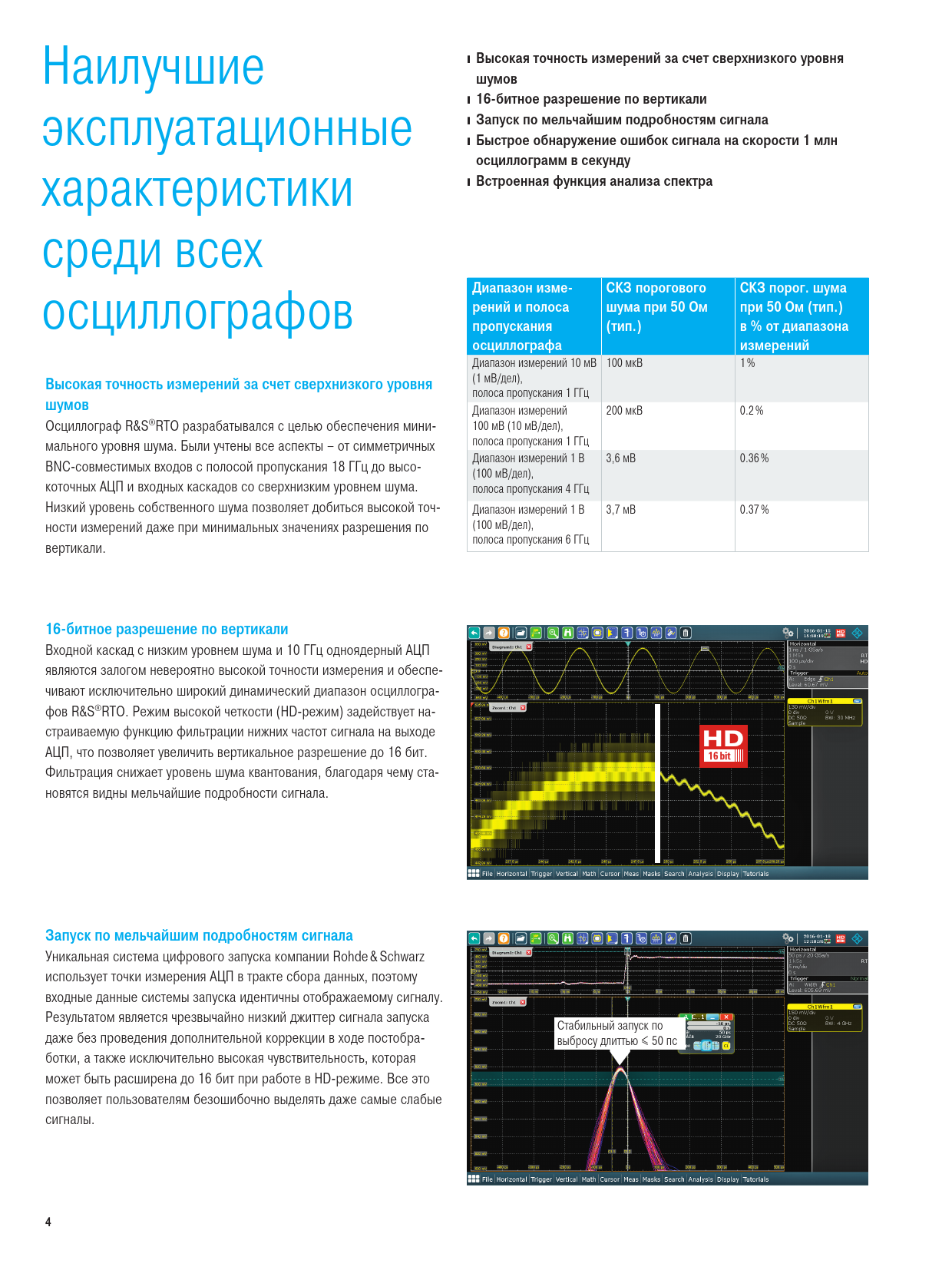 Наилучшие ❙ Высокая точность измерений за счет сверхнизкого уровня шумов эксплуатационные ❙ 16-битное разрешение по вертикали ❙ Запуск по мельчайшим подробностям сигнала ❙ Быстрое обнаружение ошибок сигнала на скорости 1 млн характеристики осциллограмм в секунду ❙ Встроенная функция анализа спектра среди всех осциллографов Диапазон изме- СКЗ порогового СКЗ порог. шума рений и полоса шума при 50 Ом при 50 Ом (тип.) пропускания (тип.) в % от диапазона осциллографа измерений Диапазон измерений 10 мВ 100 мкВ 1 % (1 мВ/дел), Высокая точность измерений за счет сверхнизкого уровня полоса пропускания 1 ГГц шумов Диапазон измерений 200 мкВ 0.2 % Осциллограф R&S®RTO разрабатывался с целью обеспечения мини- 100 мВ (10 мВ/дел), полоса пропускания 1 ГГц мального уровня шума. Были учтены все аспекты – от симметричных Диапазон измерений 1 В 3,6 мВ 0.36 % BNC-совместимых входов с полосой пропускания 18 ГГц до высо- (100 мВ/дел), коточных АЦП и входных каскадов со сверхнизким уровнем шума. полоса пропускания 4 ГГц Низкий уровень собственного шума позволяет добиться высокой точ- Диапазон измерений 1 В 3,7 мВ 0.37 % (100 мВ/дел), ности измерений даже при минимальных значениях разрешения по полоса пропускания 6 ГГц вертикали. 16-битное разрешение по вертикали Входной каскад с низким уровнем шума и 10 ГГц одноядерный АЦП являются залогом невероятно высокой точности измерения и обеспе- чивают исключительно широкий динамический диапазон осциллогра- фов R&S®RTO. Режим высокой четкости (HD-режим) задействует на- страиваемую функцию фильтрации нижних частот сигнала на выходе АЦП, что позволяет увеличить вертикальное разрешение до 16 бит. Фильтрация снижает уровень шума квантования, благодаря чему ста- новятся видны мельчайшие подробности сигнала. Запуск по мельчайшим подробностям сигнала Уникальная система цифрового запуска компании Rohde & Schwarz использует точки измерения АЦП в тракте сбора данных, поэтому входные данные системы запуска идентичны отображаемому сигналу. Результатом является чрезвычайно низкий джиттер сигнала запуска Стабильный запуск по даже без проведения дополнительной коррекции в ходе постобра- выбросу длиттью ≤ 50 пс ботки, а также исключительно высокая чувствительность, которая может быть расширена до 16 бит при работе в HD-режиме. Все это позволяет пользователям безошибочно выделять даже самые слабые сигналы. 4 RTO2000_bro_ru_3607-2684-18_v0700.indd 4 11.04.2017 10:13:10