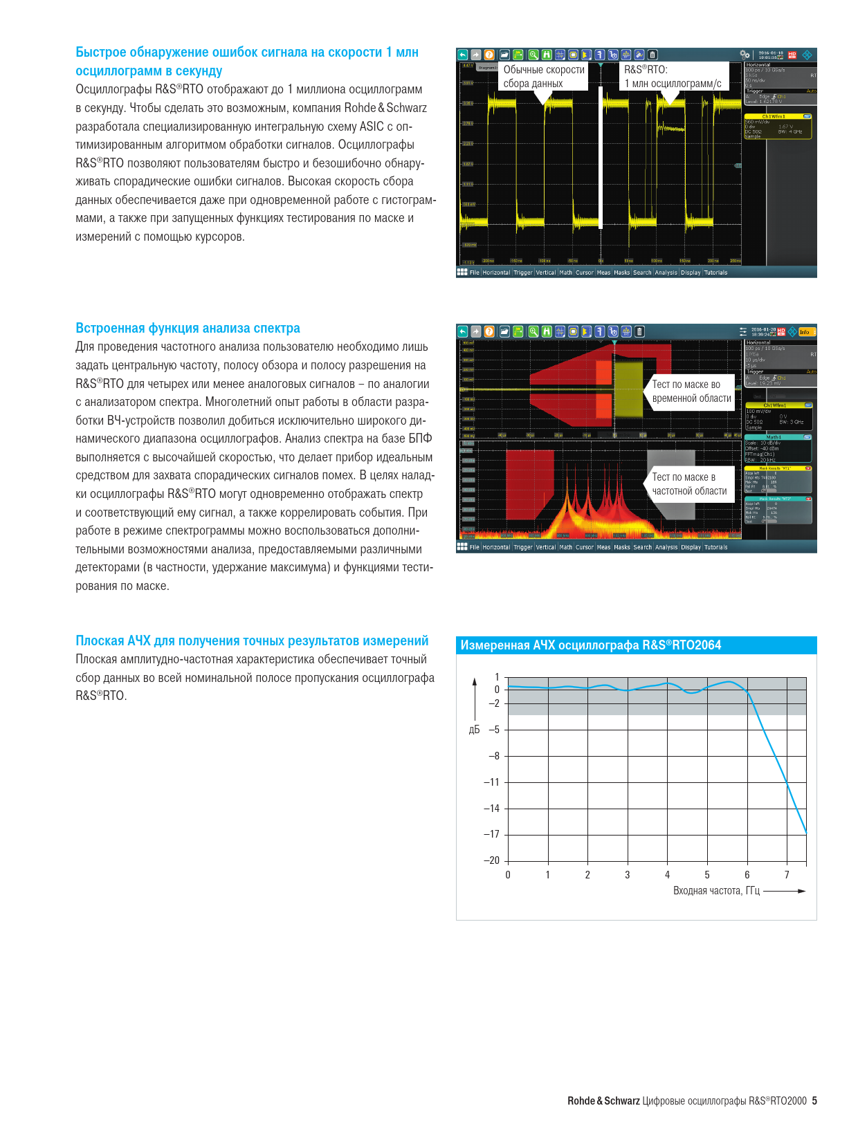 Быстрое обнаружение ошибок сигнала на скорости 1 млн осциллограмм в секунду Обычные скорости R&S®RTO: сбора данных 1 млн осциллограмм/с Осциллографы R&S®RTO отображают до 1 миллиона осциллограмм в секунду. Чтобы сделать это возможным, компания Rohde & Schwarz разработала специализированную интегральную схему ASIC с оп- тимизированным алгоритмом обработки сигналов. Осциллографы R&S®RTO позволяют пользователям быстро и безошибочно обнару- живать спорадические ошибки сигналов. Высокая скорость сбора данных обеспечивается даже при одновременной работе с гистограм- мами, а также при запущенных функциях тестирования по маске и измерений с помощью курсоров. Встроенная функция анализа спектра Для проведения частотного анализа пользователю необходимо лишь задать центральную частоту, полосу обзора и полосу разрешения на R&S®RTO для четырех или менее аналоговых сигналов – по аналогии Тест по маске во временной области с анализатором спектра. Многолетний опыт работы в области разра- ботки ВЧ-устройств позволил добиться исключительно широкого ди- намического диапазона осциллографов. Анализ спектра на базе БПФ выполняется с высочайшей скоростью, что делает прибор идеальным средством для захвата спорадических сигналов помех. В целях налад- Тест по маске в частотной области ки осциллографы R&S®RTO могут одновременно отображать спектр и соответствующий ему сигнал, а также коррелировать события. При работе в режиме спектрограммы можно воспользоваться дополни- тельными возможностями анализа, предоставляемыми различными детекторами (в частности, удержание максимума) и функциями тести- рования по маске. Плоская АЧХ для получения точных результатов измерений Измеренная АЧХ осциллографа R&S®RTO2064 Плоская амплитудно-частотная характеристика обеспечивает точный сбор данных во всей номинальной полосе пропускания осциллографа 1 0 R&S®RTO. –2 дБ –5 –8 –11 –14 –17 –20 0 1 2 3 4 5 6 7 Входная частота, ГГц Rohde & Schwarz Цифровые осциллографы R&S®RTO2000 5 RTO2000_bro_ru_3607-2684-18_v0700.indd 5 11.04.2017 10:13:10