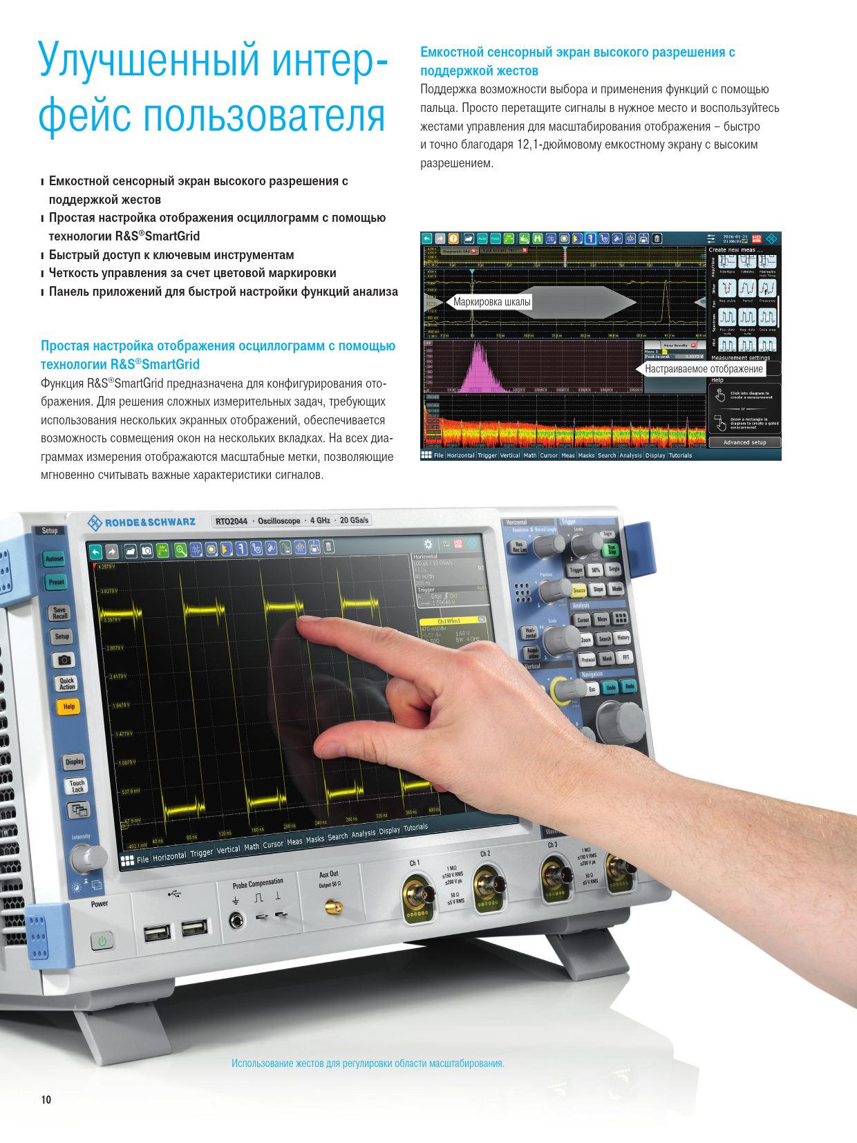 Емкостной сенсорный экран высокого разрешения с Улучшенный интер- поддержкой жестов Поддержка возможности выбора и применения функций с помощью пальца. Просто перетащите сигналы в нужное место и воспользуйтесь фейс пользователя жестами управления для масштабирования отображения – быстро и точно благодаря 12,1-дюймовому емкостному экрану с высоким разрешением. ❙Емкостной сенсорный экран высокого разрешения с поддержкой жестов ❙Простая настройка отображения осциллограмм с помощью технологии R&S®SmartGrid ❙Быстрый доступ к ключевым инструментам ❙Четкость управления за счет цветовой маркировки ❙Панель приложений для быстрой настройки функций анализа Маркировка шкалы Простая настройка отображения осциллограмм с помощью технологии R&S®SmartGrid Настраиваемое отображение Функция R&S®SmartGrid предназначена для конфигурирования ото- бражения. Для решения сложных измерительных задач, требующих использования нескольких экранных отображений, обеспечивается возможность совмещения окон на нескольких вкладках. На всех диа- граммах измерения отображаются масштабные метки, позволяющие мгновенно считывать важные характеристики сигналов. Использование жестов для регулировки области масштабирования. 10 RTO2000_bro_ru_3607-2684-18_v0700.indd 10 11.04.2017 10:13:18