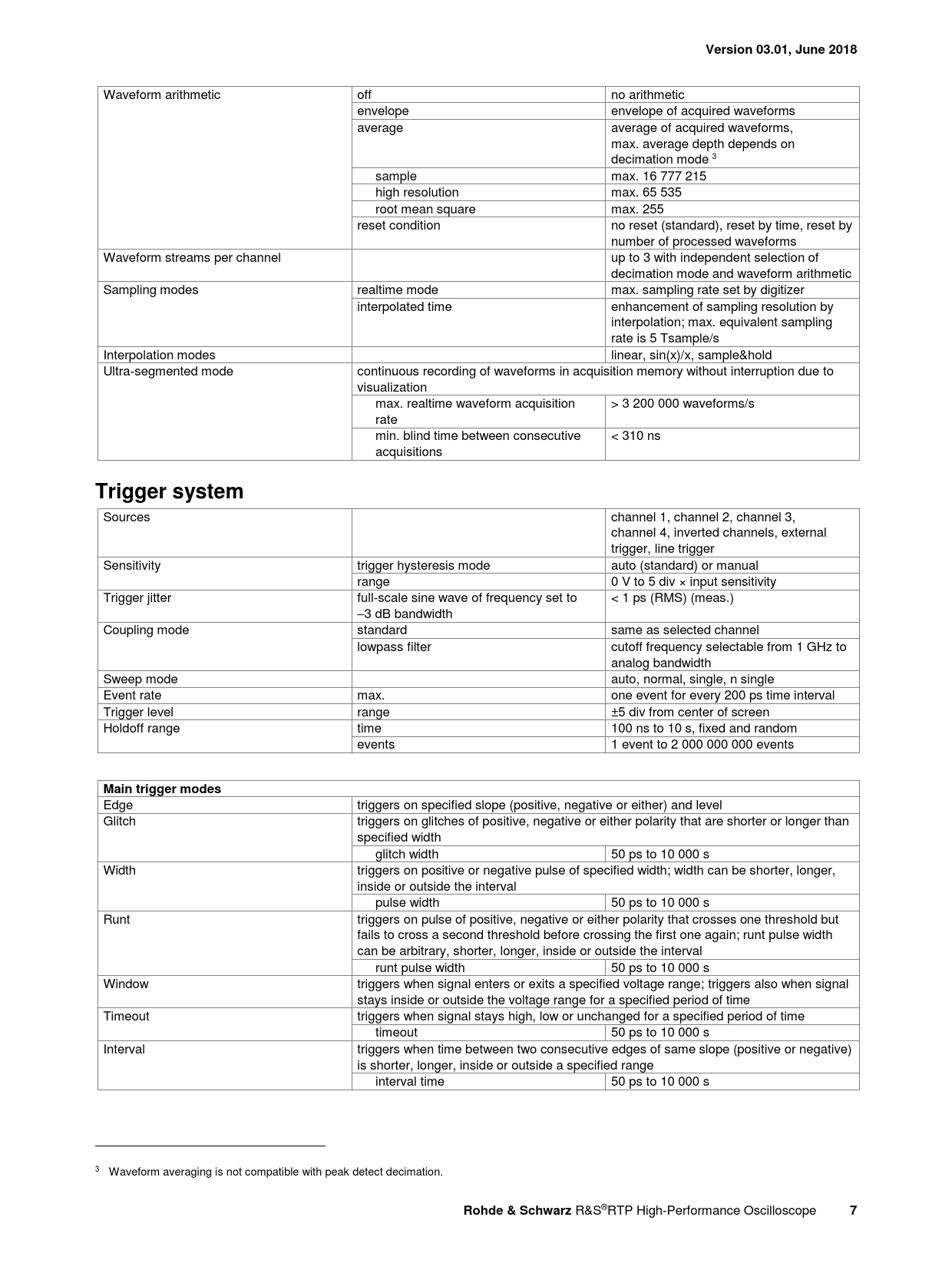 Version 03.01, June 2018 Waveform arithmetic off no arithmetic envelope envelope of acquired waveforms average average of acquired waveforms, max. average depth depends on decimation mode 3 sample max. 16 777 215 high resolution max. 65 535 root mean square max. 255 reset condition no reset (standard), reset by time, reset by number of processed waveforms Waveform streams per channel up to 3 with independent selection of decimation mode and waveform arithmetic Sampling modes realtime mode max. sampling rate set by digitizer interpolated time enhancement of sampling resolution by interpolation; max. equivalent sampling rate is 5 Tsample/s Interpolation modes linear, sin(x)/x, sample&hold Ultra-segmented mode continuous recording of waveforms in acquisition memory without interruption due to visualization max. realtime waveform acquisition > 3 200 000 waveforms/s rate min. blind time between consecutive < 310 ns acquisitions Trigger system Sources channel 1, channel 2, channel 3, channel 4, inverted channels, external trigger, line trigger Sensitivity trigger hysteresis mode auto (standard) or manual range 0 V to 5 div × input sensitivity Trigger jitter full-scale sine wave of frequency set to < 1 ps (RMS) (meas.) –3 dB bandwidth Coupling mode standard same as selected channel lowpass filter cutoff frequency selectable from 1 GHz to analog bandwidth Sweep mode auto, normal, single, n single Event rate max. one event for every 200 ps time interval Trigger level range ±5 div from center of screen Holdoff range time 100 ns to 10 s, fixed and random events 1 event to 2 000 000 000 events Main trigger modes Edge triggers on specified slope (positive, negative or either) and level Glitch triggers on glitches of positive, negative or either polarity that are shorter or longer than specified width glitch width 50 ps to 10 000 s Width triggers on positive or negative pulse of specified width; width can be shorter, longer, inside or outside the interval pulse width 50 ps to 10 000 s Runt triggers on pulse of positive, negative or either polarity that crosses one threshold but fails to cross a second threshold before crossing the first one again; runt pulse width can be arbitrary, shorter, longer, inside or outside the interval runt pulse width 50 ps to 10 000 s Window triggers when signal enters or exits a specified voltage range; triggers also when signal stays inside or outside the voltage range for a specified period of time Timeout triggers when signal stays high, low or unchanged for a specified period of time timeout 50 ps to 10 000 s Interval triggers when time between two consecutive edges of same slope (positive or negative) is shorter, longer, inside or outside a specified range interval time 50 ps to 10 000 s 3 Waveform averaging is not compatible with peak detect decimation. Rohde & Schwarz R&S®RTP High-Performance Oscilloscope 7
