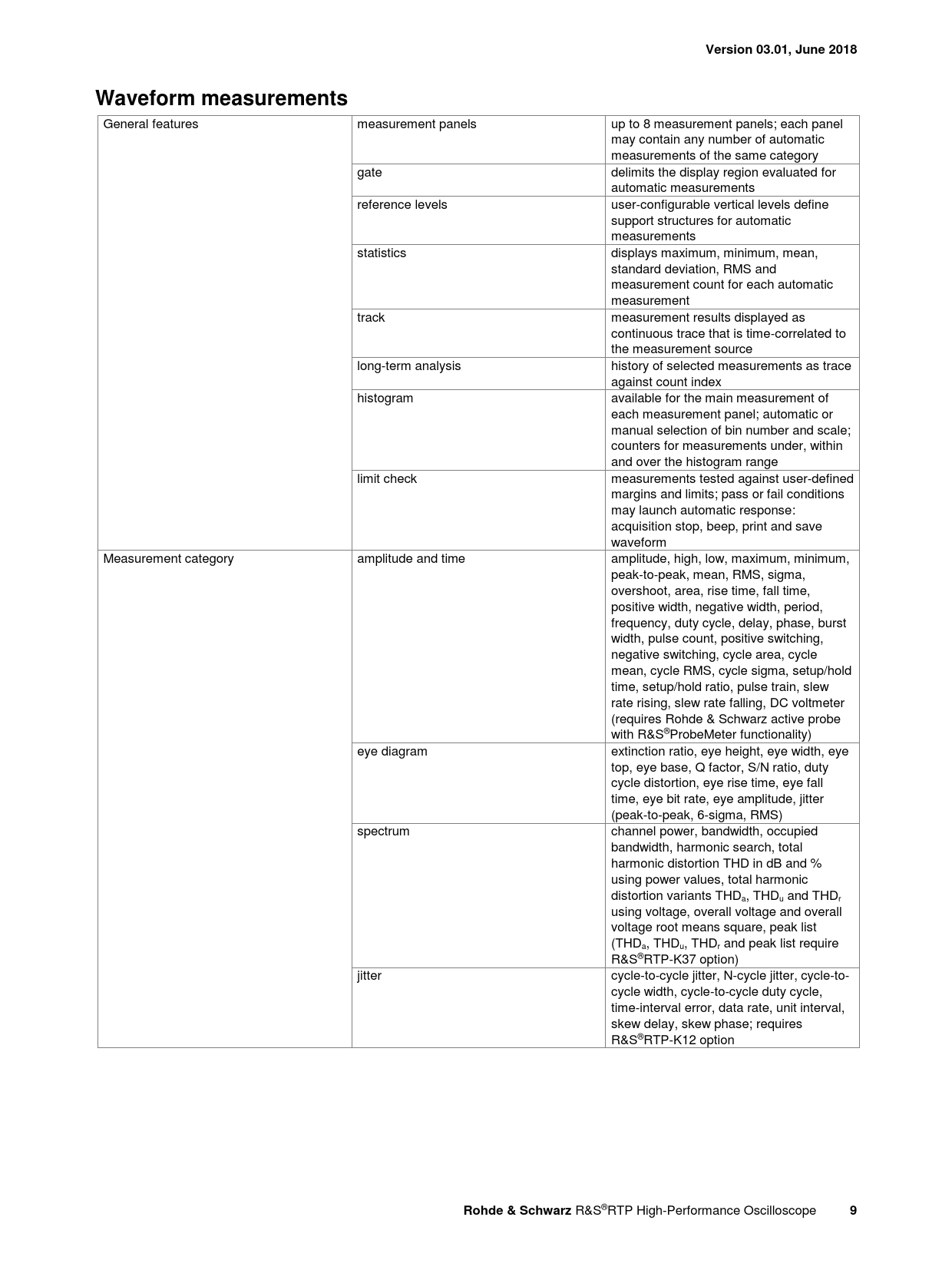 Version 03.01, June 2018Waveform measurements General features measurement panels up to 8 measurement panels; each panel may contain any number of automatic measurements of the same category gate delimits the display region evaluated for automatic measurements reference levels user-configurable vertical levels define support structures for automatic measurements statistics displays maximum, minimum, mean, standard deviation, RMS and measurement count for each automatic measurement track measurement results displayed as continuous trace that is time-correlated to the measurement source long-term analysis history of selected measurements as trace against count index histogram available for the main measurement of each measurement panel; automatic or manual selection of bin number and scale; counters for measurements under, within and over the histogram range limit check measurements tested against user-defined margins and limits; pass or fail conditions may launch automatic response: acquisition stop, beep, print and save waveform Measurement category amplitude and time amplitude, high, low, maximum, minimum, peak-to-peak, mean, RMS, sigma, overshoot, area, rise time, fall time, positive width, negative width, period, frequency, duty cycle, delay, phase, burst width, pulse count, positive switching, negative switching, cycle area, cycle mean, cycle RMS, cycle sigma, setup/hold time, setup/hold ratio, pulse train, slew rate rising, slew rate falling, DC voltmeter (requires Rohde & Schwarz active probe with R&S®ProbeMeter functionality) eye diagram extinction ratio, eye height, eye width, eye top, eye base, Q factor, S/N ratio, duty cycle distortion, eye rise time, eye fall time, eye bit rate, eye amplitude, jitter (peak-to-peak, 6-sigma, RMS) spectrum channel power, bandwidth, occupied bandwidth, harmonic search, total harmonic distortion THD in dB and % using power values, total harmonic distortion variants THDa, THDu and THDr using voltage, overall voltage and overall voltage root means square, peak list (THDa, THDu, THDr and peak list require R&S®RTP-K37 option) jitter cycle-to-cycle jitter, N-cycle jitter, cycle-to- cycle width, cycle-to-cycle duty cycle, time-interval error, data rate, unit interval, skew delay, skew phase; requires R&S®RTP-K12 option Rohde & Schwarz R&S®RTP High-Performance Oscilloscope 9