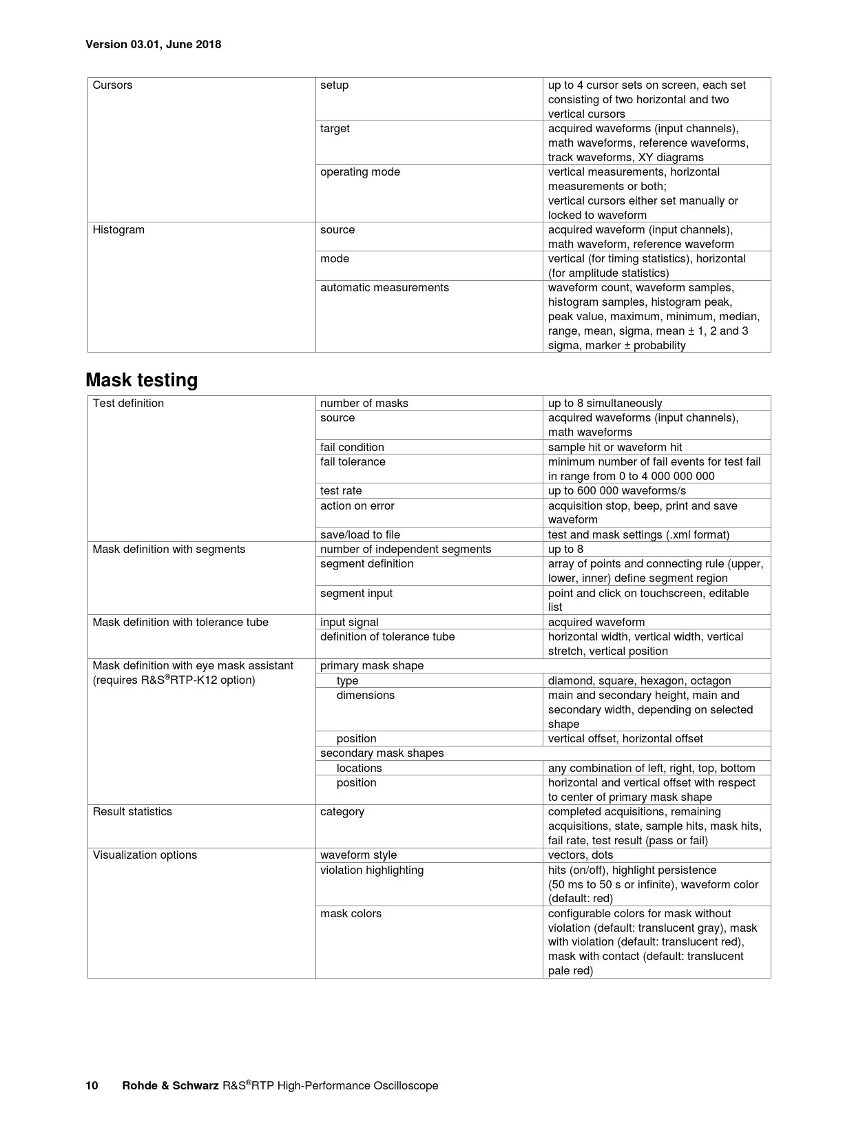 Version 03.01, June 2018 Cursors setup up to 4 cursor sets on screen, each set consisting of two horizontal and two vertical cursors target acquired waveforms (input channels), math waveforms, reference waveforms, track waveforms, XY diagrams operating mode vertical measurements, horizontal measurements or both; vertical cursors either set manually or locked to waveform Histogram source acquired waveform (input channels), math waveform, reference waveform mode vertical (for timing statistics), horizontal (for amplitude statistics) automatic measurements waveform count, waveform samples, histogram samples, histogram peak, peak value, maximum, minimum, median, range, mean, sigma, mean ± 1, 2 and 3 sigma, marker ± probability Mask testing Test definition number of masks up to 8 simultaneously source acquired waveforms (input channels), math waveforms fail condition sample hit or waveform hit fail tolerance minimum number of fail events for test fail in range from 0 to 4 000 000 000 test rate up to 600 000 waveforms/s action on error acquisition stop, beep, print and save waveform save/load to file test and mask settings (.xml format) Mask definition with segments number of independent segments up to 8 segment definition array of points and connecting rule (upper, lower, inner) define segment region segment input point and click on touchscreen, editable list Mask definition with tolerance tube input signal acquired waveform definition of tolerance tube horizontal width, vertical width, vertical stretch, vertical position Mask definition with eye mask assistant primary mask shape (requires R&S®RTP-K12 option) type diamond, square, hexagon, octagon dimensions main and secondary height, main and secondary width, depending on selected shape position vertical offset, horizontal offset secondary mask shapes locations any combination of left, right, top, bottom position horizontal and vertical offset with respect to center of primary mask shape Result statistics category completed acquisitions, remaining acquisitions, state, sample hits, mask hits, fail rate, test result (pass or fail) Visualization options waveform style vectors, dots violation highlighting hits (on/off), highlight persistence (50 ms to 50 s or infinite), waveform color (default: red) mask colors configurable colors for mask without violation (default: translucent gray), mask with violation (default: translucent red), mask with contact (default: translucent pale red) 10Rohde & Schwarz R&S®RTP High-Performance Oscilloscope