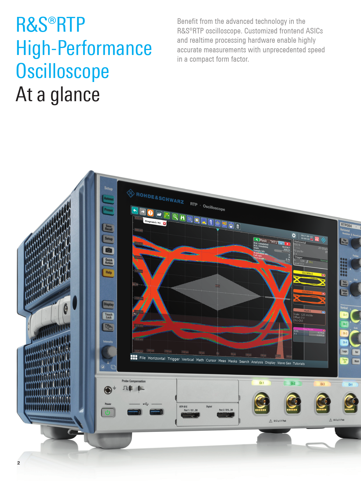 Benefit from the advanced technology in the R&S®RTP R&S®RTP oscilloscope. Customized frontend ASICs and realtime processing hardware enable highly accurate measurements with unprecedented speed High-Performance in a compact form factor. Oscilloscope At a glance 2 RTP_bro_en_5215-4152_12_v0102.indd 2 07.06.2018 13:43:01