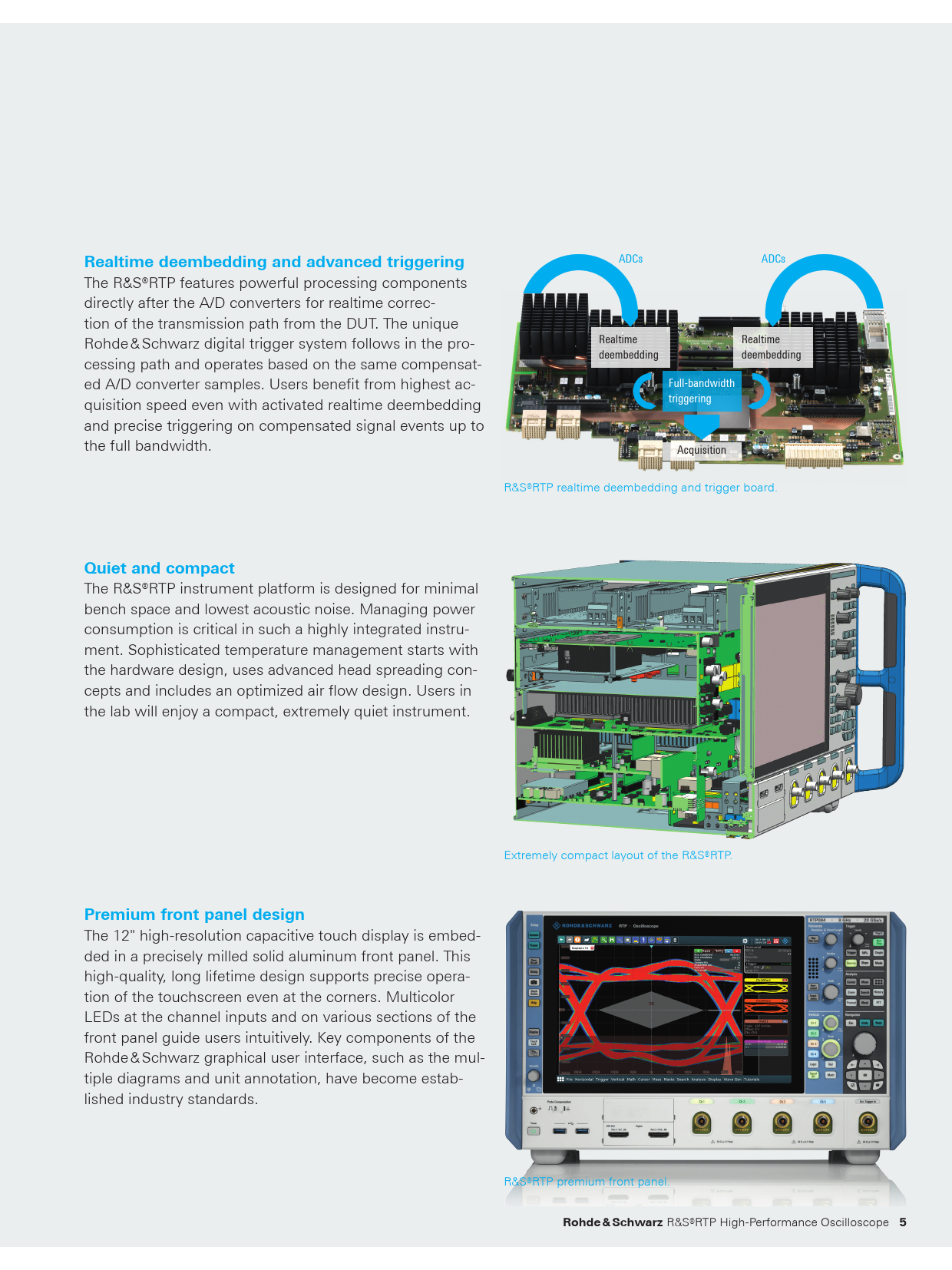 ADCs ADCs Realtime deembedding and advanced triggering The R&S®RTP features powerful processing components directly after the A/D converters for realtime correc- tion of the transmission path from the DUT. The unique Realtime Realtime Rohde & Schwarz digital trigger system follows in the pro- deembedding deembedding cessing path and operates based on the same compensat- ed A/D converter samples. Users benefit from highest ac- Full-bandwidth triggering quisition speed even with activated realtime deembedding and precise triggering on compensated signal events up to the full bandwidth. Acquisition R&S®RTP realtime deembedding and trigger board. Quiet and compact The R&S®RTP instrument platform is designed for minimal bench space and lowest acoustic noise. Managing power consumption is critical in such a highly integrated instru- ment. Sophisticated temperature management starts with the hardware design, uses advanced head spreading con- cepts and includes an optimized air flow design. Users in the lab will enjoy a compact, extremely quiet instrument. Extremely compact layout of the R&S®RTP. Premium front panel design The 12" high-resolution capacitive touch display is embed- ded in a precisely milled solid aluminum front panel. This high-quality, long lifetime design supports precise opera- tion of the touchscreen even at the corners. Multicolor LEDs at the channel inputs and on various sections of the front panel guide users intuitively. Key components of the Rohde & Schwarz graphical user interface, such as the mul- tiple diagrams and unit annotation, have become estab- lished industry standards. R&S®RTP premium front panel. Rohde & Schwarz R&S®RTP High-Performance Oscilloscope 5 RTP_bro_en_5215-4152_12_v0102.indd 5 07.06.2018 13:43:12