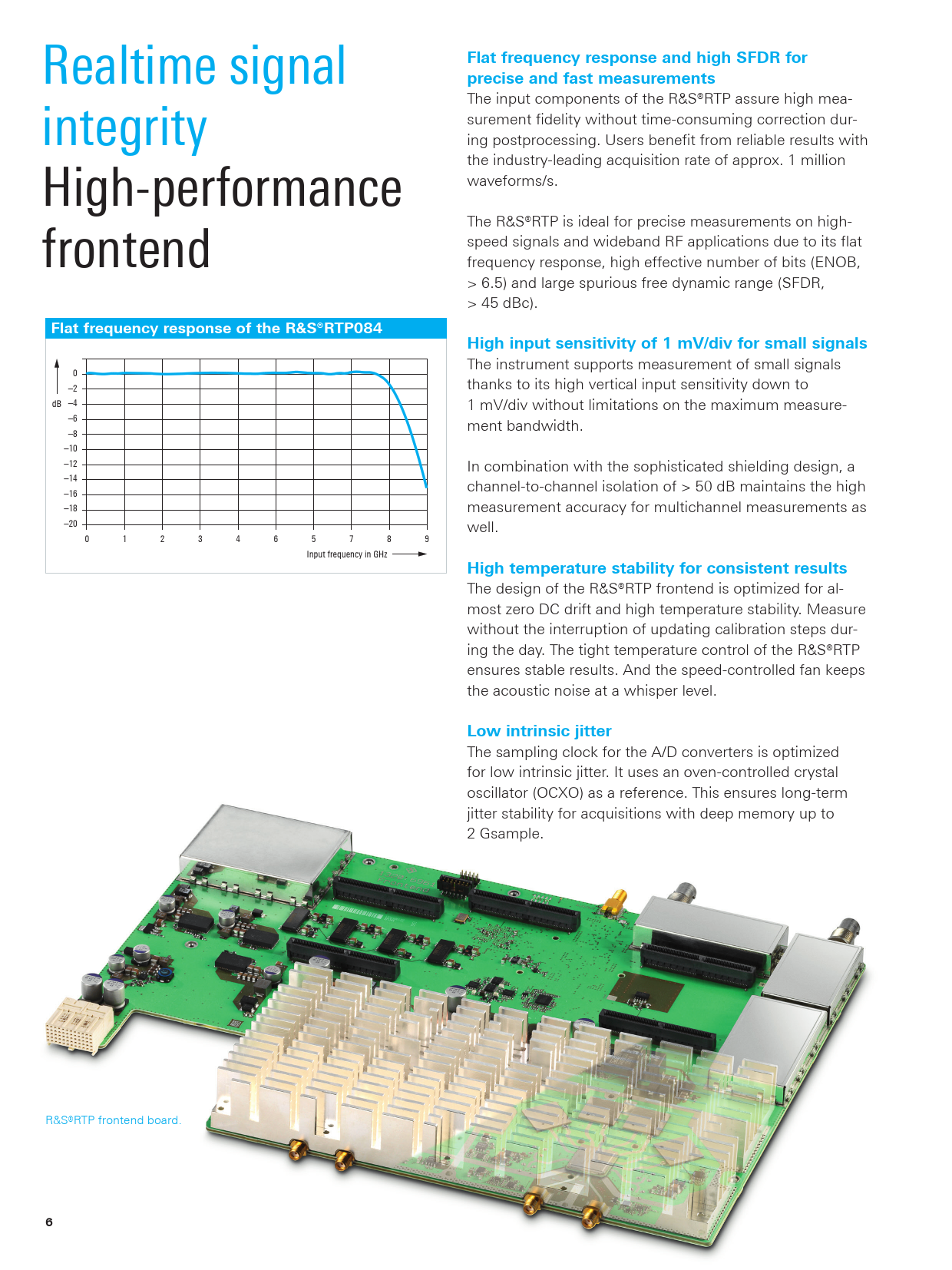 Flat frequency response and high SFDR for Realtime signal precise and fast measurements The input components of the R&S®RTP assure high mea- surement fidelity without time-consuming correction dur- integrity ing postprocessing. Users benefit from reliable results with the industry-leading acquisition rate of approx. 1 million waveforms/s. High-performance The R&S®RTP is ideal for precise measurements on high- speed signals and wideband RF applications due to its flat frontend frequency response, high effective number of bits (ENOB, > 6.5) and large spurious free dynamic range (SFDR, > 45 dBc). Flat frequency response of the R&S®RTP084High input sensitivity of 1 mV/div for small signals The instrument supports measurement of small signals 0 –2 thanks to its high vertical input sensitivity down to dB –4 1 mV/div without limitations on the maximum measure- –6 ment bandwidth. –8 –10 –12 In combination with the sophisticated shielding design, a –14 channel-to-channel isolation of > 50 dB maintains the high –16 –18 measurement accuracy for multichannel measurements as –20 well. 0 1 2 3 4 6 5 7 8 9 Input frequency in GHz High temperature stability for consistent results The design of the R&S®RTP frontend is optimized for al- most zero DC drift and high temperature stability. Measure without the interruption of updating calibration steps dur- ing the day. The tight temperature control of the R&S®RTP ensures stable results. And the speed-controlled fan keeps the acoustic noise at a whisper level. Low intrinsic jitter The sampling clock for the A/D converters is optimized for low intrinsic jitter. It uses an oven-controlled crystal oscillator (OCXO) as a reference. This ensures long-term jitter stability for acquisitions with deep memory up to 2 Gsample. R&S®RTP frontend board. 6 RTP_bro_en_5215-4152_12_v0102.indd 6 07.06.2018 13:43:14