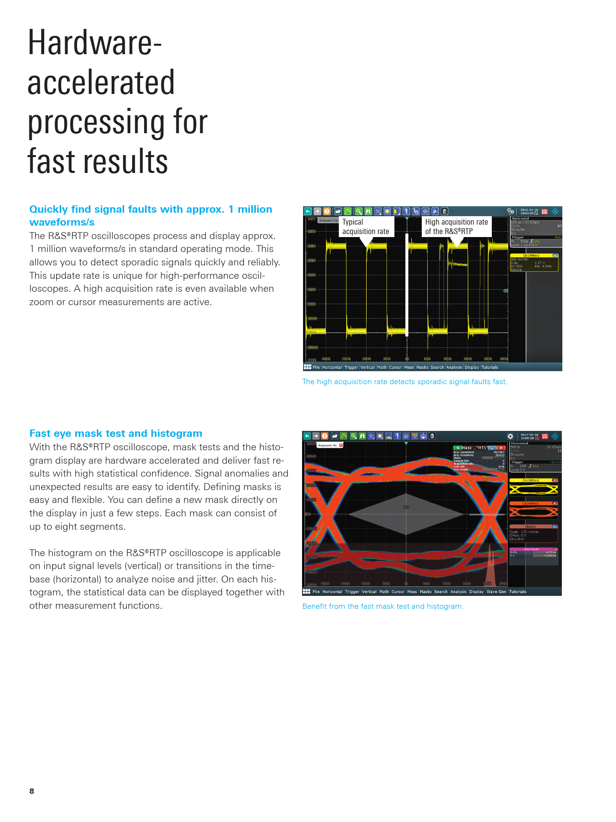 Hardware- accelerated processing for fast results Quickly find signal faults with approx. 1 million waveforms/s Typical High acquisition rate acquisition rate of the R&S®RTP The R&S®RTP oscilloscopes process and display approx. 1 million waveforms/s in standard operating mode. This allows you to detect sporadic signals quickly and reliably. This update rate is unique for high-performance oscil- loscopes. A high acquisition rate is even available when zoom or cursor measurements are active. The high acquisition rate detects sporadic signal faults fast. Fast eye mask test and histogram With the R&S®RTP oscilloscope, mask tests and the histo- gram display are hardware accelerated and deliver fast re- sults with high statistical confidence. Signal anomalies and unexpected results are easy to identify. Defining masks is easy and flexible. You can define a new mask directly on the display in just a few steps. Each mask can consist of up to eight segments. The histogram on the R&S®RTP oscilloscope is applicable on input signal levels (vertical) or transitions in the time- base (horizontal) to analyze noise and jitter. On each his- togram, the statistical data can be displayed together with other measurement functions. Benefit from the fast mask test and histogram. 8 RTP_bro_en_5215-4152_12_v0102.indd 8 07.06.2018 13:43:16