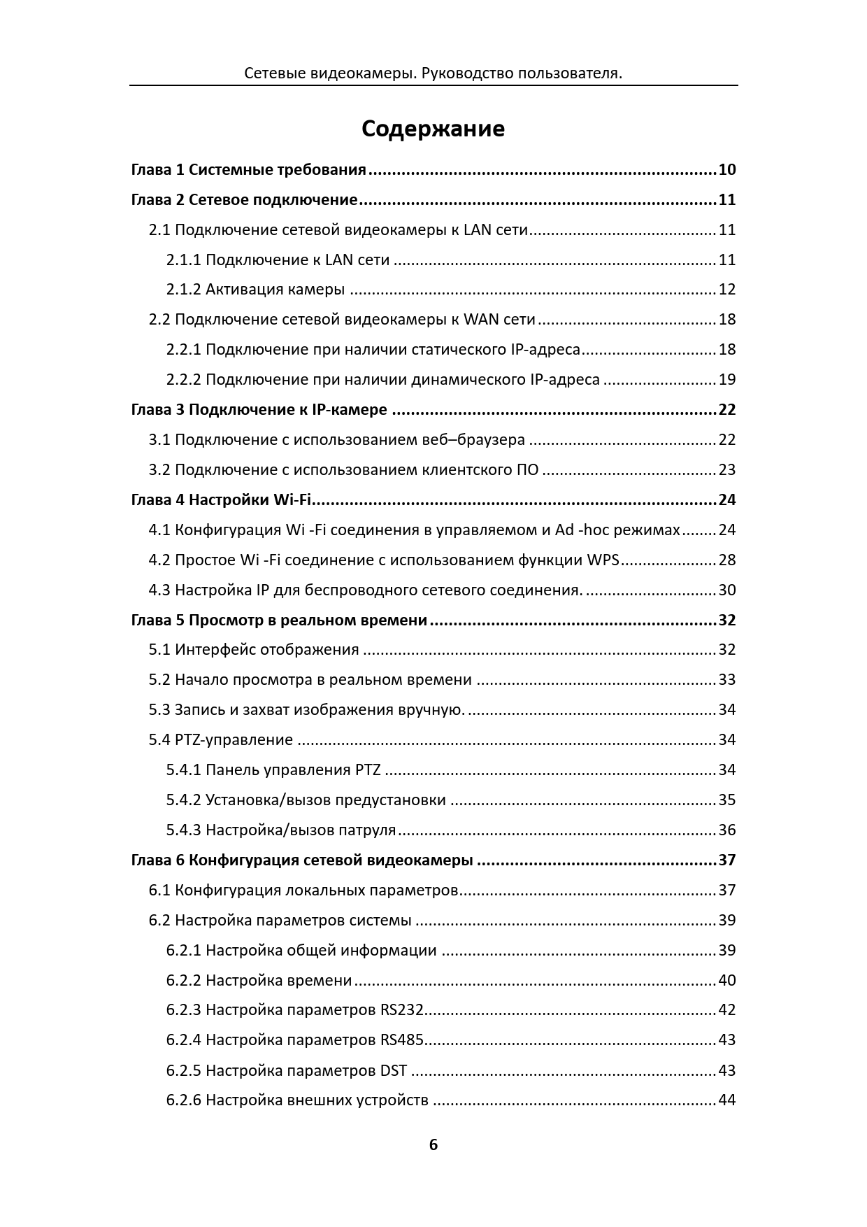 link to page 11 link to page 12 link to page 12 link to page 12 link to page 13 link to page 19 link to page 19 link to page 20 link to page 23 link to page 23 link to page 24 link to page 25 link to page 25 link to page 29 link to page 31 link to page 33 link to page 33 link to page 34 link to page 35 link to page 35 link to page 35 link to page 36 link to page 37 link to page 38 link to page 38 link to page 40 link to page 40 link to page 41 link to page 43 link to page 44 link to page 44 link to page 45 Сетевые видеокамеры. Руководство пользователя. СодержаниеГлава 1 Системные требования .. 10Глава 2 Сетевое подключение .. 11 2.1 Подключение сетевой видеокамеры к LAN сети ... 11 2.1.1 Подключение к LAN сети .. 11 2.1.2 Активация камеры .. 12 2.2 Подключение сетевой видеокамеры к WAN сети ... 18 2.2.1 Подключение при наличии статического IP-адреса ... 18 2.2.2 Подключение при наличии динамического IP-адреса .. 19 Глава 3 Подключение к IP-камере ... 22 3.1 Подключение с использованием веб–браузера ... 22 3.2 Подключение с использованием клиентского ПО .. 23 Глава 4 Настройки Wi-Fi .. 24 4.1 Конфигурация Wi -Fi соединения в управляемом и Ad -hoc режимах .. 24 4.2 Простое Wi -Fi соединение с использованием функции WPS .. 28 4.3 Настройка IP для беспроводного сетевого соединения. .. 30 Глава 5 Просмотр в реальном времени ... 32 5.1 Интерфейс отображения ... 32 5.2 Начало просмотра в реальном времени ... 33 5.3 Запись и захват изображения вручную. ... 34 5.4 PTZ-управление .. 34 5.4.1 Панель управления PTZ .. 34 5.4.2 Установка/вызов предустановки ... 35 5.4.3 Настройка/вызов патруля ... 36 Глава 6 Конфигурация сетевой видеокамеры ... 37 6.1 Конфигурация локальных параметров ... 37 6.2 Настройка параметров системы ... 39 6.2.1 Настройка общей информации ... 39 6.2.2 Настройка времени ... 40 6.2.3 Настройка параметров RS232... 42 6.2.4 Настройка параметров RS485... 43 6.2.5 Настройка параметров DST .. 43 6.2.6 Настройка внешних устройств ... 44 6