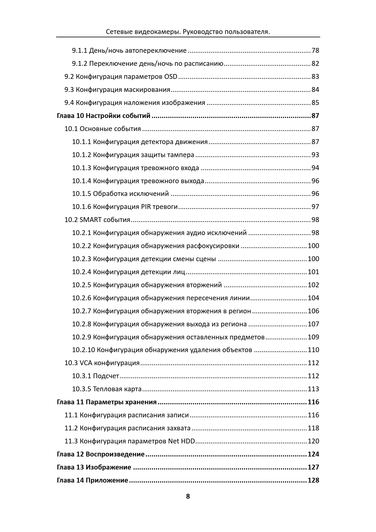 link to page 79 link to page 83 link to page 84 link to page 85 link to page 86 link to page 88 link to page 88 link to page 88 link to page 94 link to page 95 link to page 97 link to page 97 link to page 98 link to page 99 link to page 99 link to page 101 link to page 101 link to page 102 link to page 103 link to page 105 link to page 107 link to page 108 link to page 110 link to page 111 link to page 113 link to page 113 link to page 114 link to page 117 link to page 117 link to page 119 link to page 121 link to page 125 link to page 128 link to page 129 Сетевые видеокамеры. Руководство пользователя. 9.1.1 День/ночь автопереключение ... 78 9.1.2 Переключение день/ночь по расписанию .. 82 9.2 Конфигурация параметров OSD .. 83 9.3 Конфигурация маскирования .. 84 9.4 Конфигурация наложения изображения ... 85 Глава 10 Настройки событий .. 87 10.1 Основные события ... 87 10.1.1 Конфигурация детектора движения .. 87 10.1.2 Конфигурация защиты тампера ... 93 10.1.3 Конфигурация тревожного входа .. 94 10.1.4 Конфигурация тревожного выхода .. 96 10.1.5 Обработка исключений .. 96 10.1.6 Конфигурация PIR тревоги .. 97 10.2 SMART события ... 98 10.2.1 Конфигурация обнаружения аудио исключений ... 98 10.2.2 Конфигурация обнаружения расфокусировки ... 100 10.2.3 Конфигурация детекции смены сцены ... 100 10.2.4 Конфигурация детекции лиц .. 101 10.2.5 Конфигурация обнаружения вторжений .. 102 10.2.6 Конфигурация обнаружения пересечения линии .. 104 10.2.7 Конфигурация обнаружения вторжения в регион ... 106 10.2.8 Конфигурация обнаружения выхода из региона ... 107 10.2.9 Конфигурация обнаружения оставленных предметов .. 109 10.2.10 Конфигурация обнаружения удаления объектов .. 110 10.3 VCA конфигурация .. 112 10.3.1 Подсчет ... 112 10.3.5 Тепловая карта ... 113 Глава 11 Параметры хранения ... 116 11.1 Конфигурация расписания записи .. 116 11.2 Конфигурация расписания захвата ... 118 11.3 Конфигурация параметров Net HDD ... 120 Глава 12 Воспроизведение ... 124Глава 13 Изображение ... 127Глава 14 Приложение ... 1288