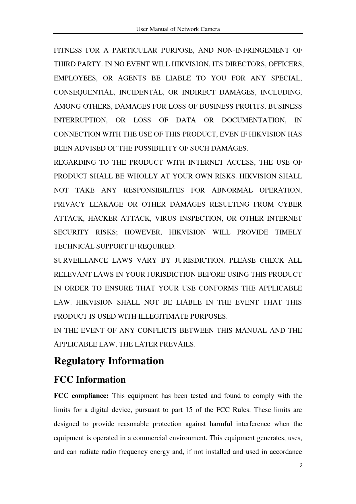 User Manual of Network Camera FITNESS FOR A PARTICULAR PURPOSE, AND NON-INFRINGEMENT OF THIRD PARTY. IN NO EVENT WILL HIKVISION, ITS DIRECTORS, OFFICERS, EMPLOYEES, OR AGENTS BE LIABLE TO YOU FOR ANY SPECIAL, CONSEQUENTIAL, INCIDENTAL, OR INDIRECT DAMAGES, INCLUDING, AMONG OTHERS, DAMAGES FOR LOSS OF BUSINESS PROFITS, BUSINESS INTERRUPTION, OR LOSS OF DATA OR DOCUMENTATION, IN CONNECTION WITH THE USE OF THIS PRODUCT, EVEN IF HIKVISION HAS BEEN ADVISED OF THE POSSIBILITY OF SUCH DAMAGES. REGARDING TO THE PRODUCT WITH INTERNET ACCESS, THE USE OF PRODUCT SHALL BE WHOLLY AT YOUR OWN RISKS. HIKVISION SHALL NOT TAKE ANY RESPONSIBILITES FOR ABNORMAL OPERATION, PRIVACY LEAKAGE OR OTHER DAMAGES RESULTING FROM CYBER ATTACK, HACKER ATTACK, VIRUS INSPECTION, OR OTHER INTERNET SECURITY RISKS; HOWEVER, HIKVISION WILL PROVIDE TIMELY TECHNICAL SUPPORT IF REQUIRED. SURVEILLANCE LAWS VARY BY JURISDICTION. PLEASE CHECK ALL RELEVANT LAWS IN YOUR JURISDICTION BEFORE USING THIS PRODUCT IN ORDER TO ENSURE THAT YOUR USE CONFORMS THE APPLICABLE LAW. HIKVISION SHALL NOT BE LIABLE IN THE EVENT THAT THIS PRODUCT IS USED WITH ILLEGITIMATE PURPOSES. IN THE EVENT OF ANY CONFLICTS BETWEEN THIS MANUAL AND THE APPLICABLE LAW, THE LATER PREVAILS. Regulatory InformationFCC InformationFCC compliance: This equipment has been tested and found to comply with the limits for a digital device, pursuant to part 15 of the FCC Rules. These limits are designed to provide reasonable protection against harmful interference when the equipment is operated in a commercial environment. This equipment generates, uses, and can radiate radio frequency energy and, if not installed and used in accordance 3 Document Outline Chapter 1 System Requirement Chapter 2 Network Connection 2.1 Setting the Network Camera over the LAN 2.1.1 Wiring over the LAN 2.1.2 Activating the Camera 2.2 Setting the Network Camera over the WAN 2.2.1 Static IP Connection 2.2.2 Dynamic IP Connection Chapter 3 Access to the Network Camera 3.1 Accessing by Web Browsers 3.2 Accessing by Client Software Chapter 4 Wi-Fi Settings 4.1 Configuring Wi-Fi Connection in Manage and Ad-hoc Modes 4.2 Easy Wi-Fi Connection with WPS function 4.3 IP Property Settings for Wireless Network Connection Chapter 5 Live View 5.1 Live View Page 5.2 Starting Live View 5.3 Recording and Capturing Pictures Manually 5.4 Operating PTZ Control 5.4.1 PTZ Control Panel 5.4.2 Setting / Calling a Preset 5.4.3 Setting / Calling a Patrol Chapter 6 Network Camera Configuration 6.1 Configuring Local Parameters 6.2 Configuring Time Settings 6.3 Configuring Network Settings 6.3.1 Configuring TCP/IP Settings 6.3.2 Configuring Port Settings 6.3.3 Configuring PPPoE Settings 6.3.4 Configuring DDNS Settings 6.3.5 Configuring SNMP Settings 6.3.6 Configuring 802.1X Settings 6.3.7 Configuring QoS Settings 6.3.8 Configuring UPnP™ Settings 6.3.9 Configuring Wireless Dial Settings 6.3.10 Email Sending Triggered by Alarm 6.3.11 Configuring NAT (Network Address Translation) Settings 6.3.12 Configuring FTP Settings 6.3.13 Platform Access 6.3.14 HTTPS Settings 6.4 Configuring Video and Audio Settings 6.4.1 Configuring Video Settings 6.4.2 Configuring Audio Settings 6.4.3 Configuring ROI Encoding 6.4.4 Display Information on Stream 6.4.5 Configuring Target Cropping 6.5 Configuring Image Parameters 6.5.1 Configuring Display Settings 6.5.2 Configuring OSD Settings 6.5.3 Configuring Text Overlay Settings 6.5.4 Configuring Privacy Mask 6.5.5 Configuring Picture Overlay 6.6 Configuring and Handling Alarms 6.6.1 Configuring Motion Detection 6.6.2 Configuring Video Tampering Alarm 6.6.3 Configuring Alarm Input 6.6.4 Configuring Alarm Output 6.6.5 Handling Exception 6.6.6 Configuring Other Alarm 6.6.7 Configuring Audio Exception Detection 6.6.8 Configuring Defocus Detection 6.6.9 Configuring Scene Change Detection 6.6.10 Configuring Face Detection 6.6.11 Configuring Line Crossing Detection 6.6.12 Configuring Intrusion Detection 6.6.13 Configuring Region Entrance Detection 6.6.14 Configuring Region Exiting Detection 6.6.15 Configuring Unattended Baggage Detection 6.6.16 Configuring Object Removal Detection 6.7 VCA Configuration 6.7.1 Behavior Analysis 6.7.2 Face Capture 6.7.3 Heat Map 6.7.4 People Counting Chapter 7 Storage Settings 7.1 Configuring NAS Settings 7.2 Configuring Recording Schedule 7.3 Configuring Snapshot Settings 7.4 Configuring Lite Storage 7.5 Configuring Cloud Storage Chapter 8 Counting Chapter 9 Road Traffic Chapter 10 Playback Chapter 11 Log Searching Chapter 12 Others 12.1 Managing User Accounts 12.2 Authentication 12.3 Anonymous Visit 12.4 IP Address Filter 12.5 Security Service 12.6 Viewing Device Information 12.7 Maintenance 12.7.1 Rebooting the Camera 12.7.2 Restoring Default Settings 12.7.3 Exporting / Importing Configuration File 12.7.4 Upgrading the System 12.8 RS-232 Settings 12.9 RS-485 Settings 12.10 Service Settings Appendix Appendix 1 SADP Software Introduction Appendix 2 Port Mapping