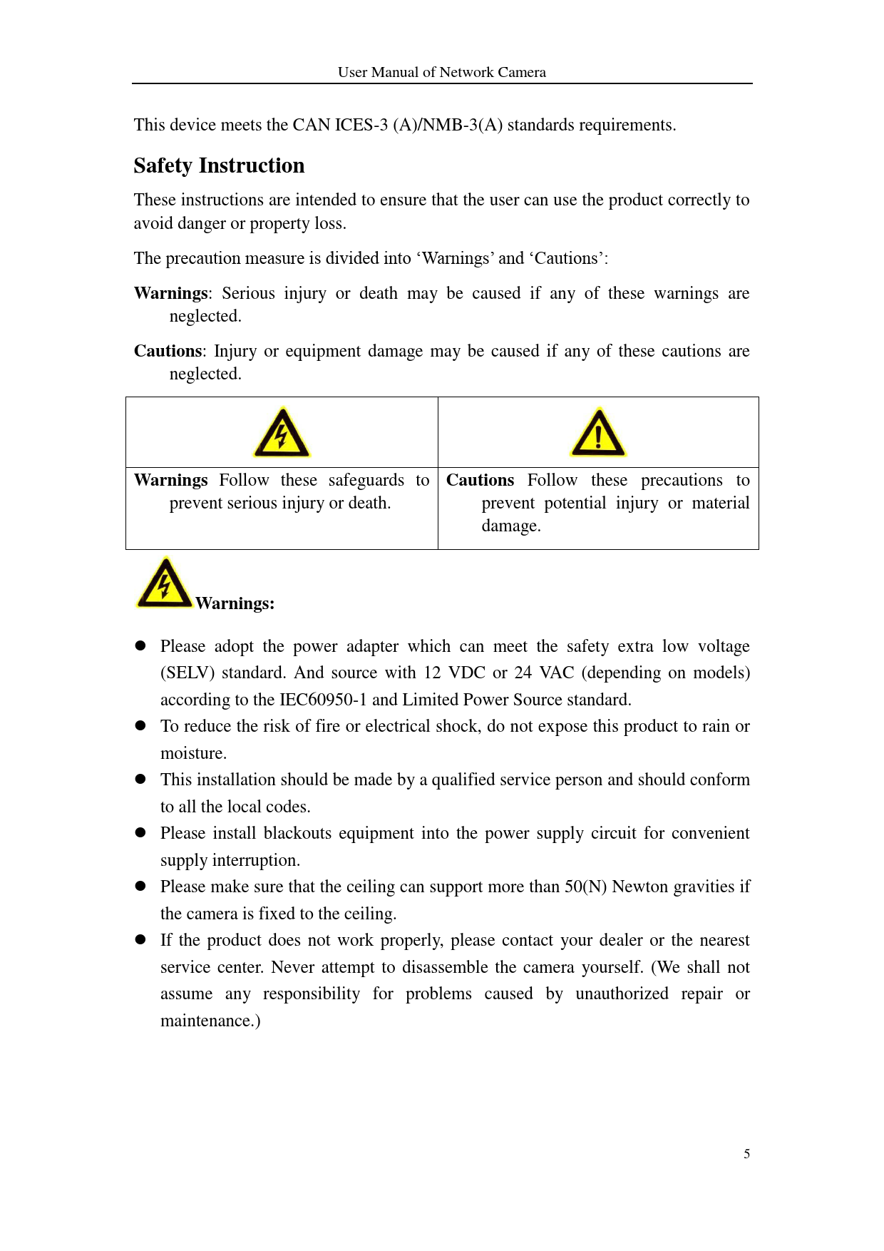 User Manual of Network Camera This device meets the CAN ICES-3 (A)/NMB-3(A) standards requirements. Safety Instruction These instructions are intended to ensure that the user can use the product correctly to avoid danger or property loss. The precaution measure is divided into ‘Warnings’ and ‘Cautions’: Warnings : Serious injury or death may be caused if any of these warnings are neglected. Cautions : Injury or equipment damage may be caused if any of these cautions are neglected. Warnings Follow these safeguards to Cautions Follow these precautions to prevent serious injury or death. prevent potential injury or material damage. Warnings: Please adopt the power adapter which can meet the safety extra low voltage (SELV) standard. And source with 12 VDC or 24 VAC (depending on models) according to the IEC60950-1 and Limited Power Source standard. To reduce the risk of fire or electrical shock, do not expose this product to rain or moisture. This installation should be made by a qualified service person and should conform to all the local codes. Please install blackouts equipment into the power supply circuit for convenient supply interruption. Please make sure that the ceiling can support more than 50(N) Newton gravities if the camera is fixed to the ceiling. If the product does not work properly, please contact your dealer or the nearest service center. Never attempt to disassemble the camera yourself. (We shall not assume any responsibility for problems caused by unauthorized repair or maintenance.) 5 Document Outline Chapter 1 System Requirement Chapter 2 Network Connection 2.1 Setting the Network Camera over the LAN 2.1.1 Wiring over the LAN 2.1.2 Activating the Camera 2.2 Setting the Network Camera over the WAN 2.2.1 Static IP Connection 2.2.2 Dynamic IP Connection Chapter 3 Access to the Network Camera 3.1 Accessing by Web Browsers 3.2 Accessing by Client Software Chapter 4 Wi-Fi Settings 4.1 Configuring Wi-Fi Connection in Manage and Ad-hoc Modes 4.2 Easy Wi-Fi Connection with WPS function 4.3 IP Property Settings for Wireless Network Connection Chapter 5 Live View 5.1 Live View Page 5.2 Starting Live View 5.3 Recording and Capturing Pictures Manually 5.4 Operating PTZ Control 5.4.1 PTZ Control Panel 5.4.2 Setting / Calling a Preset 5.4.3 Setting / Calling a Patrol Chapter 6 Network Camera Configuration 6.1 Configuring Local Parameters 6.2 Configuring Time Settings 6.3 Configuring Network Settings 6.3.1 Configuring TCP/IP Settings 6.3.2 Configuring Port Settings 6.3.3 Configuring PPPoE Settings 6.3.4 Configuring DDNS Settings 6.3.5 Configuring SNMP Settings 6.3.6 Configuring 802.1X Settings 6.3.7 Configuring QoS Settings 6.3.8 Configuring UPnP™ Settings 6.3.9 Configuring Wireless Dial Settings 6.3.10 Email Sending Triggered by Alarm 6.3.11 Configuring NAT (Network Address Translation) Settings 6.3.12 Configuring FTP Settings 6.3.13 Platform Access 6.3.14 HTTPS Settings 6.4 Configuring Video and Audio Settings 6.4.1 Configuring Video Settings 6.4.2 Configuring Audio Settings 6.4.3 Configuring ROI Encoding 6.4.4 Display Information on Stream 6.4.5 Configuring Target Cropping 6.5 Configuring Image Parameters 6.5.1 Configuring Display Settings 6.5.2 Configuring OSD Settings 6.5.3 Configuring Text Overlay Settings 6.5.4 Configuring Privacy Mask 6.5.5 Configuring Picture Overlay 6.6 Configuring and Handling Alarms 6.6.1 Configuring Motion Detection 6.6.2 Configuring Video Tampering Alarm 6.6.3 Configuring Alarm Input 6.6.4 Configuring Alarm Output 6.6.5 Handling Exception 6.6.6 Configuring Other Alarm 6.6.7 Configuring Audio Exception Detection 6.6.8 Configuring Defocus Detection 6.6.9 Configuring Scene Change Detection 6.6.10 Configuring Face Detection 6.6.11 Configuring Line Crossing Detection 6.6.12 Configuring Intrusion Detection 6.6.13 Configuring Region Entrance Detection 6.6.14 Configuring Region Exiting Detection 6.6.15 Configuring Unattended Baggage Detection 6.6.16 Configuring Object Removal Detection 6.7 VCA Configuration 6.7.1 Behavior Analysis 6.7.2 Face Capture 6.7.3 Heat Map 6.7.4 People Counting Chapter 7 Storage Settings 7.1 Configuring NAS Settings 7.2 Configuring Recording Schedule 7.3 Configuring Snapshot Settings 7.4 Configuring Lite Storage 7.5 Configuring Cloud Storage Chapter 8 Counting Chapter 9 Road Traffic Chapter 10 Playback Chapter 11 Log Searching Chapter 12 Others 12.1 Managing User Accounts 12.2 Authentication 12.3 Anonymous Visit 12.4 IP Address Filter 12.5 Security Service 12.6 Viewing Device Information 12.7 Maintenance 12.7.1 Rebooting the Camera 12.7.2 Restoring Default Settings 12.7.3 Exporting / Importing Configuration File 12.7.4 Upgrading the System 12.8 RS-232 Settings 12.9 RS-485 Settings 12.10 Service Settings Appendix Appendix 1 SADP Software Introduction Appendix 2 Port Mapping