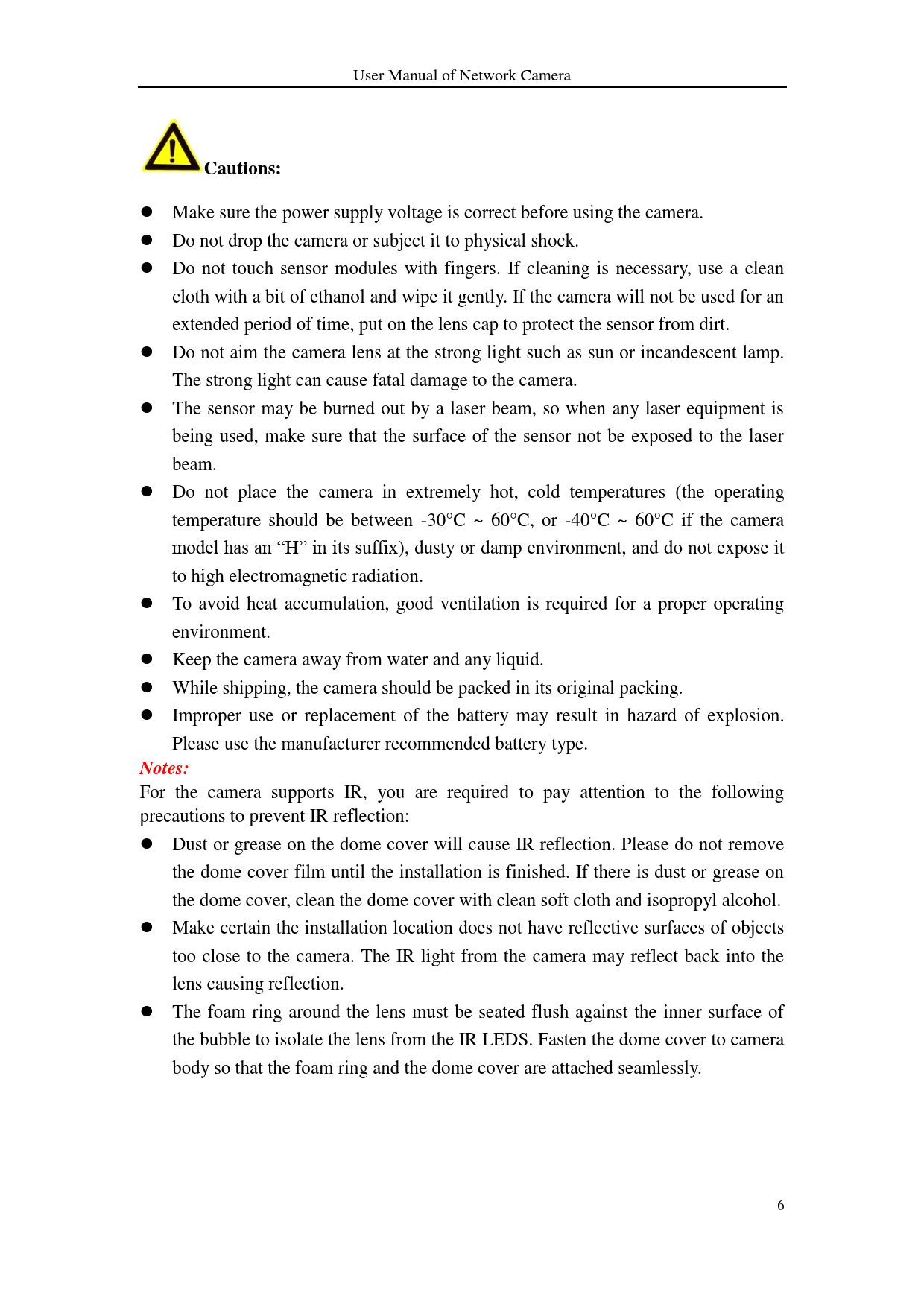 User Manual of Network Camera Cautions: Make sure the power supply voltage is correct before using the camera. Do not drop the camera or subject it to physical shock. Do not touch sensor modules with fingers. If cleaning is necessary, use a clean cloth with a bit of ethanol and wipe it gently. If the camera will not be used for an extended period of time, put on the lens cap to protect the sensor from dirt. Do not aim the camera lens at the strong light such as sun or incandescent lamp. The strong light can cause fatal damage to the camera. The sensor may be burned out by a laser beam, so when any laser equipment is being used, make sure that the surface of the sensor not be exposed to the laser beam. Do not place the camera in extremely hot, cold temperatures (the operating temperature should be between -30°C ~ 60°C, or -40°C ~ 60°C if the camera model has an “H” in its suffix), dusty or damp environment, and do not expose it to high electromagnetic radiation. To avoid heat accumulation, good ventilation is required for a proper operating environment. Keep the camera away from water and any liquid. While shipping, the camera should be packed in its original packing. Improper use or replacement of the battery may result in hazard of explosion. Please use the manufacturer recommended battery type. Notes: For the camera supports IR, you are required to pay attention to the following precautions to prevent IR reflection: Dust or grease on the dome cover will cause IR reflection. Please do not remove the dome cover film until the installation is finished. If there is dust or grease on the dome cover, clean the dome cover with clean soft cloth and isopropyl alcohol. Make certain the installation location does not have reflective surfaces of objects too close to the camera. The IR light from the camera may reflect back into the lens causing reflection. The foam ring around the lens must be seated flush against the inner surface of the bubble to isolate the lens from the IR LEDS. Fasten the dome cover to camera body so that the foam ring and the dome cover are attached seamlessly. 6 Document Outline Chapter 1 System Requirement Chapter 2 Network Connection 2.1 Setting the Network Camera over the LAN 2.1.1 Wiring over the LAN 2.1.2 Activating the Camera 2.2 Setting the Network Camera over the WAN 2.2.1 Static IP Connection 2.2.2 Dynamic IP Connection Chapter 3 Access to the Network Camera 3.1 Accessing by Web Browsers 3.2 Accessing by Client Software Chapter 4 Wi-Fi Settings 4.1 Configuring Wi-Fi Connection in Manage and Ad-hoc Modes 4.2 Easy Wi-Fi Connection with WPS function 4.3 IP Property Settings for Wireless Network Connection Chapter 5 Live View 5.1 Live View Page 5.2 Starting Live View 5.3 Recording and Capturing Pictures Manually 5.4 Operating PTZ Control 5.4.1 PTZ Control Panel 5.4.2 Setting / Calling a Preset 5.4.3 Setting / Calling a Patrol Chapter 6 Network Camera Configuration 6.1 Configuring Local Parameters 6.2 Configuring Time Settings 6.3 Configuring Network Settings 6.3.1 Configuring TCP/IP Settings 6.3.2 Configuring Port Settings 6.3.3 Configuring PPPoE Settings 6.3.4 Configuring DDNS Settings 6.3.5 Configuring SNMP Settings 6.3.6 Configuring 802.1X Settings 6.3.7 Configuring QoS Settings 6.3.8 Configuring UPnP™ Settings 6.3.9 Configuring Wireless Dial Settings 6.3.10 Email Sending Triggered by Alarm 6.3.11 Configuring NAT (Network Address Translation) Settings 6.3.12 Configuring FTP Settings 6.3.13 Platform Access 6.3.14 HTTPS Settings 6.4 Configuring Video and Audio Settings 6.4.1 Configuring Video Settings 6.4.2 Configuring Audio Settings 6.4.3 Configuring ROI Encoding 6.4.4 Display Information on Stream 6.4.5 Configuring Target Cropping 6.5 Configuring Image Parameters 6.5.1 Configuring Display Settings 6.5.2 Configuring OSD Settings 6.5.3 Configuring Text Overlay Settings 6.5.4 Configuring Privacy Mask 6.5.5 Configuring Picture Overlay 6.6 Configuring and Handling Alarms 6.6.1 Configuring Motion Detection 6.6.2 Configuring Video Tampering Alarm 6.6.3 Configuring Alarm Input 6.6.4 Configuring Alarm Output 6.6.5 Handling Exception 6.6.6 Configuring Other Alarm 6.6.7 Configuring Audio Exception Detection 6.6.8 Configuring Defocus Detection 6.6.9 Configuring Scene Change Detection 6.6.10 Configuring Face Detection 6.6.11 Configuring Line Crossing Detection 6.6.12 Configuring Intrusion Detection 6.6.13 Configuring Region Entrance Detection 6.6.14 Configuring Region Exiting Detection 6.6.15 Configuring Unattended Baggage Detection 6.6.16 Configuring Object Removal Detection 6.7 VCA Configuration 6.7.1 Behavior Analysis 6.7.2 Face Capture 6.7.3 Heat Map 6.7.4 People Counting Chapter 7 Storage Settings 7.1 Configuring NAS Settings 7.2 Configuring Recording Schedule 7.3 Configuring Snapshot Settings 7.4 Configuring Lite Storage 7.5 Configuring Cloud Storage Chapter 8 Counting Chapter 9 Road Traffic Chapter 10 Playback Chapter 11 Log Searching Chapter 12 Others 12.1 Managing User Accounts 12.2 Authentication 12.3 Anonymous Visit 12.4 IP Address Filter 12.5 Security Service 12.6 Viewing Device Information 12.7 Maintenance 12.7.1 Rebooting the Camera 12.7.2 Restoring Default Settings 12.7.3 Exporting / Importing Configuration File 12.7.4 Upgrading the System 12.8 RS-232 Settings 12.9 RS-485 Settings 12.10 Service Settings Appendix Appendix 1 SADP Software Introduction Appendix 2 Port Mapping