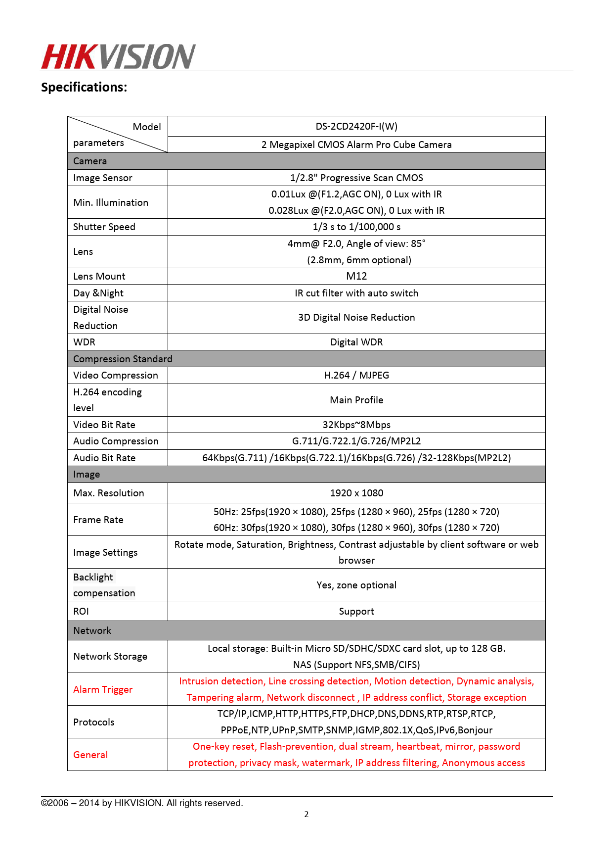 Datasheet DS-2CD2420F-I(W) (Hikvision) - 2
