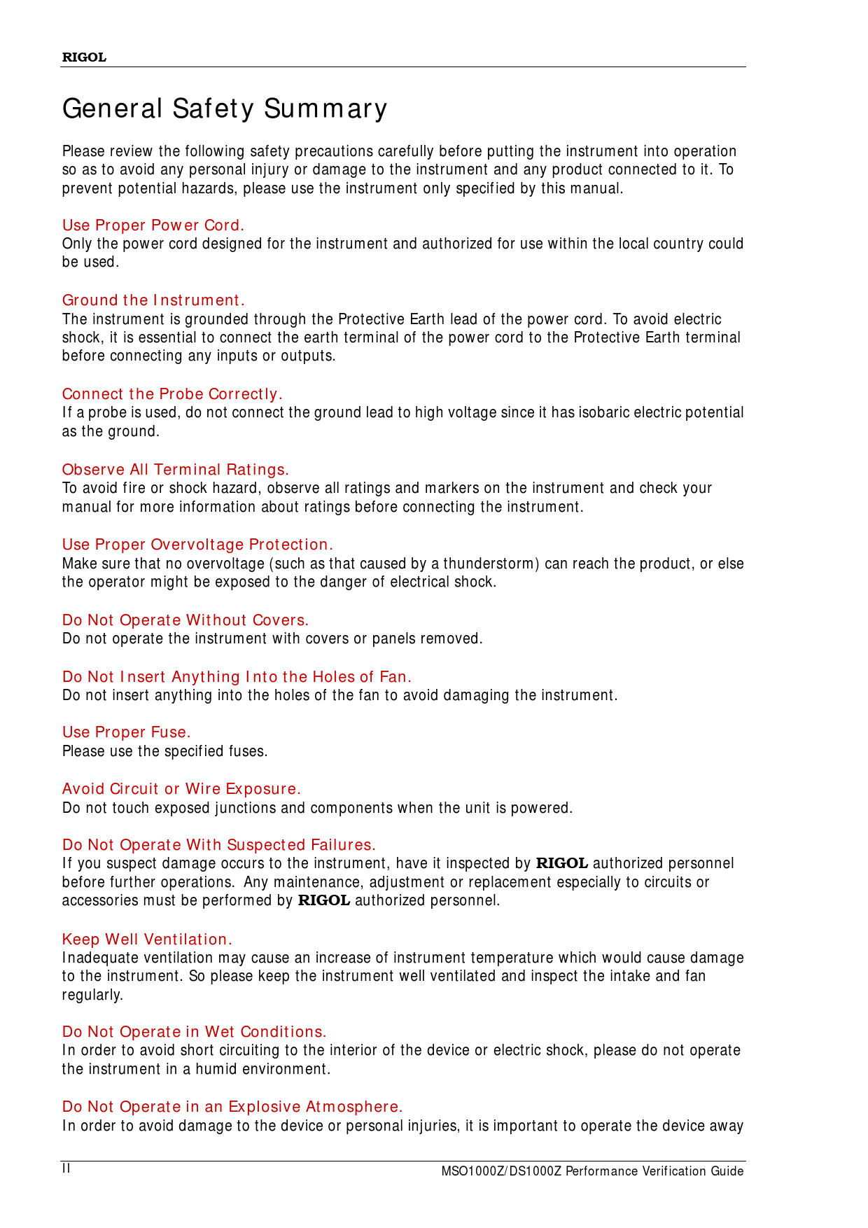 RIGOLGeneral Safety Summary Please review the fol owing safety precautions carefully before putting the instrument into operation so as to avoid any personal injury or damage to the instrument and any product connected to it. To prevent potential hazards, please use the instrument only specified by this manual. Use Proper Power Cord. Only the power cord designed for the instrument and authorized for use within the local country could be used. Ground the Instrument. The instrument is grounded through the Protective Earth lead of the power cord. To avoid electric shock, it is essential to connect the earth terminal of the power cord to the Protective Earth terminal before connecting any inputs or outputs. Connect the Probe Correctly. If a probe is used, do not connect the ground lead to high voltage since it has isobaric electric potential as the ground. Observe All Terminal Ratings. To avoid fire or shock hazard, observe al ratings and markers on the instrument and check your manual for more information about ratings before connecting the instrument. Use Proper Overvoltage Protection. Make sure that no overvoltage (such as that caused by a thunderstorm) can reach the product, or else the operator might be exposed to the danger of electrical shock. Do Not Operate Without Covers. Do not operate the instrument with covers or panels removed. Do Not Insert Anything Into the Holes of Fan. Do not insert anything into the holes of the fan to avoid damaging the instrument. Use Proper Fuse. Please use the specified fuses. Avoid Circuit or Wire Exposure. Do not touch exposed junctions and components when the unit is powered. Do Not Operate With Suspected Failures. If you suspect damage occurs to the instrument, have it inspected by RIGOL authorized personnel before further operations. Any maintenance, adjustment or replacement especial y to circuits or accessories must be performed by RIGOL authorized personnel. Keep Well Ventilation. Inadequate ventilation may cause an increase of instrument temperature which would cause damage to the instrument. So please keep the instrument wel ventilated and inspect the intake and fan regularly. Do Not Operate in Wet Conditions. In order to avoid short circuiting to the interior of the device or electric shock, please do not operate the instrument in a humid environment. Do Not Operate in an Explosive Atmosphere. In order to avoid damage to the device or personal injuries, it is important to operate the device away II MSO1000Z/DS1000Z Performance Verification Guide Document Outline Guaranty and Declaration General Safety Summary Safety Terms and Symbols Allgemeine Sicherheits Informationen Sicherheits Begriffe und Symbole Document Overview Overview Test Preparations Self-test Self-calibration Test Result Record Specifications Performance Verification Test Impedance Test Specification Test Connection Diagram Test Procedures Test Record Form DC Gain Accuracy Test Specification Test Connection Diagram Test Procedures Test Record Form Bandwidth Test Specification Test Connection Diagram Test Procedures Test Record Form Bandwidth Limit Test Specification Test Connection Diagram Test Procedures Test Record Form Time Base Accuracy Test Specification Test Connection Diagram Test Procedures Test Record Form Zero Point Offset Test Specification Test Connection Diagram Test Procedures Test Record Form Appendix Test Record Form