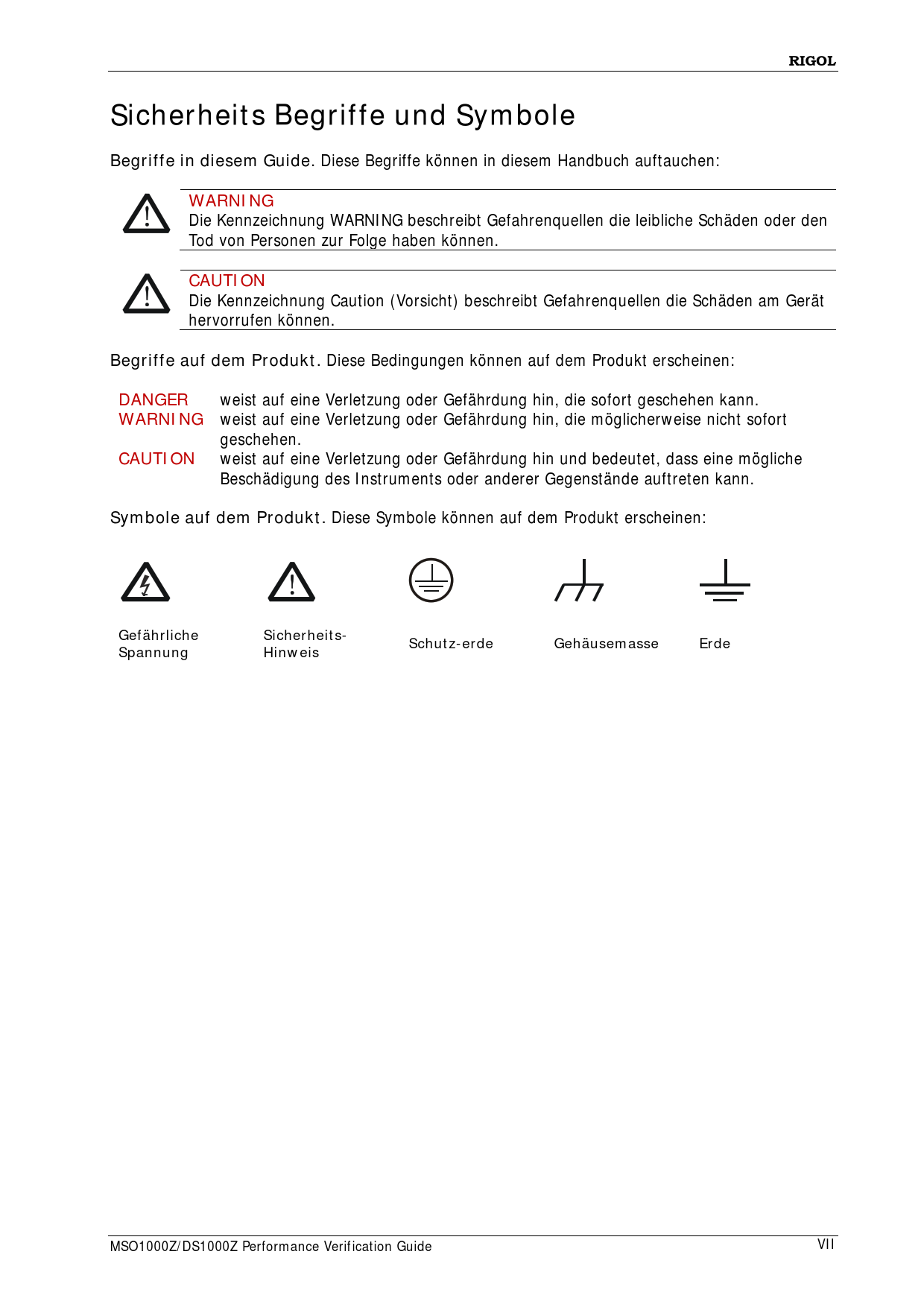 RIGOLSicherheits Begriffe und SymboleBegriffe in diesem Guide. Diese Begriffe können in diesem Handbuch auftauchen: WARNING Die Kennzeichnung WARNING beschreibt Gefahrenquel en die leibliche Schäden oder den Tod von Personen zur Folge haben können. CAUTION Die Kennzeichnung Caution (Vorsicht) beschreibt Gefahrenquel en die Schäden am Gerät hervorrufen können. Begriffe auf dem Produkt. Diese Bedingungen können auf dem Produkt erscheinen: DANGER weist auf eine Verletzung oder Gefährdung hin, die sofort geschehen kann. WARNING weist auf eine Verletzung oder Gefährdung hin, die möglicherweise nicht sofort geschehen. CAUTION weist auf eine Verletzung oder Gefährdung hin und bedeutet, dass eine mögliche Beschädigung des Instruments oder anderer Gegenstände auftreten kann. Symbole auf dem Produkt. Diese Symbole können auf dem Produkt erscheinen: GefährlicheSicherheits-SpannungSchutz-erdeHinweisGehäusemasseErde MSO1000Z/DS1000Z Performance Verification Guide VII Document Outline Guaranty and Declaration General Safety Summary Safety Terms and Symbols Allgemeine Sicherheits Informationen Sicherheits Begriffe und Symbole Document Overview Overview Test Preparations Self-test Self-calibration Test Result Record Specifications Performance Verification Test Impedance Test Specification Test Connection Diagram Test Procedures Test Record Form DC Gain Accuracy Test Specification Test Connection Diagram Test Procedures Test Record Form Bandwidth Test Specification Test Connection Diagram Test Procedures Test Record Form Bandwidth Limit Test Specification Test Connection Diagram Test Procedures Test Record Form Time Base Accuracy Test Specification Test Connection Diagram Test Procedures Test Record Form Zero Point Offset Test Specification Test Connection Diagram Test Procedures Test Record Form Appendix Test Record Form