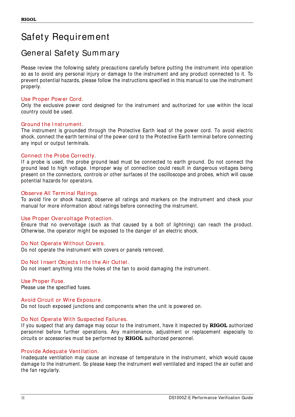 RIGOLSafety RequirementGeneral Safety Summary Please review the fol owing safety precautions carefully before putting the instrument into operation so as to avoid any personal injury or damage to the instrument and any product connected to it. To prevent potential hazards, please fol ow the instructions specified in this manual to use the instrument properly. Use Proper Power Cord. Only the exclusive power cord designed for the instrument and authorized for use within the local country could be used. Ground the Instrument. The instrument is grounded through the Protective Earth lead of the power cord. To avoid electric shock, connect the earth terminal of the power cord to the Protective Earth terminal before connecting any input or output terminals. Connect the Probe Correctly . If a probe is used, the probe ground lead must be connected to earth ground. Do not connect the ground lead to high voltage. Improper way of connection could result in dangerous voltages being present on the connectors, controls or other surfaces of the oscil oscope and probes, which wil cause potential hazards for operators. Observe All Terminal Ratings. To avoid fire or shock hazard, observe al ratings and markers on the instrument and check your manual for more information about ratings before connecting the instrument. Use Proper Overvoltage Protection. Ensure that no overvoltage (such as that caused by a bolt of lightning) can reach the product. Otherwise, the operator might be exposed to the danger of an electric shock. Do Not Operate Without Covers. Do not operate the instrument with covers or panels removed. Do Not Insert Objects Into the Air Outlet. Do not insert anything into the holes of the fan to avoid damaging the instrument. Use Proper Fuse. Please use the specified fuses. Avoid Circuit or Wire Exposure. Do not touch exposed junctions and components when the unit is powered on. Do Not Operate With Suspected Failures. If you suspect that any damage may occur to the instrument, have it inspected by RIGOL authorized personnel before further operations. Any maintenance, adjustment or replacement especial y to circuits or accessories must be performed by RIGOL authorized personnel. Provide Adequate Ventilation. Inadequate ventilation may cause an increase of temperature in the instrument, which would cause damage to the instrument. So please keep the instrument wel ventilated and inspect the air outlet and the fan regularly. II DS1000Z-E Performance Verification Guide Document Outline Guaranty and Declaration Safety Requirement General Safety Summary Safety Notices and Symbols Document Overview Overview Test Preparations Self-test Self-calibration Test Result Record Specifications Performance Verification Test Impedance Test Specification Test Connection Diagram Test Procedures Test Record Form DC Gain Accuracy Test Specification Test Connection Diagram Test Procedures Test Record Form Bandwidth Test Specification Test Connection Diagram Test Procedures Test Record Form Bandwidth Limit Test Specification Test Connection Diagram Test Procedures Test Record Form Time Base Accuracy Test Specification Test Connection Diagram Test Procedures Test Record Form Zero Point Offset Test Specification Test Connection Diagram Test Procedures Test Record Form Appendix Test Record Form