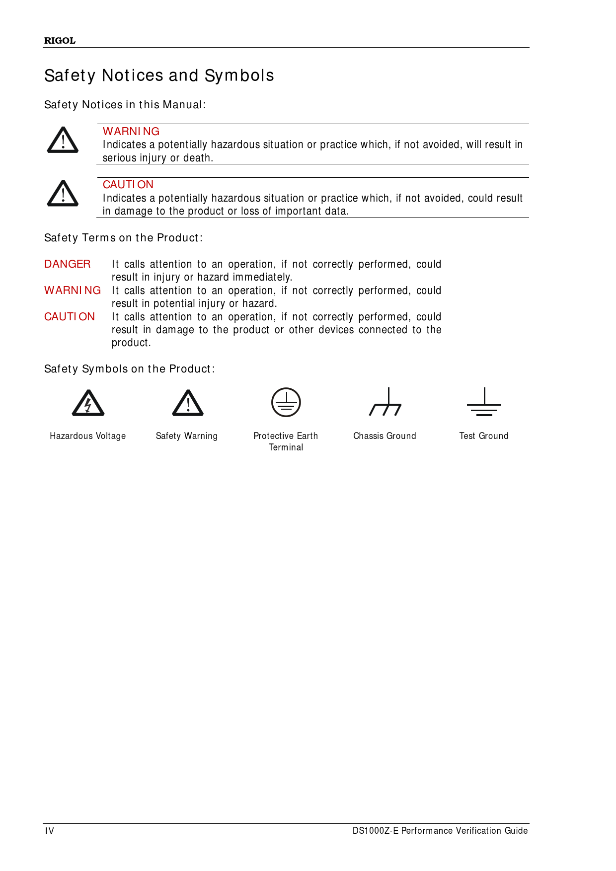 RIGOLSafety Notices and SymbolsSafety Notices in this Manual:WARNING Indicates a potential y hazardous situation or practice which, if not avoided, wil result in serious injury or death. CAUTION Indicates a potential y hazardous situation or practice which, if not avoided, could result in damage to the product or loss of important data. Safety Terms on the Product:DANGER It cal s attention to an operation, if not correctly performed, could result in injury or hazard immediately. WARNING It cal s attention to an operation, if not correctly performed, could result in potential injury or hazard. CAUTION It cal s attention to an operation, if not correctly performed, could result in damage to the product or other devices connected to the product. Safety Symbols on the Product: Hazardous Voltage Safety Warning Protective Earth Chassis Ground Test Ground Terminal IV DS1000Z-E Performance Verification Guide Document Outline Guaranty and Declaration Safety Requirement General Safety Summary Safety Notices and Symbols Document Overview Overview Test Preparations Self-test Self-calibration Test Result Record Specifications Performance Verification Test Impedance Test Specification Test Connection Diagram Test Procedures Test Record Form DC Gain Accuracy Test Specification Test Connection Diagram Test Procedures Test Record Form Bandwidth Test Specification Test Connection Diagram Test Procedures Test Record Form Bandwidth Limit Test Specification Test Connection Diagram Test Procedures Test Record Form Time Base Accuracy Test Specification Test Connection Diagram Test Procedures Test Record Form Zero Point Offset Test Specification Test Connection Diagram Test Procedures Test Record Form Appendix Test Record Form