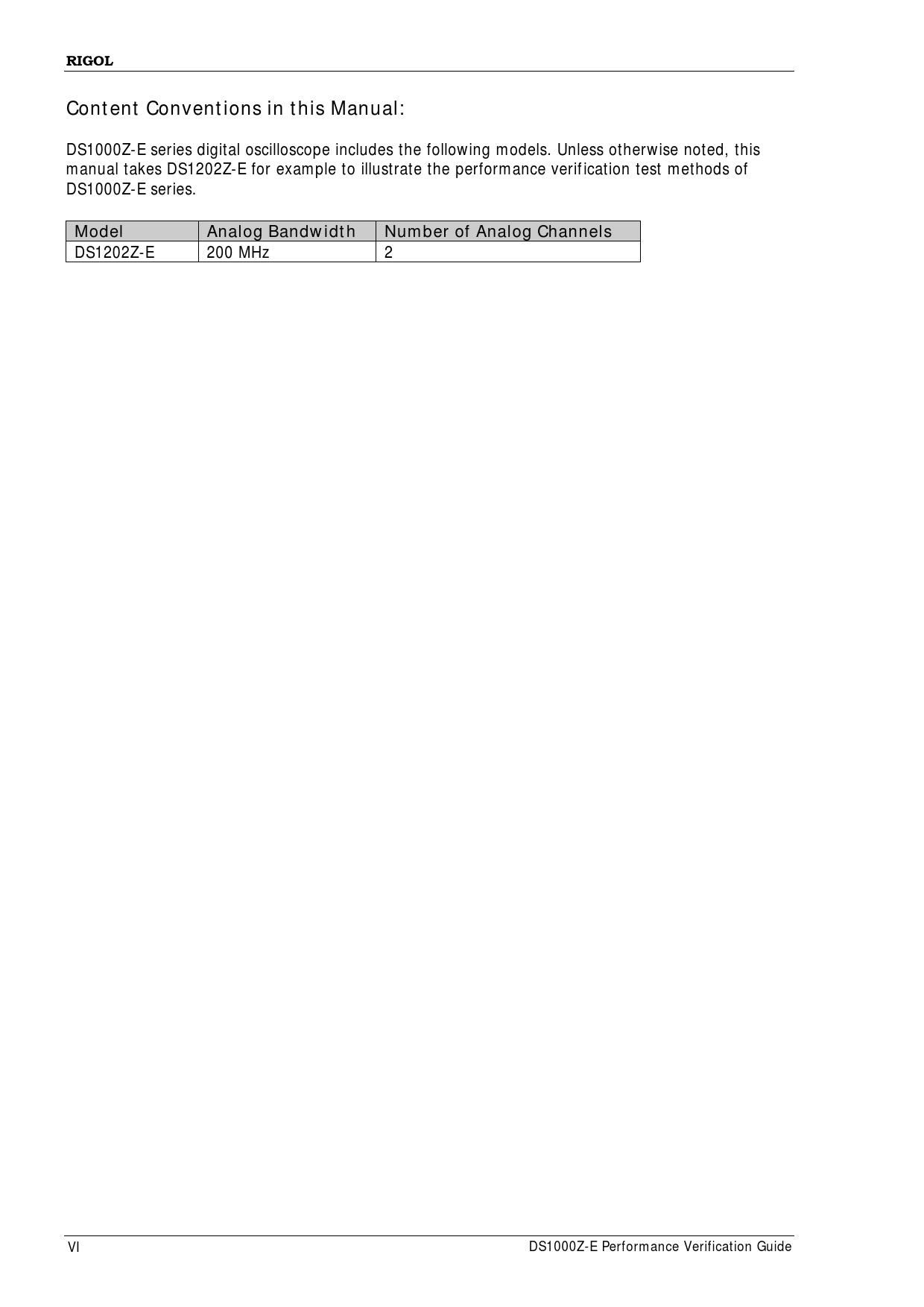 RIGOLContent Conventions in this Manual: DS1000Z-E series digital oscil oscope includes the fol owing models. Unless otherwise noted, this manual takes DS1202Z-E for example to il ustrate the performance verification test methods of DS1000Z-E series. ModelAnalog BandwidthNumber of Analog Channels DS1202Z-E 200 MHz 2 VI DS1000Z-E Performance Verification Guide Document Outline Guaranty and Declaration Safety Requirement General Safety Summary Safety Notices and Symbols Document Overview Overview Test Preparations Self-test Self-calibration Test Result Record Specifications Performance Verification Test Impedance Test Specification Test Connection Diagram Test Procedures Test Record Form DC Gain Accuracy Test Specification Test Connection Diagram Test Procedures Test Record Form Bandwidth Test Specification Test Connection Diagram Test Procedures Test Record Form Bandwidth Limit Test Specification Test Connection Diagram Test Procedures Test Record Form Time Base Accuracy Test Specification Test Connection Diagram Test Procedures Test Record Form Zero Point Offset Test Specification Test Connection Diagram Test Procedures Test Record Form Appendix Test Record Form