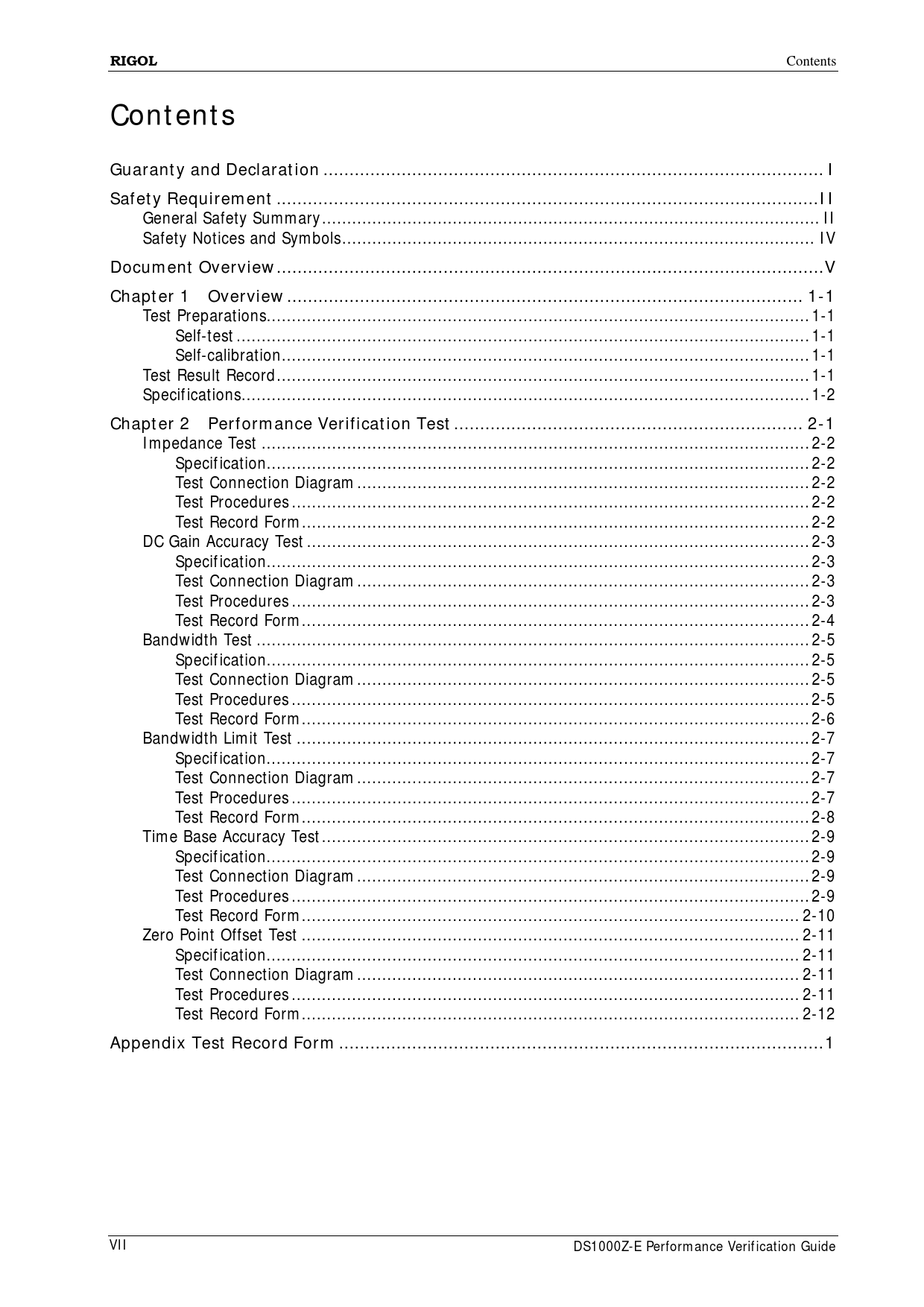 link to page 3 link to page 4 link to page 4 link to page 6 link to page 7 link to page 11 link to page 11 link to page 11 link to page 11 link to page 11 link to page 12 link to page 13 link to page 14 link to page 14 link to page 14 link to page 14 link to page 14 link to page 15 link to page 15 link to page 15 link to page 15 link to page 16 link to page 17 link to page 17 link to page 17 link to page 17 link to page 18 link to page 19 link to page 19 link to page 19 link to page 19 link to page 20 link to page 21 link to page 21 link to page 21 link to page 21 link to page 22 link to page 23 link to page 23 link to page 23 link to page 23 link to page 24 link to page 25 RIGOL Contents ContentsGuaranty and Declaration .. ISafety Requirement .. II General Safety Summary ... II Safety Notices and Symbols .. IV Document Overview ... VChapter 1Overview ... 1-1 Test Preparations .. 1-1 Self-test .. 1-1 Self-calibration ... 1-1 Test Result Record .. 1-1 Specifications ... 1-2 Chapter 2Performance Verification Test ... 2-1 Impedance Test ... 2-2 Specification .. 2-2 Test Connection Diagram .. 2-2 Test Procedures ... 2-2 Test Record Form ... 2-2 DC Gain Accuracy Test .. 2-3 Specification .. 2-3 Test Connection Diagram .. 2-3 Test Procedures ... 2-3 Test Record Form ... 2-4 Bandwidth Test .. 2-5 Specification .. 2-5 Test Connection Diagram .. 2-5 Test Procedures ... 2-5 Test Record Form ... 2-6 Bandwidth Limit Test .. 2-7 Specification .. 2-7 Test Connection Diagram .. 2-7 Test Procedures ... 2-7 Test Record Form ... 2-8 Time Base Accuracy Test ... 2-9 Specification .. 2-9 Test Connection Diagram .. 2-9 Test Procedures ... 2-9 Test Record Form ... 2-10 Zero Point Offset Test ... 2-11 Specification .. 2-11 Test Connection Diagram .. 2-11 Test Procedures ... 2-11 Test Record Form ... 2-12 Appendix Test Record Form ... 1 VII DS1000Z-E Performance Verification Guide Document Outline Guaranty and Declaration Safety Requirement General Safety Summary Safety Notices and Symbols Document Overview Overview Test Preparations Self-test Self-calibration Test Result Record Specifications Performance Verification Test Impedance Test Specification Test Connection Diagram Test Procedures Test Record Form DC Gain Accuracy Test Specification Test Connection Diagram Test Procedures Test Record Form Bandwidth Test Specification Test Connection Diagram Test Procedures Test Record Form Bandwidth Limit Test Specification Test Connection Diagram Test Procedures Test Record Form Time Base Accuracy Test Specification Test Connection Diagram Test Procedures Test Record Form Zero Point Offset Test Specification Test Connection Diagram Test Procedures Test Record Form Appendix Test Record Form