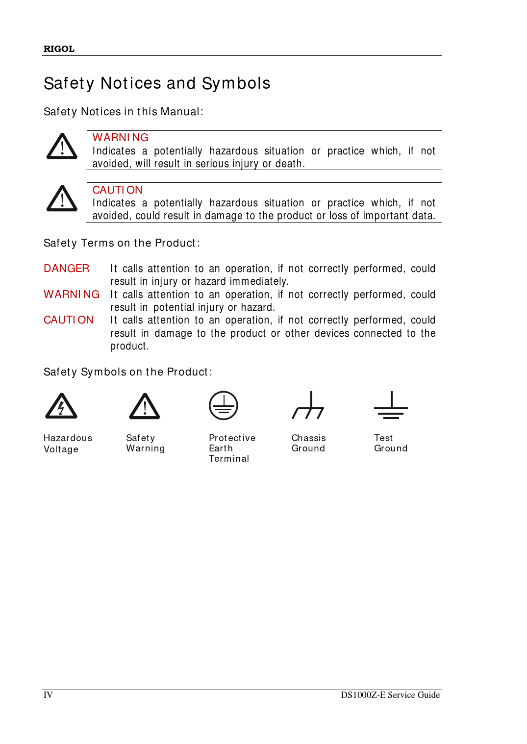 RIGOLSafety Notices and SymbolsSafety Notices in this Manual:WARNING Indicates a potential y hazardous situation or practice which, if not avoided, wil result in serious injury or death. CAUTION Indicates a potential y hazardous situation or practice which, if not avoided, could result in damage to the product or loss of important data. Safety Terms on the Product:DANGER It cal s attention to an operation, if not correctly performed, could result in injury or hazard immediately. WARNING It cal s attention to an operation, if not correctly performed, could result in potential injury or hazard. CAUTION It cal s attention to an operation, if not correctly performed, could result in damage to the product or other devices connected to the product. Safety Symbols on the Product:HazardousSafetyProtectiveChassisTestVoltageWarningEarthGroundGroundTerminal IV DS1000Z-E Service Guide Document Outline Guaranty and Declaration Safety Requirement General Safety Summary Safety Notices and Symbols Document Overview Disassembly and Assembly Notices to Disassembly and Assembly Exploded View Drawing Disassemble the Rear Panel Disassemble the Metal Rear Panel Disassemble the Knob Disassemble the Front Panel Disassemble the Keypad Board and LCD Disassemble the Main Board Assembly Procedures Troubleshooting&Maintenance Troubleshooting Maintenance System Maintenance Warranty Care and Cleaning Environmental Considerations
