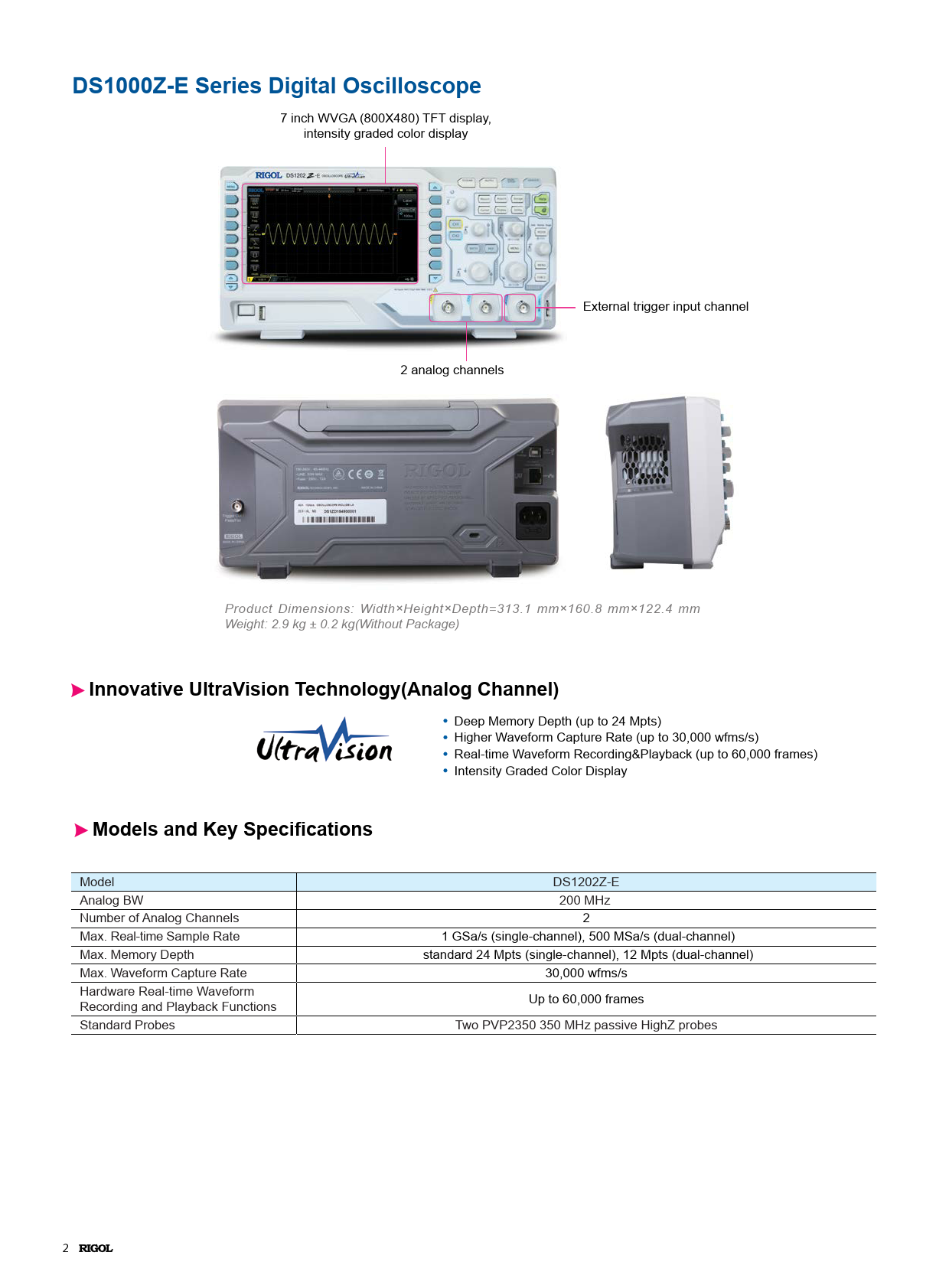 Model DS1202Z-E Analog BW 200 MHz Number of Analog Channels 2 Max. Real-time Sample Rate 1 GSa/s (single-channel), 500 MSa/s (dual-channel) Max. Memory Depth standard 24 Mpts (single-channel), 12 Mpts (dual-channel) Max. Waveform Capture Rate 30,000 wfms/s Hardware Real-time Waveform Recording and Playback Functions Up to 60,000 frames Standard Probes Two PVP2350 350 MHz passive HighZ probes 2