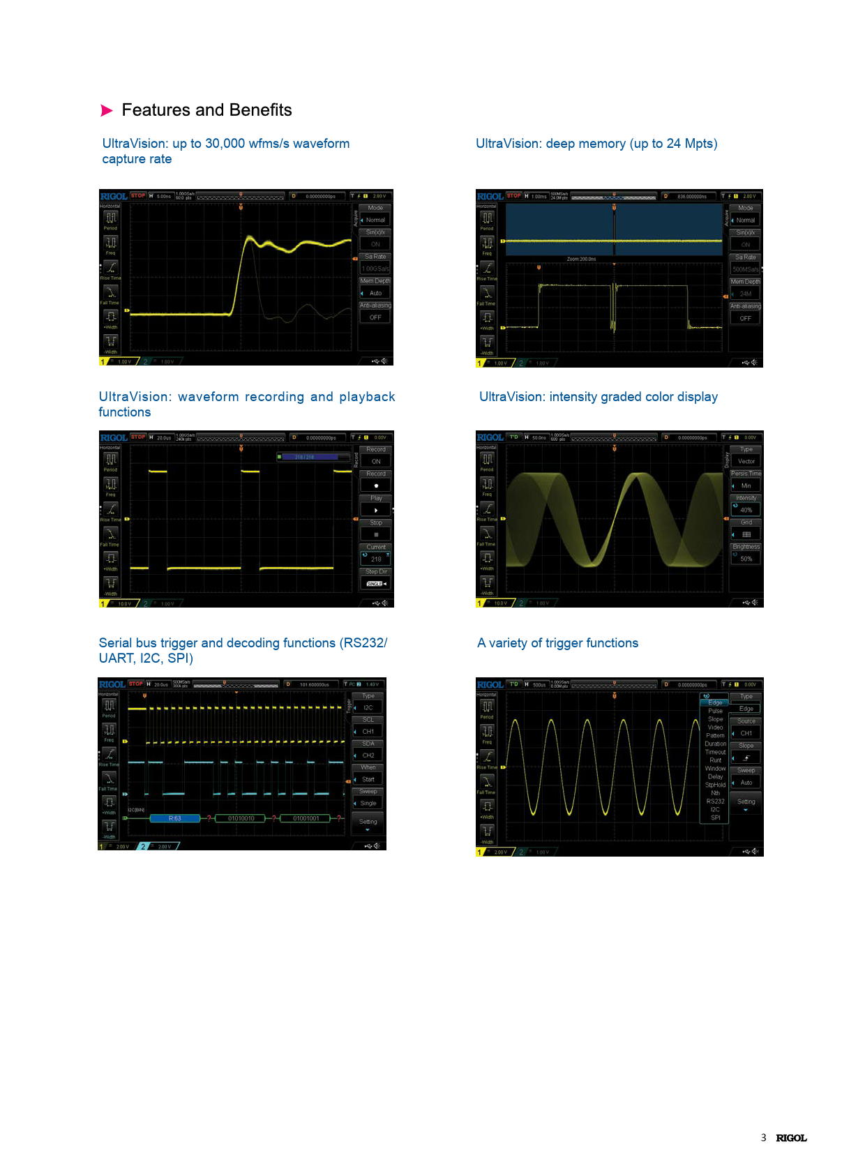 UltraVision: up to 30,000 wfms/s waveform UltraVision: deep memory (up to 24 Mpts) capture rate UltraVision: waveform recording and playback UltraVision: intensity graded color display functions Serial bus trigger and decoding functions (RS232/ A variety of trigger functions UART, I2C, SPI) 3