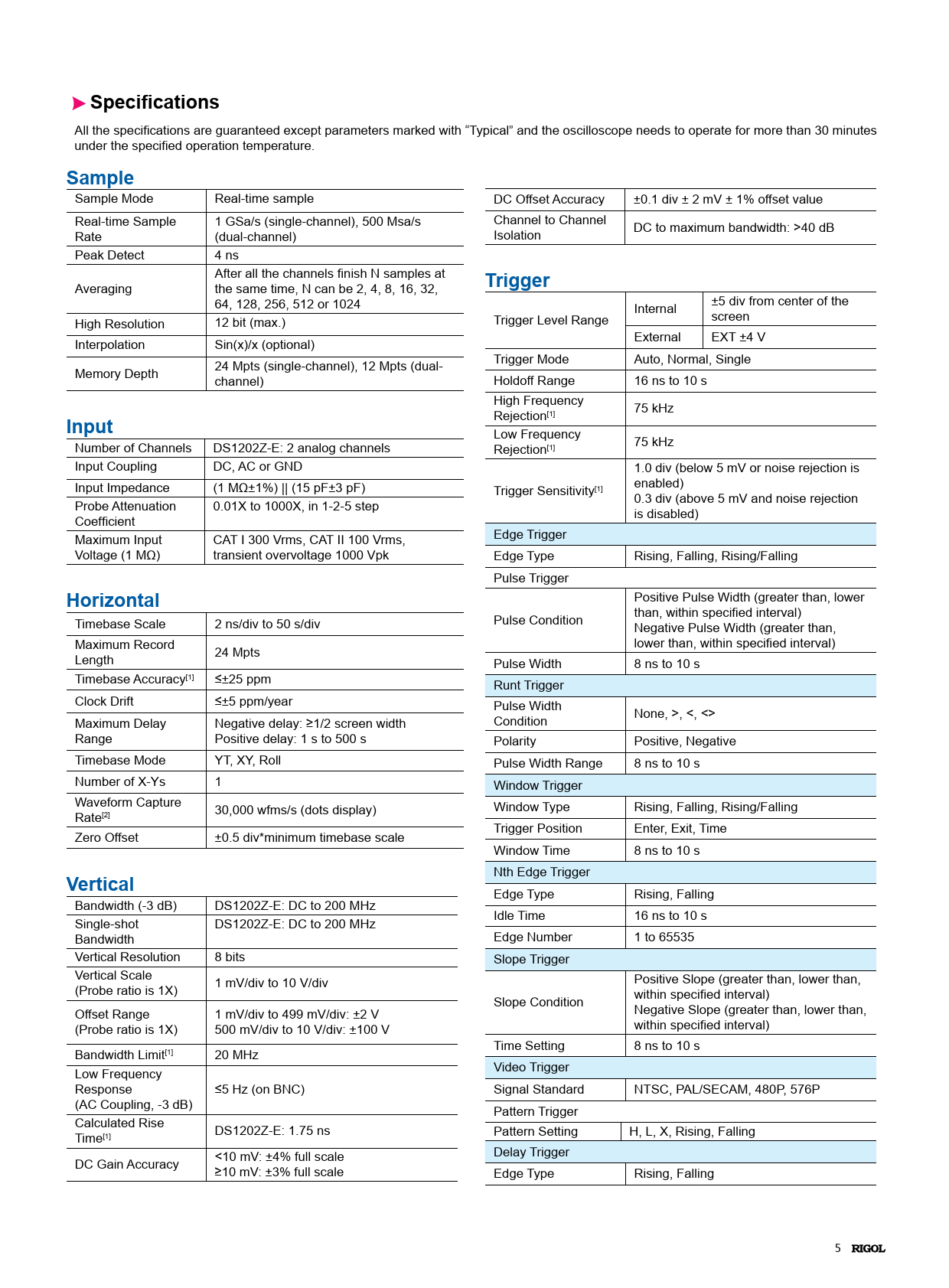 Specifications All the specifications are guaranteed except parameters marked with “Typical” and the oscilloscope needs to operate for more than 30 minutes under the specified operation temperature. Sample Sample Mode Real-time sample DC Offset Accuracy ±0.1 div ± 2 mV ± 1% offset value Real-time Sample 1 GSa/s (single-channel), 500 Msa/s Channel to Channel Rate (dual-channel) Isolation DC to maximum bandwidth: >40 dB Peak Detect 4 ns After all the channels finish N samples at Averaging the same time, N can be 2, 4, 8, 16, 32, Trigger 64, 128, 256, 512 or 1024 Internal ±5 div from center of the High Resolution 12 bit (max.) Trigger Level Range screen Interpolation Sin(x)/x (optional) External EXT ±4 V Trigger Mode Auto, Normal, Single Memory Depth 24 Mpts (single-channel), 12 Mpts (dual- channel) Holdoff Range 16 ns to 10 s High Frequency 75 kHz Input Rejection[1] Low Frequency Number of Channels DS1202Z-E: 2 analog channels Rejection 75 kHz [1] Input Coupling DC, AC or GND 1.0 div (below 5 mV or noise rejection is Input Impedance (1 MΩ±1%) || (15 pF±3 pF) Trigger Sensitivity enabled) [1] Probe Attenuation 0.01X to 1000X, in 1-2-5 step 0.3 div (above 5 mV and noise rejection Coefficient is disabled) Maximum Input CAT I 300 Vrms, CAT II 100 Vrms, Edge Trigger Voltage (1 MΩ) transient overvoltage 1000 Vpk Edge Type Rising, Falling, Rising/Falling Pulse Trigger Horizontal Positive Pulse Width (greater than, lower than, within specified interval) Timebase Scale 2 ns/div to 50 s/div Pulse Condition Negative Pulse Width (greater than, Maximum Record lower than, within specified interval) Length 24 Mpts Pulse Width 8 ns to 10 s Timebase Accuracy[1] ≤±25 ppm Runt Trigger Clock Drift ≤±5 ppm/year Pulse Width Maximum Delay Negative delay: ≥1/2 screen width Condition None, >, <, <> Range Positive delay: 1 s to 500 s Polarity Positive, Negative Timebase Mode YT, XY, Roll Pulse Width Range 8 ns to 10 s Number of X-Ys 1 Window Trigger Waveform Capture Window Type Rising, Falling, Rising/Falling Rate 30,000 wfms/s (dots display) [2] Trigger Position Enter, Exit, Time Zero Offset ±0.5 div*minimum timebase scale Window Time 8 ns to 10 s Vertical Nth Edge Trigger Edge Type Rising, Falling Bandwidth (-3 dB) DS1202Z-E: DC to 200 MHz Single-shot DS1202Z-E: DC to 200 MHz Idle Time 16 ns to 10 s Bandwidth Edge Number 1 to 65535 Vertical Resolution 8 bits Slope Trigger Vertical Scale Positive Slope (greater than, lower than, (Probe ratio is 1X) 1 mV/div to 10 V/div Slope Condition within specified interval) Offset Range 1 mV/div to 499 mV/div: ±2 V Negative Slope (greater than, lower than, (Probe ratio is 1X) 500 mV/div to 10 V/div: ±100 V within specified interval) Time Setting 8 ns to 10 s Bandwidth Limit[1] 20 MHz Low Frequency Video Trigger Response ≤5 Hz (on BNC) Signal Standard NTSC, PAL/SECAM, 480P, 576P (AC Coupling, -3 dB) Pattern Trigger Calculated Rise Time DS1202Z-E: 1.75 ns [1] Pattern Setting H, L, X, Rising, Falling Delay Trigger DC Gain Accuracy <10 mV: ±4% full scale ≥10 mV: ±3% full scale Edge Type Rising, Falling 5