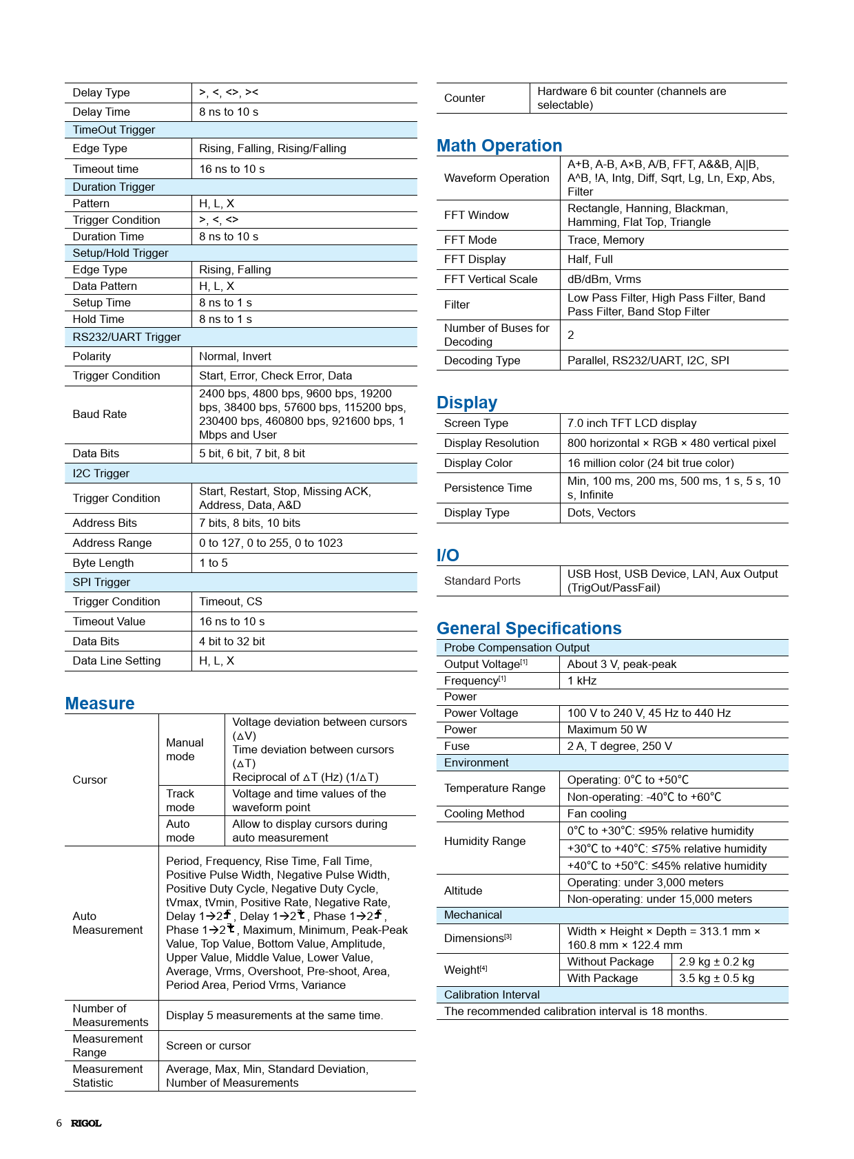 Delay Type >, <, <>, >< Counter Hardware 6 bit counter (channels are Delay Time 8 ns to 10 s selectable) TimeOut Trigger Edge Type Rising, Falling, Rising/Falling Math Operation Timeout time 16 ns to 10 s A+B, A-B, A×B, A/B, FFT, A&&B, A||B, Waveform Operation A^B, !A, Intg, Diff, Sqrt, Lg, Ln, Exp, Abs, Duration Trigger Filter Pattern H, L, X Trigger Condition >, <, <> FFT Window Rectangle, Hanning, Blackman, Hamming, Flat Top, Triangle Duration Time 8 ns to 10 s FFT Mode Trace, Memory Setup/Hold Trigger FFT Display Half, Full Edge Type Rising, Falling Data Pattern H, L, X FFT Vertical Scale dB/dBm, Vrms Setup Time 8 ns to 1 s Filter Low Pass Filter, High Pass Filter, Band Hold Time 8 ns to 1 s Pass Filter, Band Stop Filter Number of Buses for RS232/UART Trigger Decoding 2 Polarity Normal, Invert Decoding Type Parallel, RS232/UART, I2C, SPI Trigger Condition Start, Error, Check Error, Data 2400 bps, 4800 bps, 9600 bps, 19200 Display Baud Rate bps, 38400 bps, 57600 bps, 115200 bps, 230400 bps, 460800 bps, 921600 bps, 1 Screen Type 7.0 inch TFT LCD display Mbps and User Display Resolution 800 horizontal × RGB × 480 vertical pixel Data Bits 5 bit, 6 bit, 7 bit, 8 bit Display Color 16 million color (24 bit true color) I2C Trigger Persistence Time Min, 100 ms, 200 ms, 500 ms, 1 s, 5 s, 10 Trigger Condition Start, Restart, Stop, Missing ACK, s, Infinite Address, Data, A&D Display Type Dots, Vectors Address Bits 7 bits, 8 bits, 10 bits Address Range 0 to 127, 0 to 255, 0 to 1023 Byte Length 1 to 5 I/O SPI Trigger Standard Ports USB Host, USB Device, LAN, Aux Output (TrigOut/PassFail) Trigger Condition Timeout, CS Timeout Value 16 ns to 10 s General Specifications Data Bits 4 bit to 32 bit Probe Compensation Output Data Line Setting H, L, X Output Voltage[1] About 3 V, peak-peak Frequency[1] 1 kHz Measure Power Power Voltage 100 V to 240 V, 45 Hz to 440 Hz Voltage deviation between cursors Power Maximum 50 W Manual (△V) Fuse 2 A, T degree, 250 V mode Time deviation between cursors (△T) Environment Cursor Reciprocal of △T (Hz) (1/△T) Operating: 0℃ to +50℃ Track Voltage and time values of the Temperature Range Non-operating: -40℃ to +60℃ mode waveform point Cooling Method Fan cooling Auto Allow to display cursors during mode auto measurement 0℃ to +30℃: ≤95% relative humidity Humidity Range +30℃ to +40℃: ≤75% relative humidity Period, Frequency, Rise Time, Fall Time, +40℃ to +50℃: ≤45% relative humidity Positive Pulse Width, Negative Pulse Width, Positive Duty Cycle, Negative Duty Cycle, Operating: under 3,000 meters Altitude tVmax, tVmin, Positive Rate, Negative Rate, Non-operating: under 15,000 meters Auto Delay 12 , Delay 12 , Phase 12 , Mechanical Measurement Phase 12 , Maximum, Minimum, Peak-Peak Width × Height × Depth = 313.1 mm × Value, Top Value, Bottom Value, Amplitude, Dimensions[3] 160.8 mm × 122.4 mm Upper Value, Middle Value, Lower Value, Without Package 2.9 kg ± 0.2 kg Average, Vrms, Overshoot, Pre-shoot, Area, Weight[4] Period Area, Period Vrms, Variance With Package 3.5 kg ± 0.5 kg Calibration Interval Number of The recommended calibration interval is 18 months. Measurements Display 5 measurements at the same time. Measurement Range Screen or cursor Measurement Average, Max, Min, Standard Deviation, Statistic Number of Measurements 6