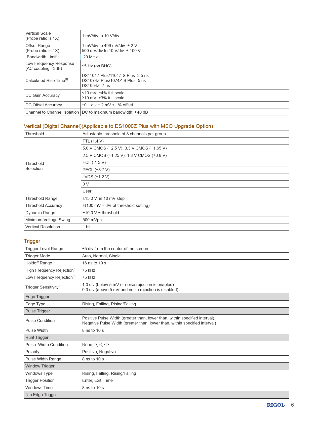 Vertical Scale (Probe ratio is 1X) 1 mV/div to 10 V/div Offset Range 1 mV/div to 499 mV/div: ± 2 V (Probe ratio is 1X) 500 mV/div to 10 V/div: ± 100 V Bandwidth Limit[1] 20 MHz Low Frequency Response (AC coupling, -3dB) ≤5 Hz (on BNC) DS1104Z Plus/1104Z-S Plus: 3.5 ns Calculated Rise Time[1] DS1074Z Plus/1074Z-S Plus: 5 ns DS1054Z: 7 ns DC Gain Accuracy <10 mV: ±4% full scale ≥10 mV: ±3% full scale DC Offset Accuracy ±0.1 div ± 2 mV ± 1% offset Channel to Channel Isolation DC to maximum bandwidth: >40 dB Vertical (Digital Channel)(Applicable to DS1000Z Plus with MSO Upgrade Option) Threshold Adjustable threshold of 8 channels per group TTL (1.4 V) 5.0 V CMOS (+2.5 V), 3.3 V CMOS (+1.65 V) 2.5 V CMOS (+1.25 V), 1.8 V CMOS (+0.9 V) Threshold ECL (-1.3 V) Selection PECL (+3.7 V) LVDS (+1.2 V) 0 V User Threshold Range ±15.0 V, in 10 mV step Threshold Accuracy ±(100 mV + 3% of threshold setting) Dynamic Range ±10.0 V + threshold Minimum Voltage Swing 500 mVpp Vertical Resolution 1 bit Trigger Trigger Level Range ±5 div from the center of the screen Trigger Mode Auto, Normal, Single Holdoff Range 16 ns to 10 s High Frequency Rejection[1] 75 kHz Low Frequency Rejection[1] 75 kHz Trigger Sensitivity[1] 1.0 div (below 5 mV or noise rejection is enabled) 0.3 div (above 5 mV and noise rejection is disabled) Edge Trigger Edge Type Rising, Falling, Rising/Falling Pulse Trigger Pulse Condition Positive Pulse Width (greater than, lower than, within specified interval) Negative Pulse Width (greater than, lower than, within specified interval) Pulse Width 8 ns to 10 s Runt Trigger Pulse Width Condition None, >, <, <> Polarity Positive, Negative Pulse Width Range 8 ns to 10 s Window Trigger Windows Type Rising, Falling, Rising/Falling Trigger Position Enter, Exit, Time Windows Time 8 ns to 10 s Nth Edge Trigger RIGOL 6