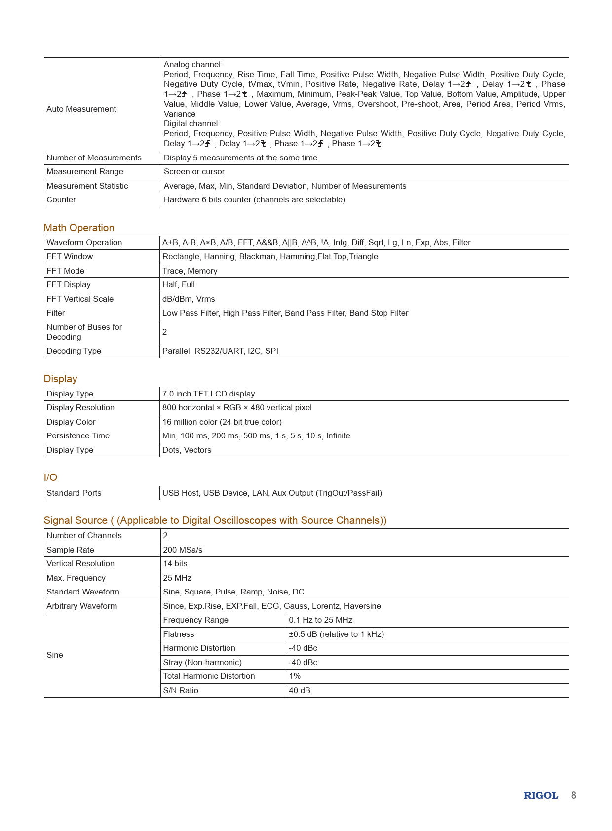 Analog channel: Period, Frequency, Rise Time, Fall Time, Positive Pulse Width, Negative Pulse Width, Positive Duty Cycle, Negative Duty Cycle, tVmax, tVmin, Positive Rate, Negative Rate, Delay 1→2 , Delay 1→2 , Phase 1→2 , Phase 1→2 , Maximum, Minimum, Peak-Peak Value, Top Value, Bottom Value, Amplitude, Upper Auto Measurement Value, Middle Value, Lower Value, Average, Vrms, Overshoot, Pre-shoot, Area, Period Area, Period Vrms, Variance Digital channel: Period, Frequency, Positive Pulse Width, Negative Pulse Width, Positive Duty Cycle, Negative Duty Cycle, Delay 1→2 , Delay 1→2 , Phase 1→2 , Phase 1→2 Number of Measurements Display 5 measurements at the same time Measurement Range Screen or cursor Measurement Statistic Average, Max, Min, Standard Deviation, Number of Measurements Counter Hardware 6 bits counter (channels are selectable) Math Operation Waveform Operation A+B, A-B, A×B, A/B, FFT, A&&B, A||B, A^B, !A, Intg, Diff, Sqrt, Lg, Ln, Exp, Abs, Filter FFT Window Rectangle, Hanning, Blackman, Hamming,Flat Top,Triangle FFT Mode Trace, Memory FFT Display Half, Full FFT Vertical Scale dB/dBm, Vrms Filter Low Pass Filter, High Pass Filter, Band Pass Filter, Band Stop Filter Number of Buses for Decoding 2 Decoding Type Parallel, RS232/UART, I2C, SPI Display Display Type 7.0 inch TFT LCD display Display Resolution 800 horizontal × RGB × 480 vertical pixel Display Color 16 million color (24 bit true color) Persistence Time Min, 100 ms, 200 ms, 500 ms, 1 s, 5 s, 10 s, Infinite Display Type Dots, Vectors I/O Standard Ports USB Host, USB Device, LAN, Aux Output (TrigOut/PassFail) Signal Source ( (Applicable to Digital Oscilloscopes with Source Channels)) Number of Channels 2 Sample Rate 200 MSa/s Vertical Resolution 14 bits Max. Frequency 25 MHz Standard Waveform Sine, Square, Pulse, Ramp, Noise, DC Arbitrary Waveform Since, Exp.Rise, EXP.Fall, ECG, Gauss, Lorentz, Haversine Frequency Range 0.1 Hz to 25 MHz Flatness ±0.5 dB (relative to 1 kHz) Harmonic Distortion -40 dBc Sine Stray (Non-harmonic) -40 dBc Total Harmonic Distortion 1% S/N Ratio 40 dB