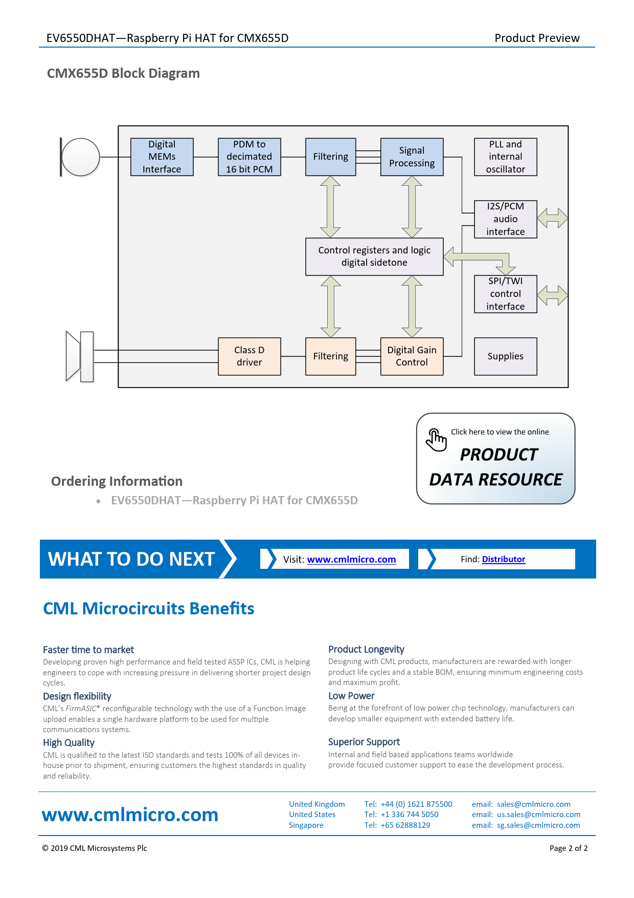 United States Tel: +1 336 744 5050 email: us.sales@cmlmicro.com Singapore Tel: +65 62888129 email: sg.sales@cmlmicro.com © 2019 CML Microsystems Plc Page 2 of 2
