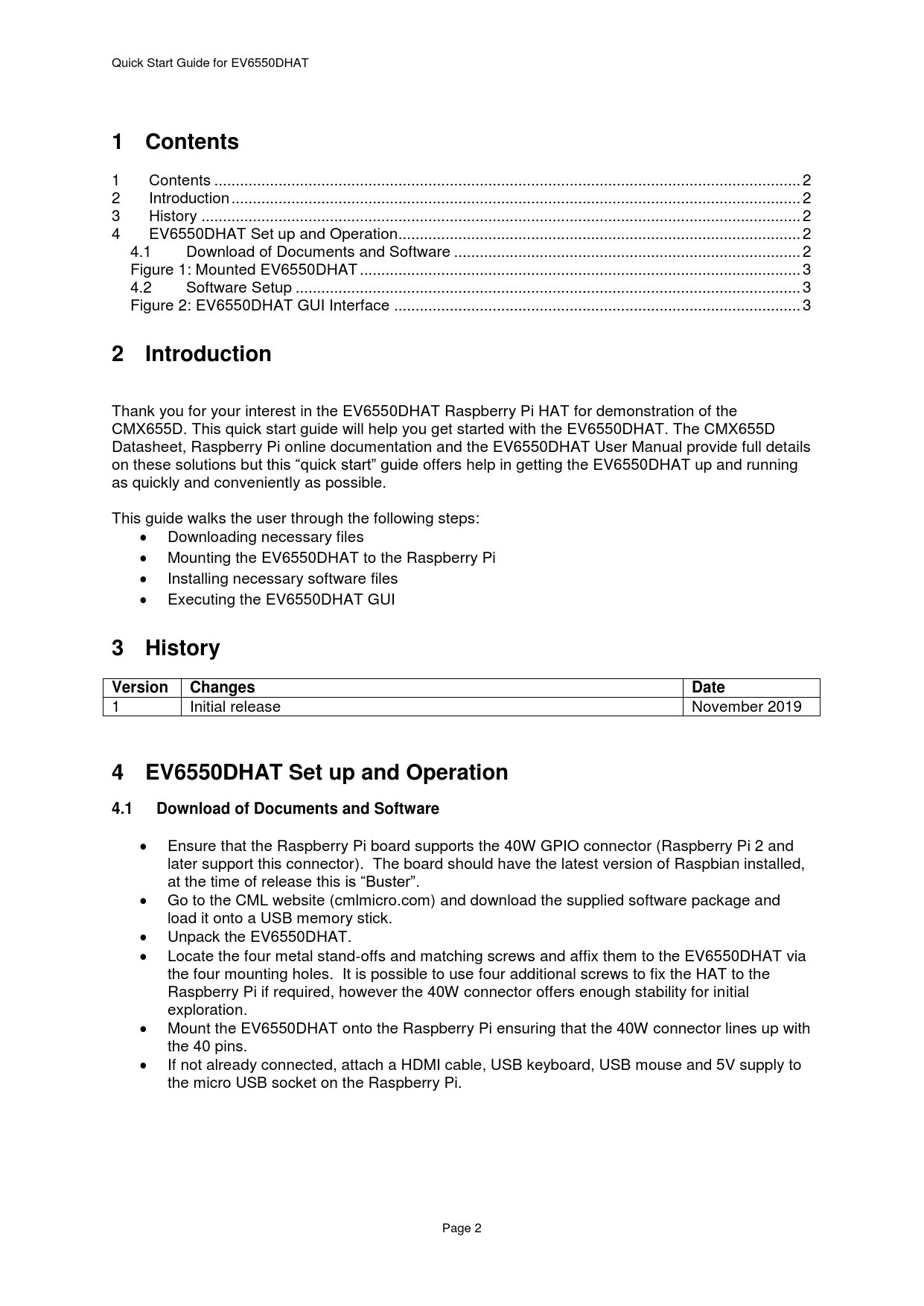 link to page 2 link to page 2 link to page 2 link to page 2 link to page 2 link to page 3 link to page 3 link to page 3 Quick Start Guide for EV6550DHAT 1 Contents 1 Contents ... 2 2 Introduction ... 2 3 History .. 2 4 EV6550DHAT Set up and Operation.. 2 4.1 Download of Documents and Software ... 2 Figure 1: Mounted EV6550DHAT ... 3 4.2 Software Setup .. 3 Figure 2: EV6550DHAT GUI Interface ... 3 2 Introduction Thank you for your interest in the EV6550DHAT Raspberry Pi HAT for demonstration of the CMX655D. This quick start guide will help you get started with the EV6550DHAT. The CMX655D Datasheet, Raspberry Pi online documentation and the EV6550DHAT User Manual provide full details on these solutions but this “quick start” guide offers help in getting the EV6550DHAT up and running as quickly and conveniently as possible. This guide walks the user through the following steps: Downloading necessary files Mounting the EV6550DHAT to the Raspberry Pi Installing necessary software files Executing the EV6550DHAT GUI 3 HistoryVersionChangesDate 1 Initial release November 2019 4 EV6550DHAT Set up and Operation4.1Download of Documents and Software Ensure that the Raspberry Pi board supports the 40W GPIO connector (Raspberry Pi 2 and later support this connector). The board should have the latest version of Raspbian installed, at the time of release this is “Buster”. Go to the CML website (cmlmicro.com) and download the supplied software package and load it onto a USB memory stick. Unpack the EV6550DHAT. Locate the four metal stand-offs and matching screws and affix them to the EV6550DHAT via the four mounting holes. It is possible to use four additional screws to fix the HAT to the Raspberry Pi if required, however the 40W connector offers enough stability for initial exploration. Mount the EV6550DHAT onto the Raspberry Pi ensuring that the 40W connector lines up with the 40 pins. If not already connected, attach a HDMI cable, USB keyboard, USB mouse and 5V supply to the micro USB socket on the Raspberry Pi. Page 2 Document Outline 1 Contents 2 Introduction 3 History 4 EV6550DHAT Set up and Operation 4.1 Download of Documents and Software Figure 1: Mounted EV6550DHAT 4.2 Software Setup Figure 2: EV6550DHAT GUI Interface