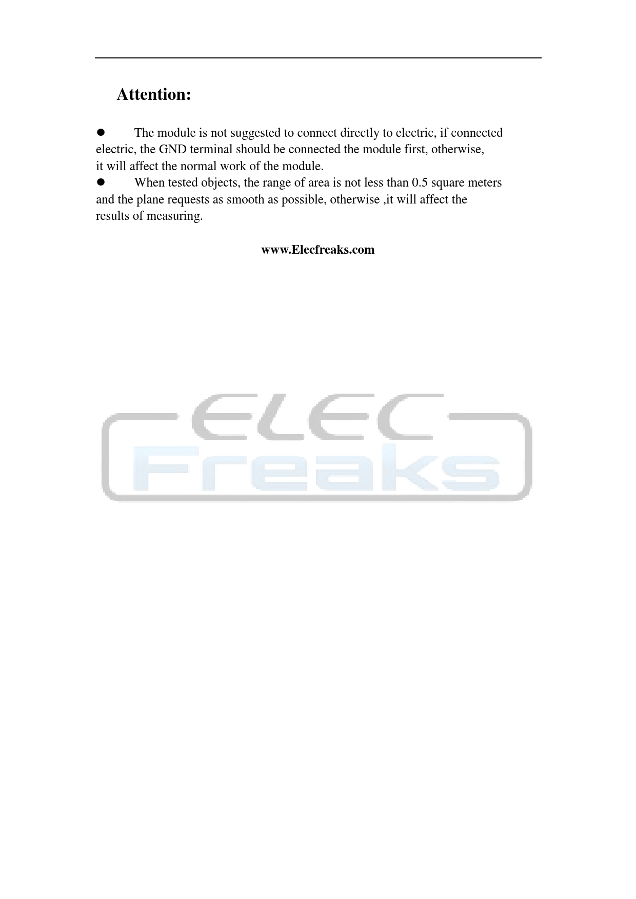 Attention: The module is not suggested to connect directly to electric, if connected electric, the GND terminal should be connected the module first, otherwise, it will affect the normal work of the module. When tested objects, the range of area is not less than 0.5 square meters and the plane requests as smooth as possible, otherwise ,it will affect the results of measuring. www.Elecfreaks.com