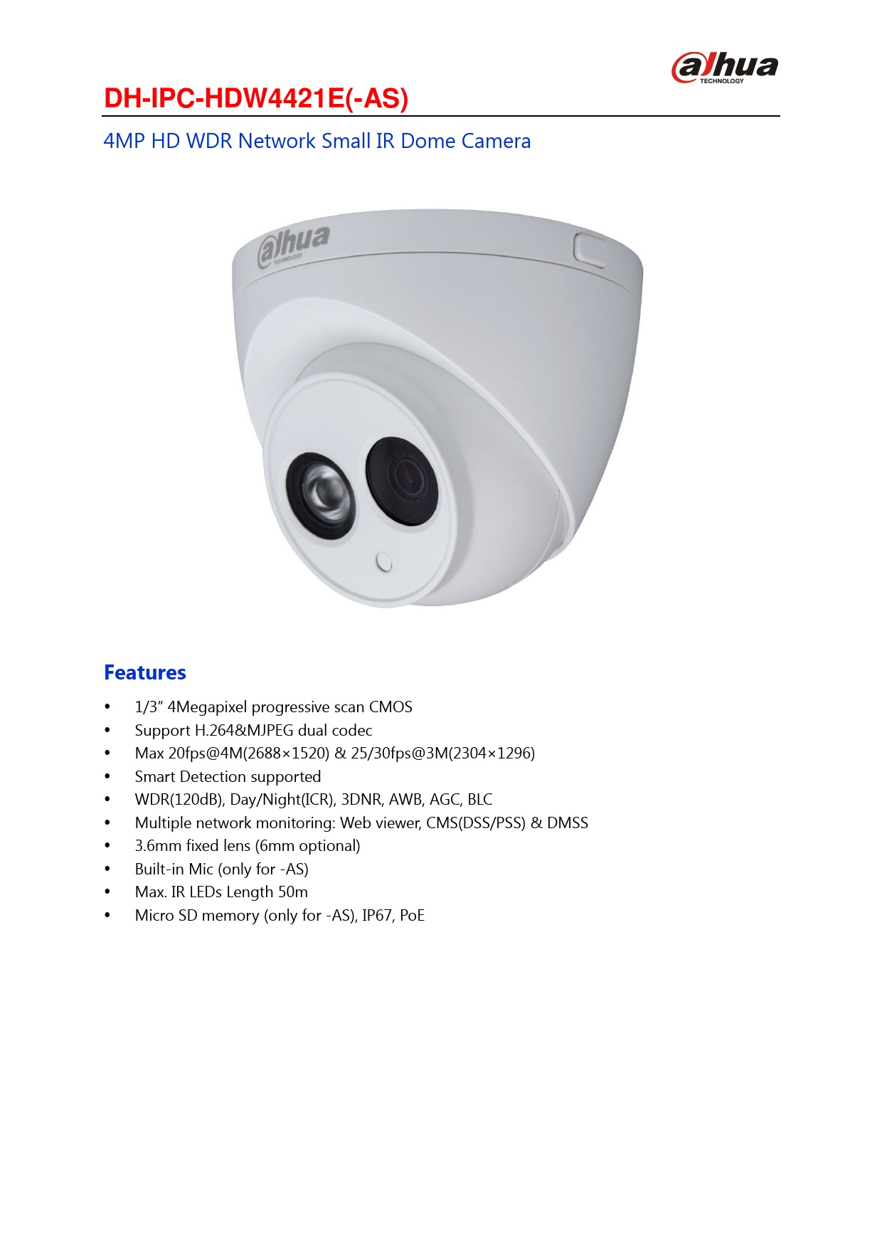 1/3” 4Megapixel progressive scan CMOS Support H.264&MJPEG dual codec Max 20fps@4M(2688× 1520) & 25/30fps@3M(2304× 1296) Smart Detection supported WDR(120dB), Day/Night(ICR), 3DNR, AWB, AGC, BLC Multiple network monitoring: Web viewer, CMS(DSS/PSS) & DMSS 3.6mm fixed lens (6mm optional) Built-in Mic (only for -AS) Max. IR LEDs Length 50m Micro SD memory (only for -AS), IP67, PoE