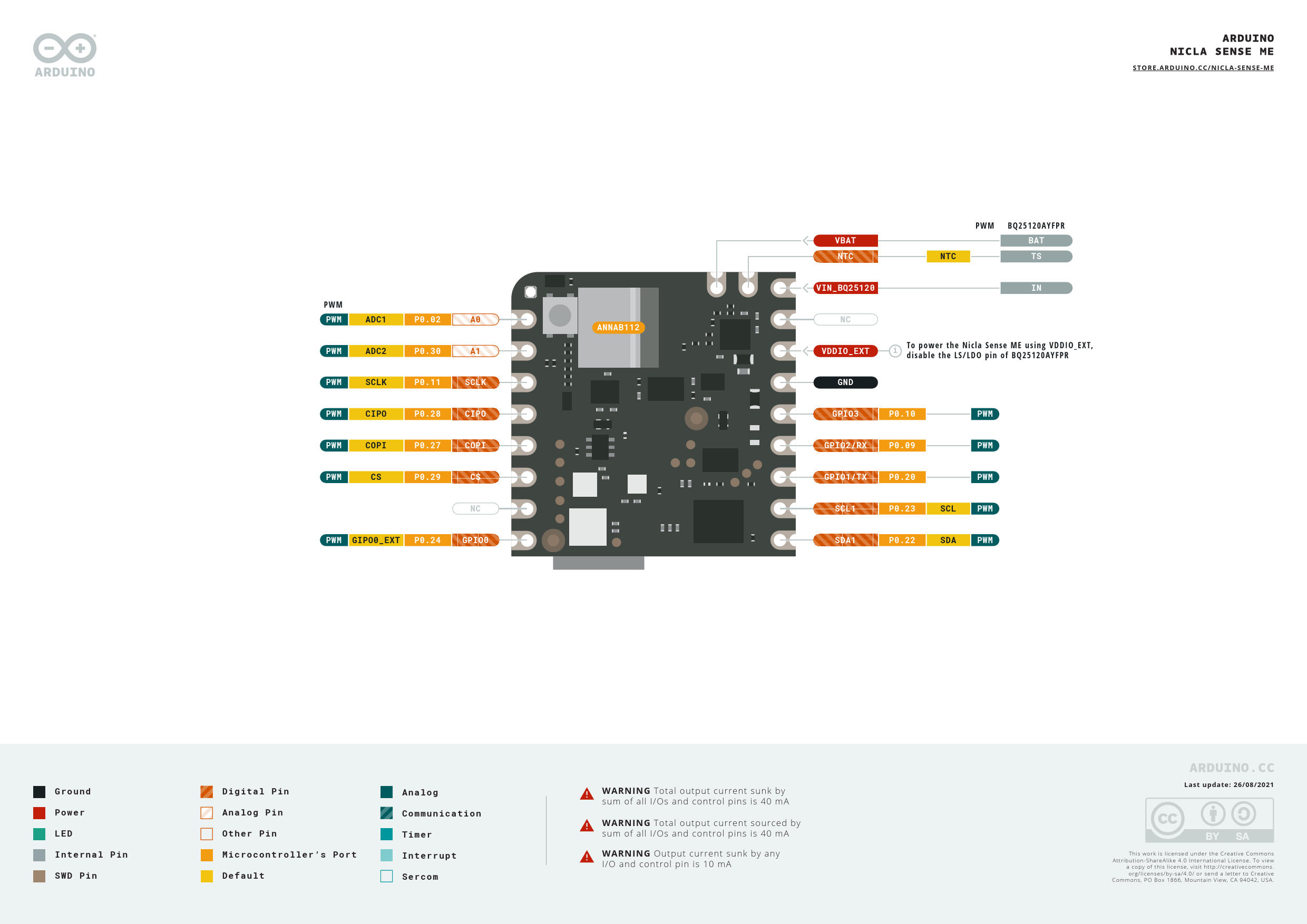 STORE.ARDUINO.CC/NICLA-SENSE-MEPWMBQ25120AYFPRVBATBATNTCNTCTSVIN_BQ25120INPWMPWMADC1P0.02A0NCANNAB112To power the Nicla Sense ME using VDDIO_EXT,PWMADC2P0.30A1VDDIO_EXTi disable the LS/LDO pin of BQ25120AYFPRPWMSCLKP0.11SCLKGNDPWMCIPOP0.28CIPOGPIO3P0.10PWMPWMCOPIP0.27COPIGPIO2/RXP0.09PWMPWMCSP0.29CSGPIO1/TXP0.20PWMNCSCL1P0.23SCLPWMPWM GIPO0_EXTP0.24GPIO0SDA1P0.22SDAPWMLast update: 26/08/2021GroundDigital PinAnalogWARNING Total output current sunk by sum of all I/Os and control pins is 40 mA PowerAnalog PinCommunicationWARNING Total output current sourced by LEDOther PinTimer sum of all I/Os and control pins is 40 mA InterruptWARNING Output current sunk by any This work is licensed under the Creative Commons Internal PinMicrocontroller’s Port Attribution-ShareAlike 4.0 International License. To view I/O and control pin is 10 mA a copy of this license, visit http://creativecommons. org/licenses/by-sa/4.0/ or send a letter to Creative SWD PinDefaultSercom Commons, PO Box 1866, Mountain View, CA 94042, USA.