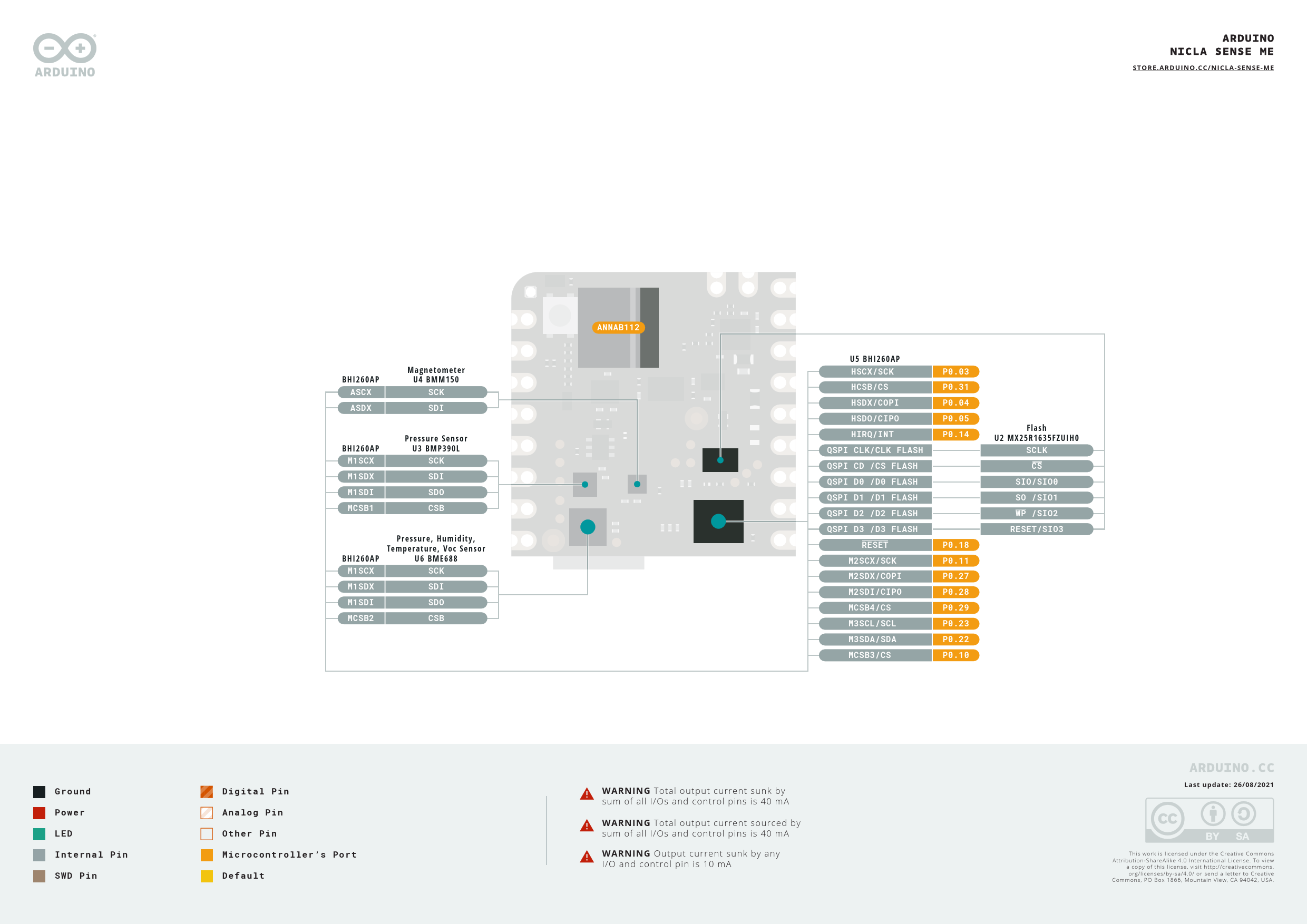 STORE.ARDUINO.CC/NICLA-SENSE-MEANNAB112U5 BHI260APMagnetometerHSCX/SCKP0.03BHI260APU4 BMM150ASCXSCKHCSB/CSP0.31ASDXSDIHSDX/COPIP0.04HSDO/CIPOP0.05FlashPressure SensorHIRQ/INTP0.14U2 MX25R1635FZUIH0BHI260APU3 BMP390LQSPI CLK/CLK FLASHSCLKM1SCXSCKQSPI CD /CS FLASHCSM1SDXSDIQSPI D0 /D0 FLASHSIO/SIO0M1SDISDOQSPI D1 /D1 FLASHSO /SIO1MCSB1CSBQSPI D2 /D2 FLASHWP /SIO2QSPI D3 /D3 FLASHRESET/SIO3Pressure, Humidity,Temperature, Voc SensorRESETP0.18BHI260APU6 BME688M2SCX/SCKP0.11M1SCXSCKM2SDX/COPIP0.27M1SDXSDIM2SDI/CIPOP0.28M1SDISDOMCSB4/CSP0.29MCSB2CSBM3SCL/SCLP0.23M3SDA/SDAP0.22MCSB3/CSP0.10Last update: 26/08/2021GroundDigital PinWARNING Total output current sunk by sum of all I/Os and control pins is 40 mA PowerAnalog PinWARNING Total output current sourced by LEDOther Pin sum of all I/Os and control pins is 40 mA WARNING Output current sunk by any This work is licensed under the Creative Commons Internal PinMicrocontroller’s Port Attribution-ShareAlike 4.0 International License. To view I/O and control pin is 10 mA a copy of this license, visit http://creativecommons. org/licenses/by-sa/4.0/ or send a letter to Creative SWD PinDefault Commons, PO Box 1866, Mountain View, CA 94042, USA.