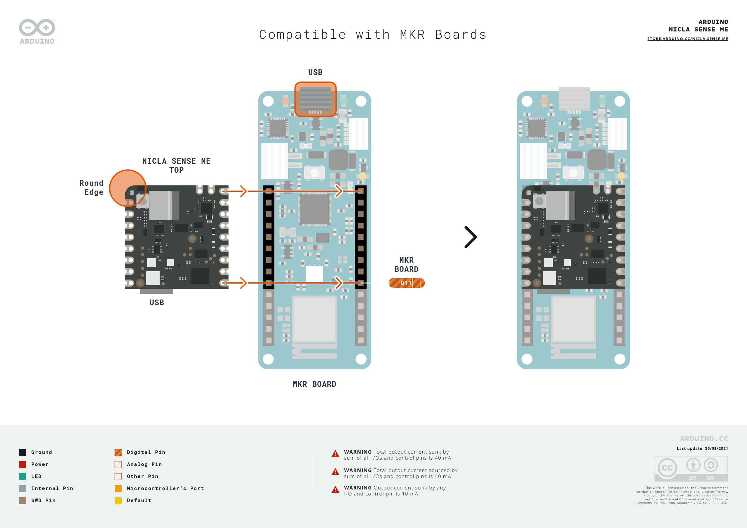 Compatible with MKR Boards STORE.ARDUINO.CC/NICLA-SENSE-MEUSBNICLA SENSE METOPRoundEdgeMKRBOARDD11USBMKR BOARDLast update: 26/08/2021GroundDigital PinWARNING Total output current sunk by sum of all I/Os and control pins is 40 mA PowerAnalog PinWARNING Total output current sourced by LEDOther Pin sum of all I/Os and control pins is 40 mA WARNING Output current sunk by any This work is licensed under the Creative Commons Internal PinMicrocontroller’s Port Attribution-ShareAlike 4.0 International License. To view I/O and control pin is 10 mA a copy of this license, visit http://creativecommons. org/licenses/by-sa/4.0/ or send a letter to Creative SWD PinDefault Commons, PO Box 1866, Mountain View, CA 94042, USA.