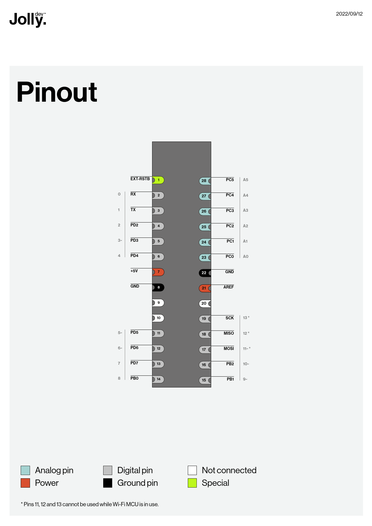 2022/09/12 Pinout EXT-RSTB 1 28 PC5 A5 0 RX 2 27 PC4 A4 1 TX 3 26 PC3 A3 2 PD2 4 25 PC2 A2 3~ PD3 5 24 PC1 A1 4 PD4 6 23 PC0 A0 +5V 7 22 GND GND 8 21 AREF 9 20 10 19 SCK 13 * 5~ PD5 11 18 MISO 12 * 6~ PD6 12 17 MOSI 11~ * 7 PD7 13 16 PB2 10~ 8 PB0 14 15 PB1 9~ Analog pin Digital pin Not connected Power Ground pin Special * Pins 11, 12 and 13 cannot be used while Wi-Fi MCU is in use.