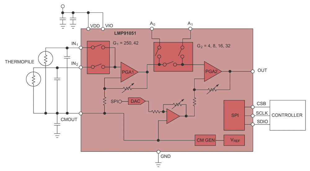 Thermopiles used as IR detectors in NDIR systems produce a voltage based on the amount of incident light they receive in Watts. The measured gas type, its absorption coefficient, and the gas concentration range all impact the amount of incident light on the thermopile detector. This results in thermopile output voltages, typically in the range of tens of µV. Therefore, you need to design supporting electronics with the ability to amplify the thermopile output voltage with different gains. This can be handled by an analog front-end (AFE) with a built-in PGA. Gain settings in the range of hundreds-to-thousands of V/V are required to amplify the small thermopile signal to the system’s full scale analog-to-digital converter (ADC), and achieve maximum system accuracy.