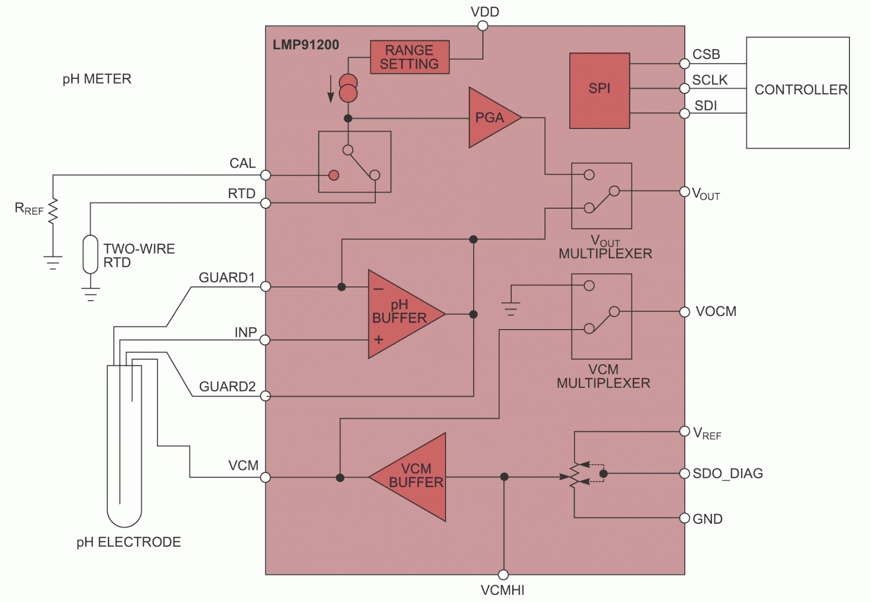In the end, pH sensors require a high-impedance, low-input bias current interface, common-mode voltage, and temperature compensation ability. The LMP91200 sensor AFE for chemical sensing addresses these functions (Figure 7). You can interface easily with RTDs with its programmable current source. Temperature measurement accuracy is further enhanced with the multi-step temperature measurement feature, which removes error in the temperature signal path. The device’s input bias current is in the range of only tens of fA at 25°C, minimizing error when connecting to a high-impedance pH electrode. Finally, the bias current is just hundreds of fA when the device is powered off, minimizing electrode degradation due to current draw over time.