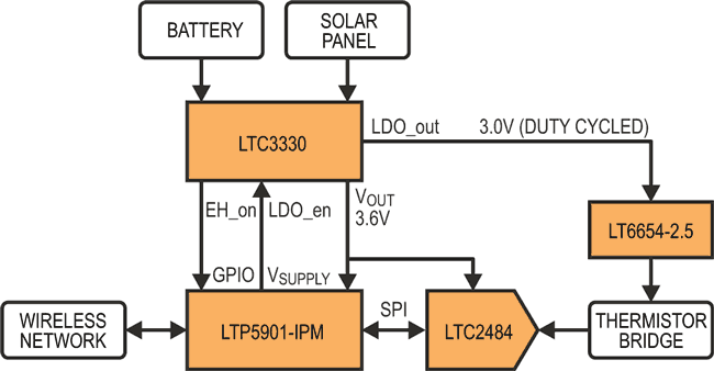 In this example, the microprocessor inside the LTP5901 manages the power sequencing to the temperature sensor by turning the LDO of the LTC3330 on and off at the correct times, so as to conserve power between temperature readings. The LTP5901 communicates directly to the SPI port of the 24-bit ADC which reads the temperature sensor.